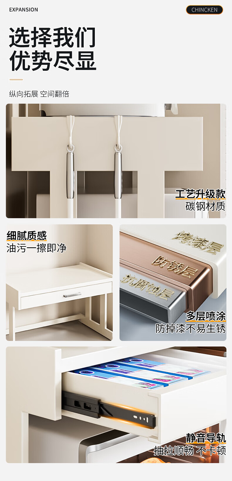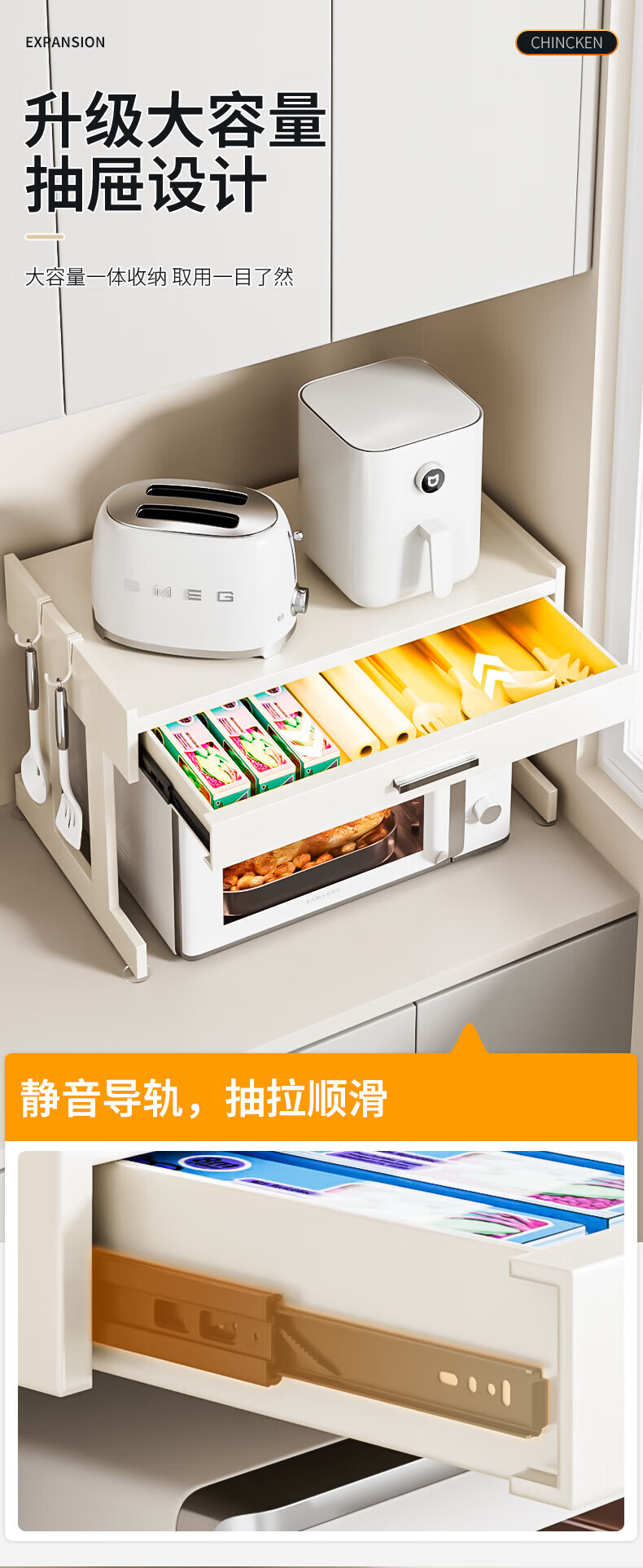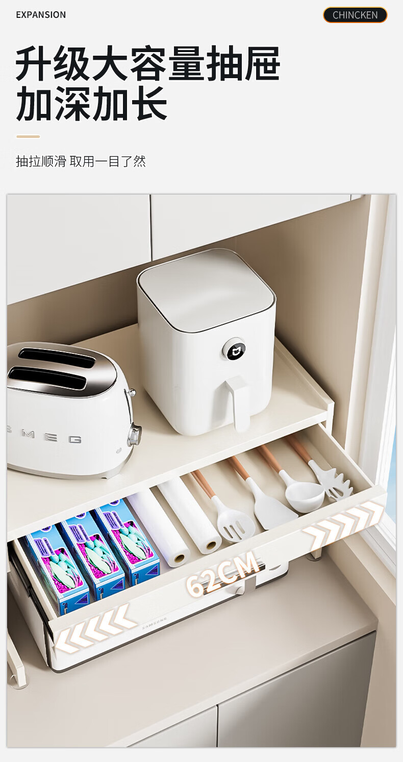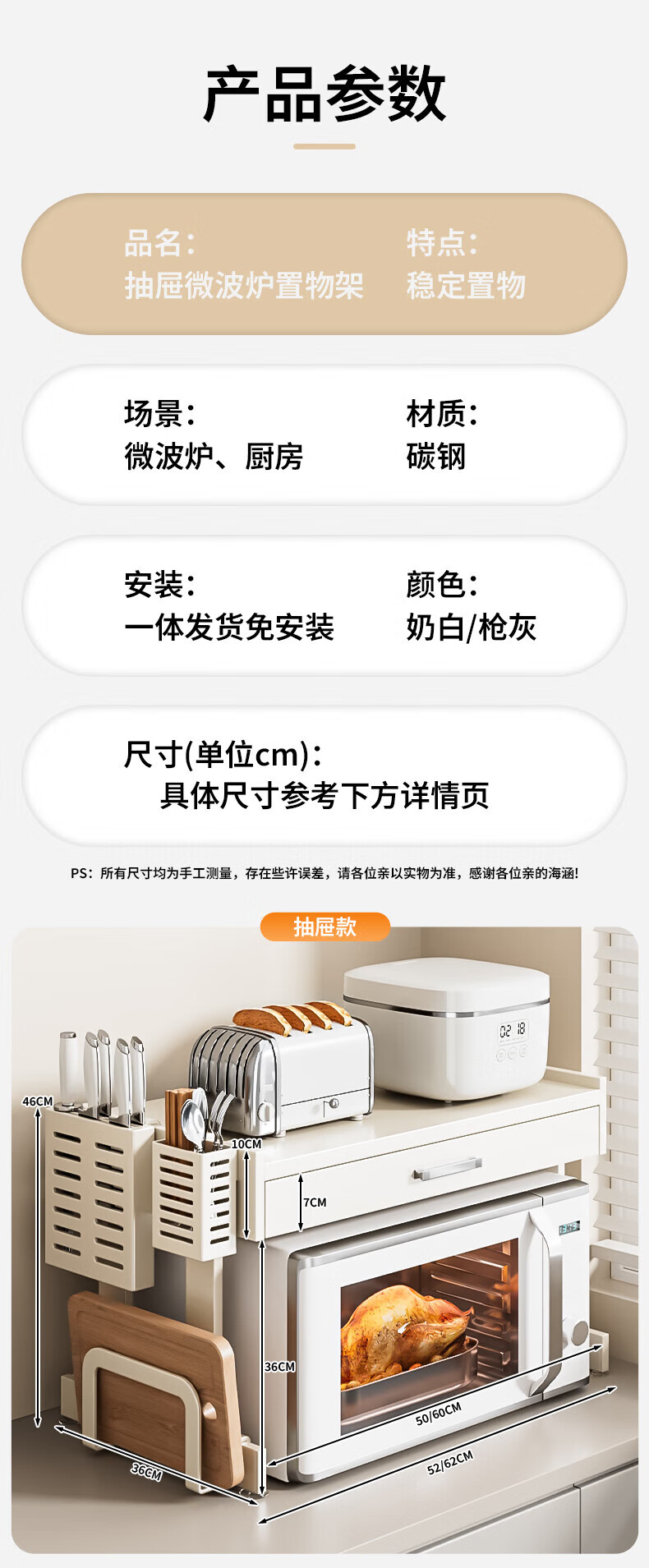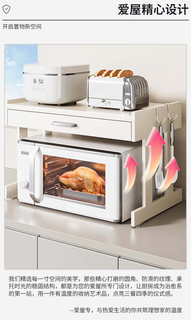 Youxi ins cream style kitchen microwave oven storage rack countertop multi-function rice cooker storage rack kitchen utensils cream white 52cm simple style + hook