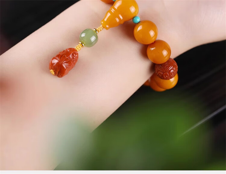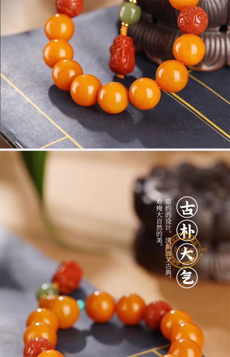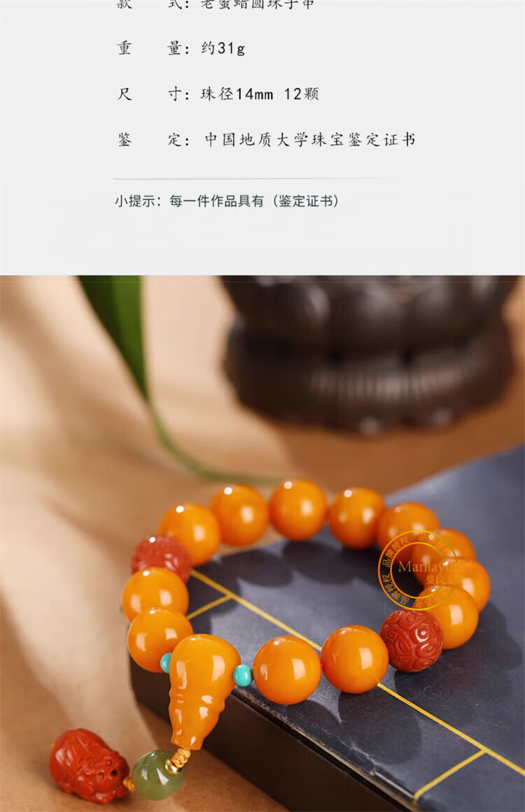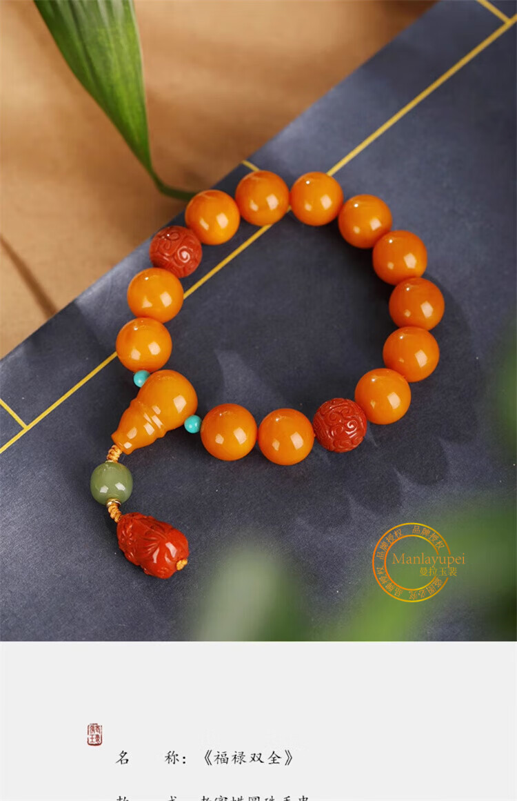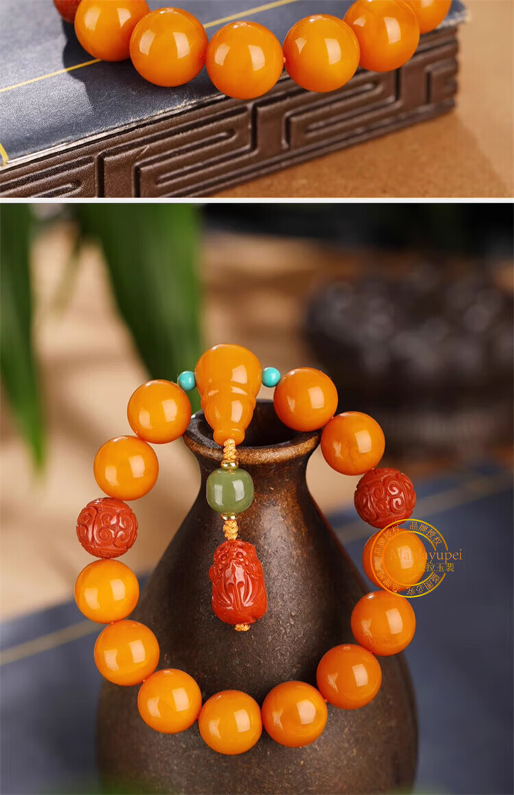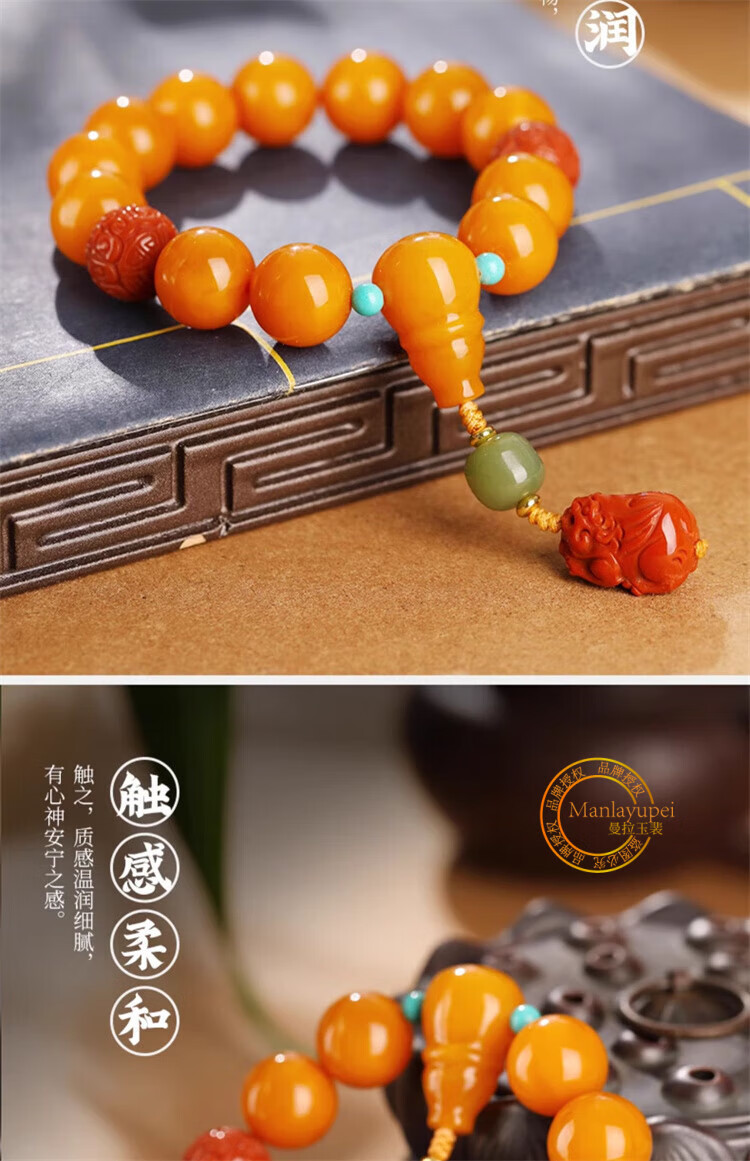 Manla Yupei Fulu Shuangquan Beeswax Bracelet Women's Chicken Fat Yellow Amber Gourd Old Honey Bracelet Round Beads 14mm Style 1