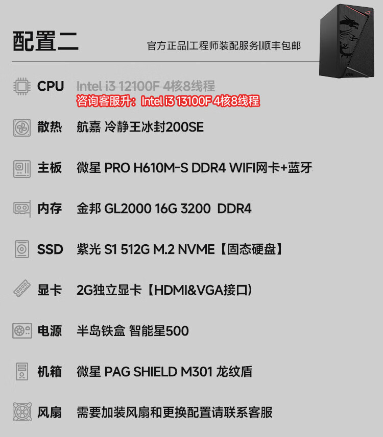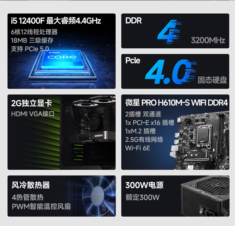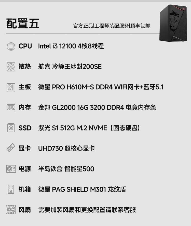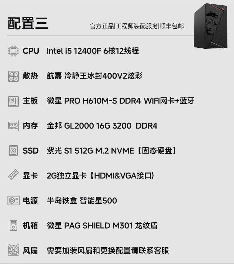 MSI (MSI) MSI Core i3 12100F 13100F/i5 12400F independent graphics card barebone desktop assembly computer commercial office home entertainment DIY computer host i5 12400F丨2G independent display丨512G solid state丨Configuration three
