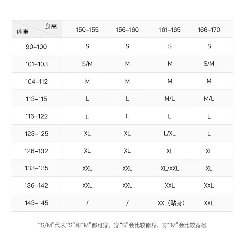 China (cm) 160-165/84-86 165-170 / 88-90 167-172 / 92-96 168-173 / 98-102 170-176 / 106-110