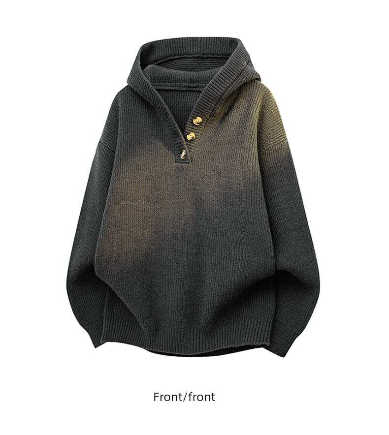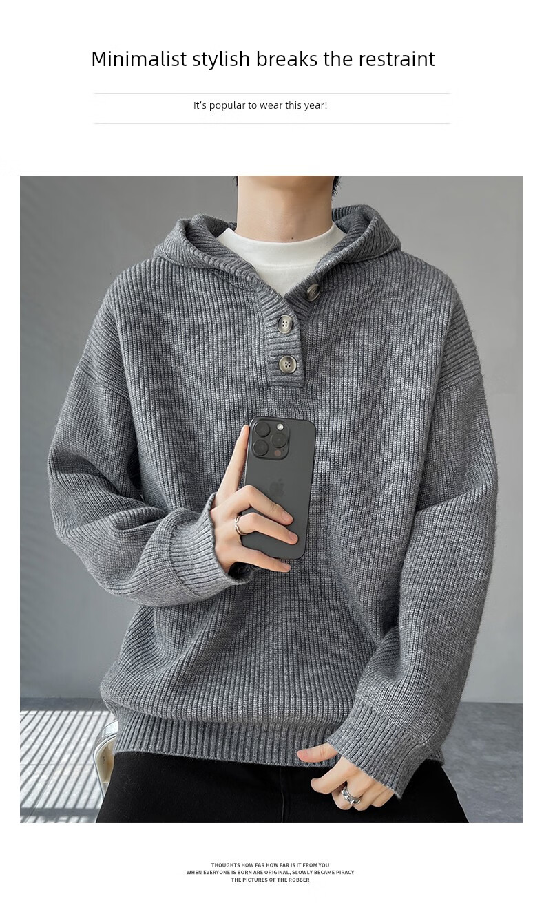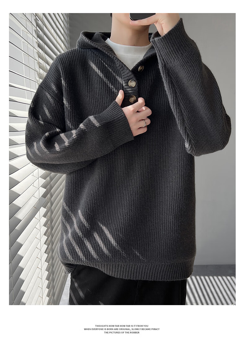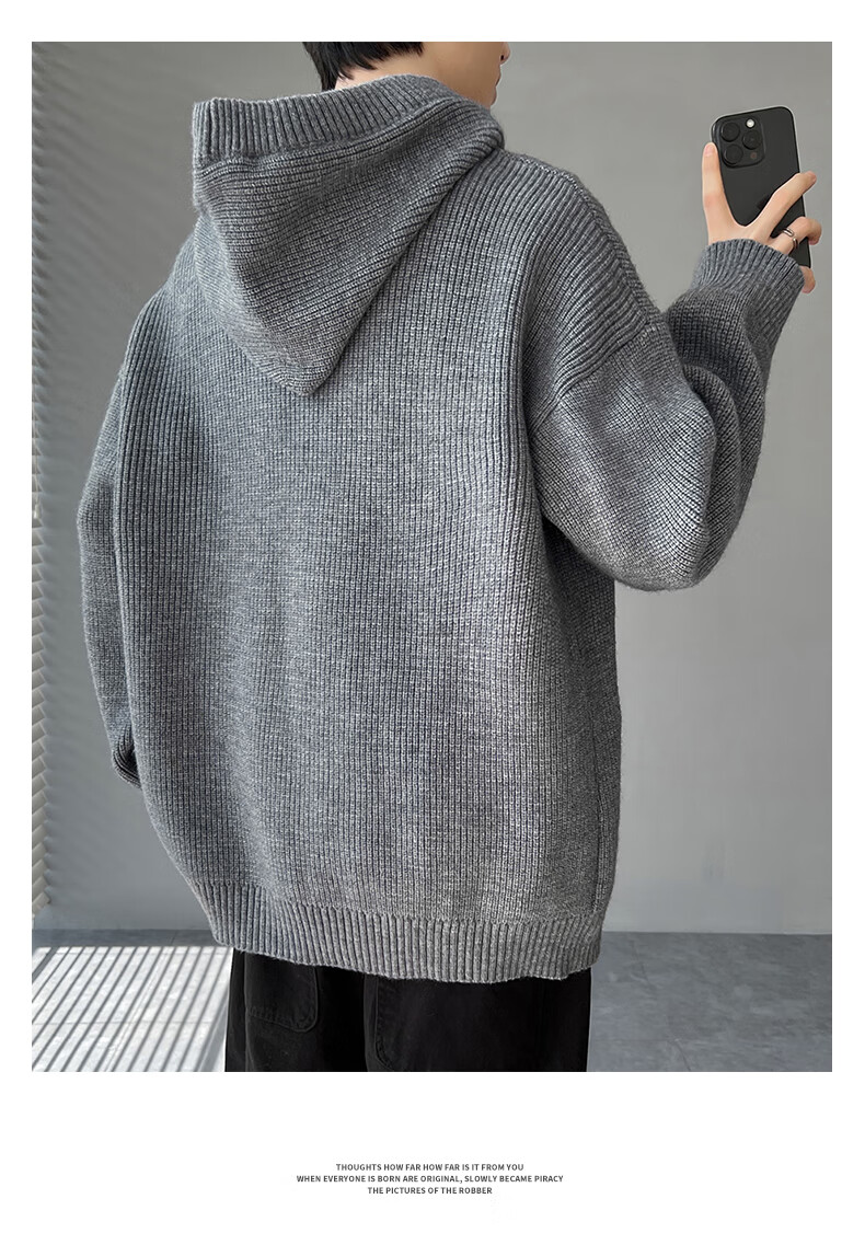 GLMGlm American Vintage Henley Collar Hooded Sweater Men's Autumn Loose Sweater Jacket Misty Black Gray L_120-140Jin Jin equals 0.5 kg