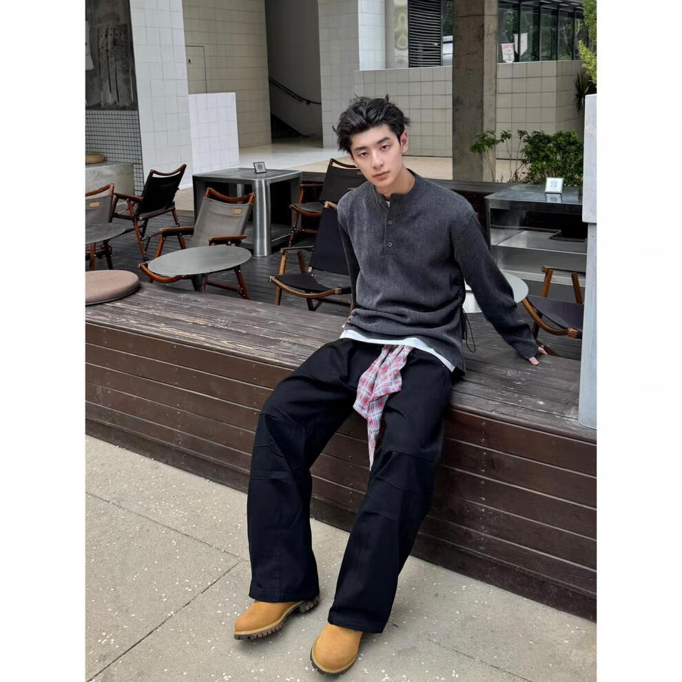 Pierre Cardin black Henry collar sweater for men, autumn old money style long-sleeved T-shirt, American retro lazy top knitted black, upgraded style M