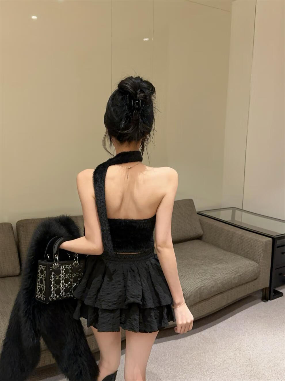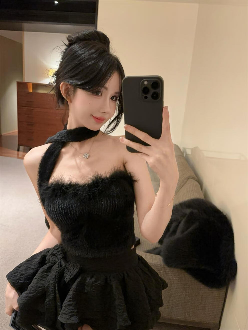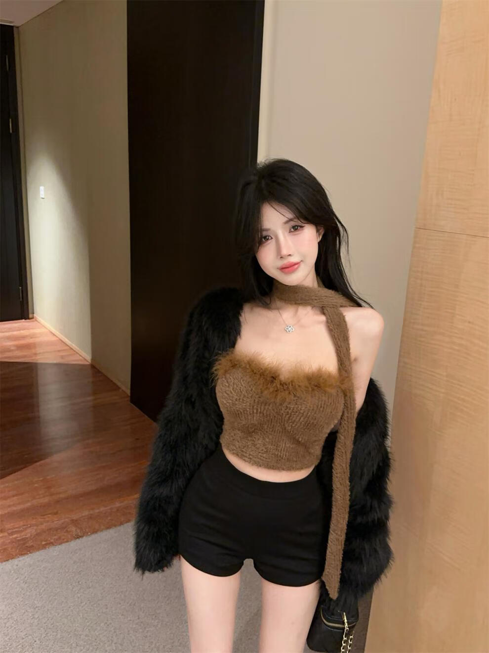 Xin Youjie Internet celebrity live broadcast photogenic clothes pure lust super fairy furry tube top vest autumn and winter with sweet and spicy style scarf top black S