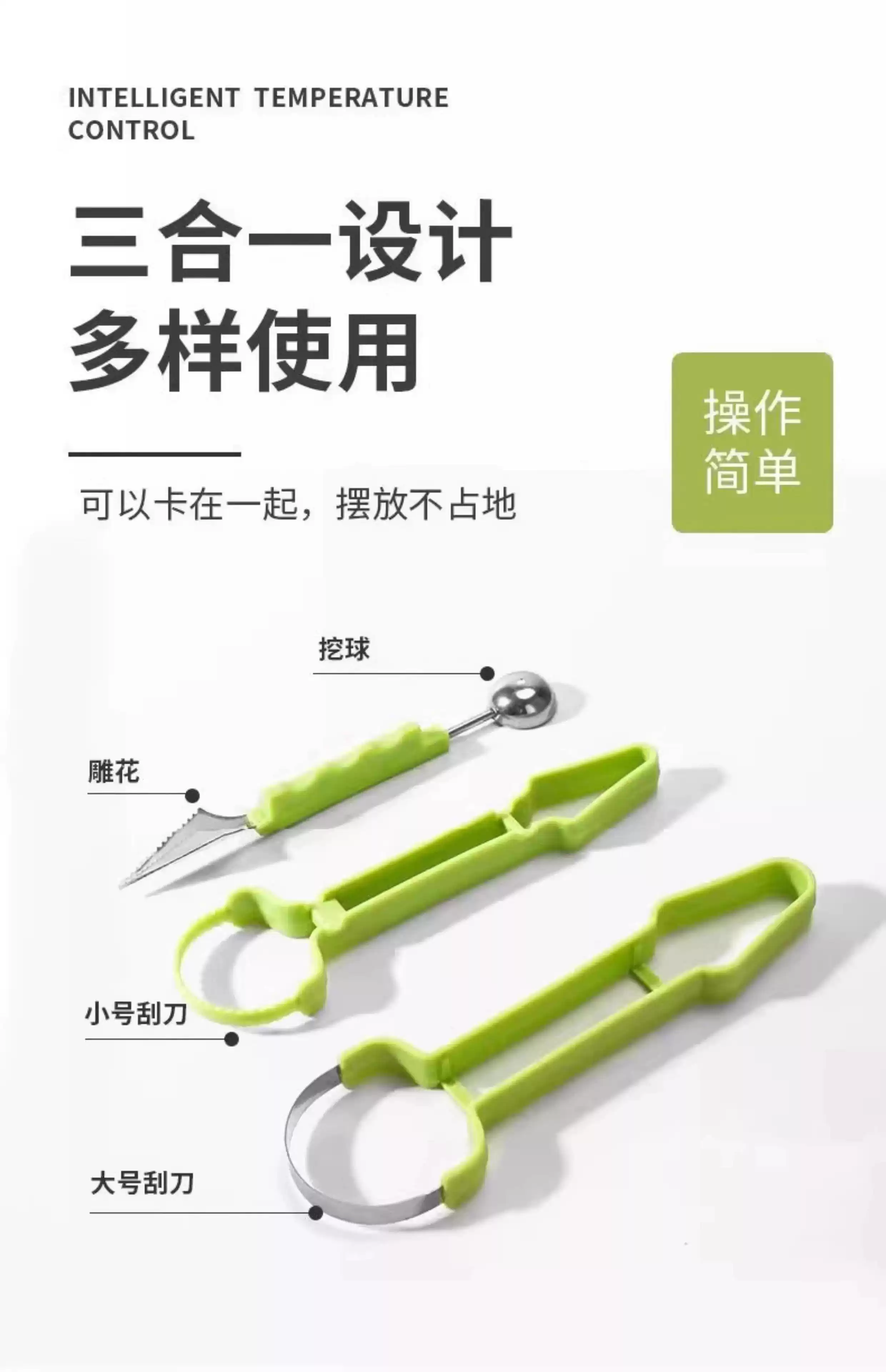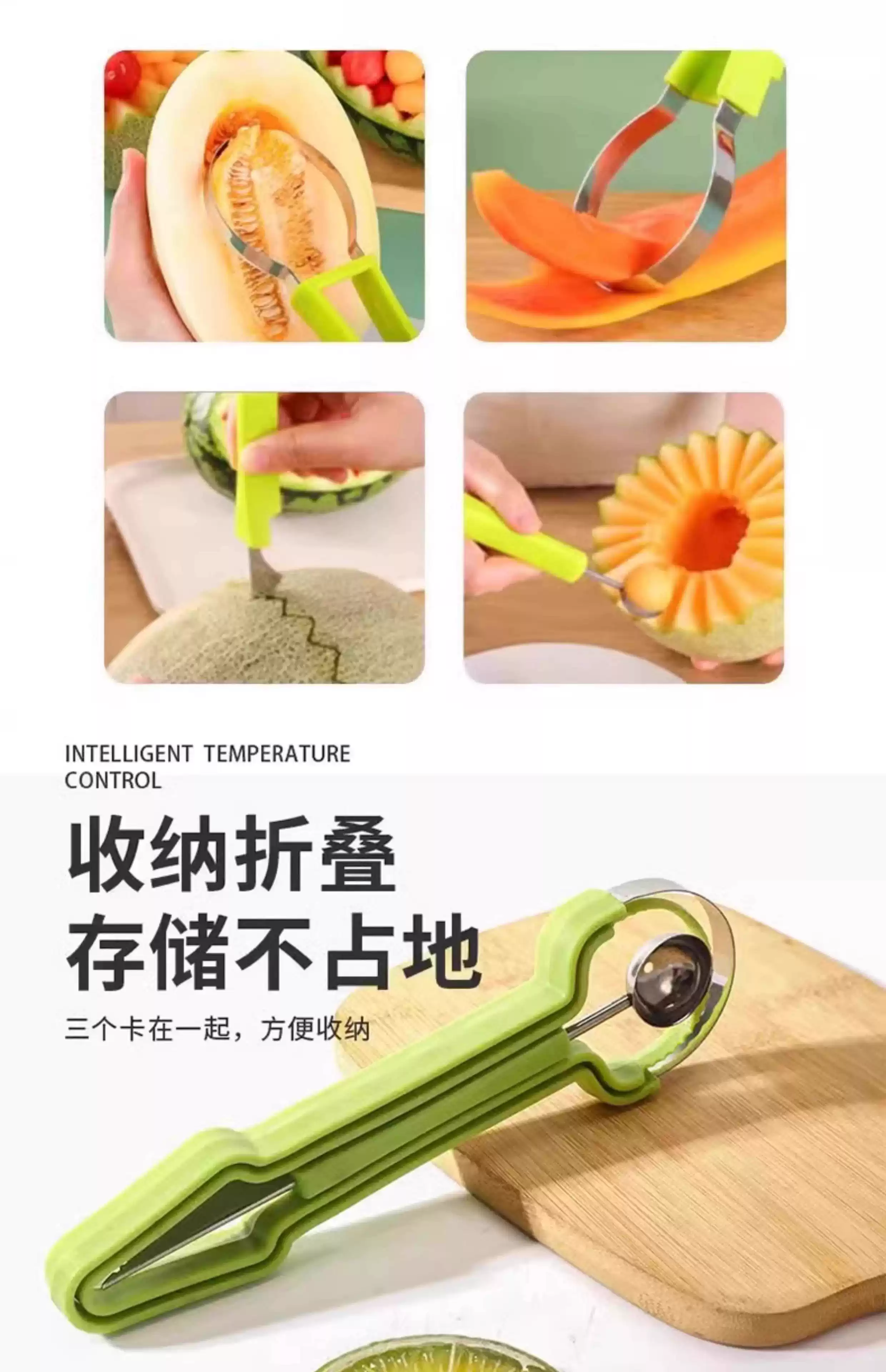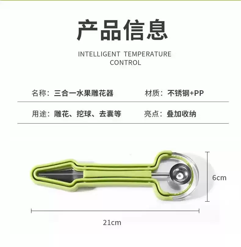 Fantasy stainless steel three-in-one fruit divider, household multi-function ball digger, ball scoop, fruit meat carving tool, upgraded three-in-one fruit carving tool, carving+