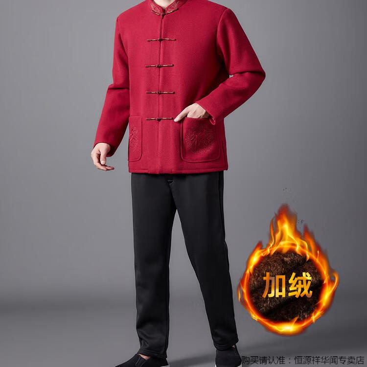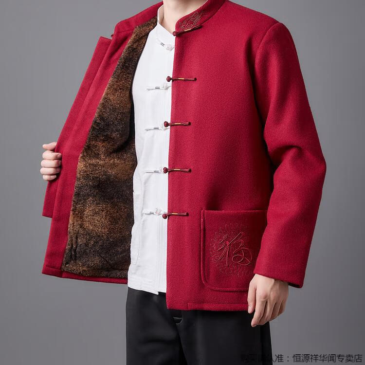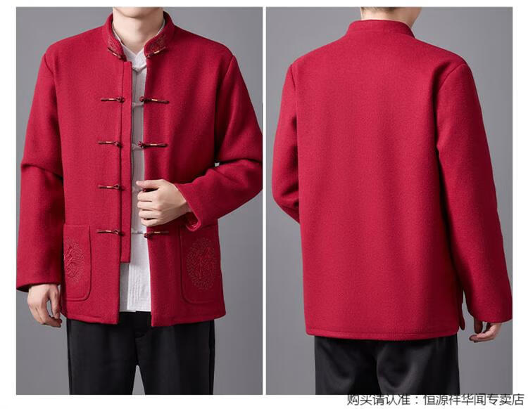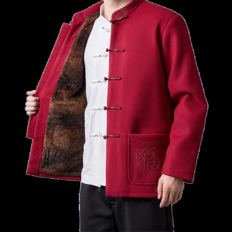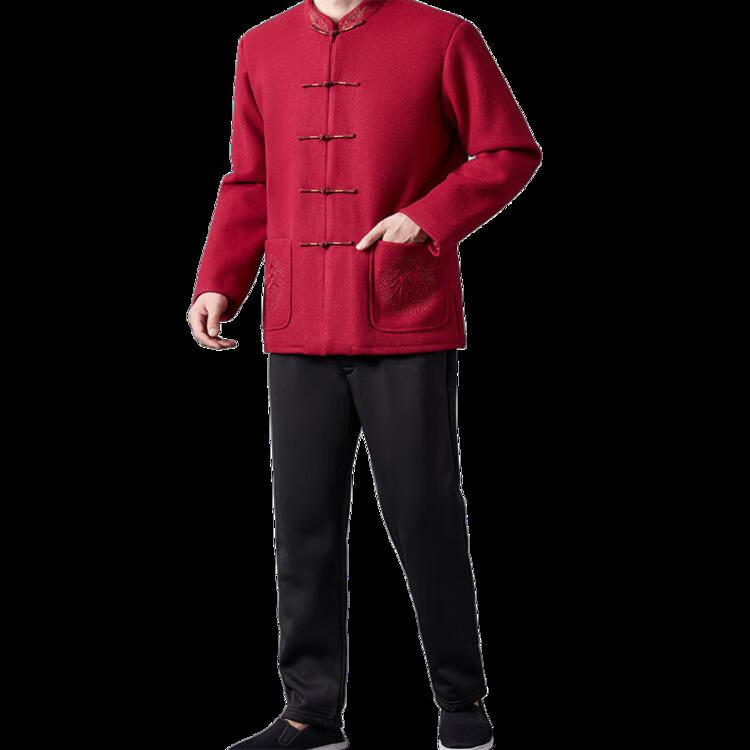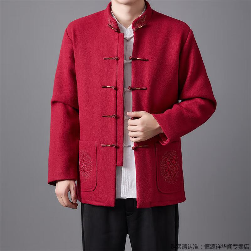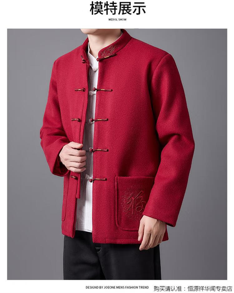 Hengyuanxiang high-end Tang suit men's middle-aged and elderly dad's suit plate buckle embroidered woolen coat elderly embroidered autumn and winter grandpa suit red XL 175