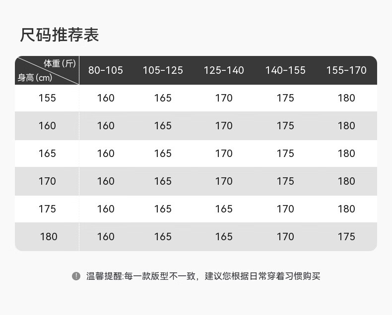 China (cm) 160-165/84-86 165-170 / 88-90 167-172 / 92-96 168-173 / 98-102 170-176 / 106-110