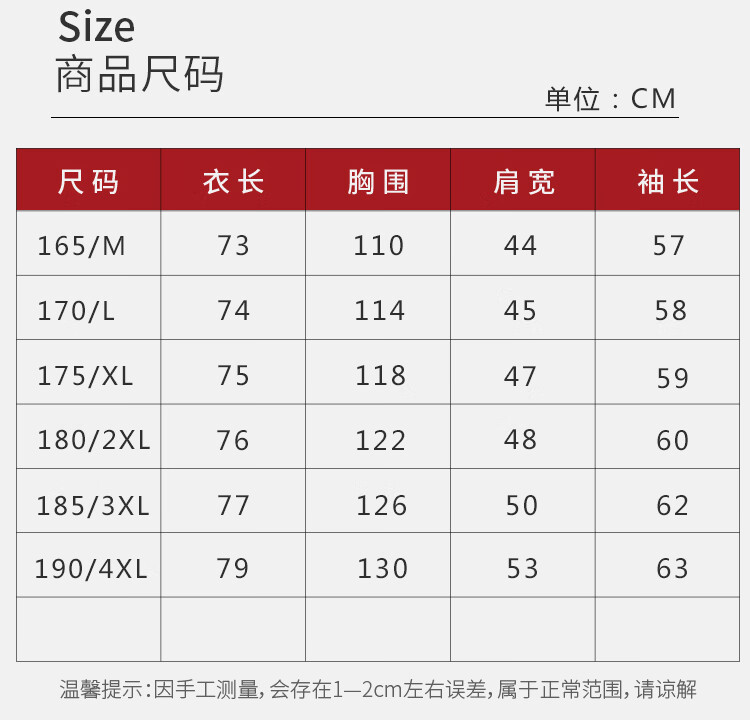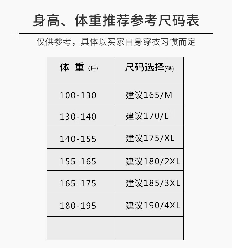 China (cm) 165 / 88-90 170 / 96-98 175 / 108-110 180 / 118-122 185 / 126-130