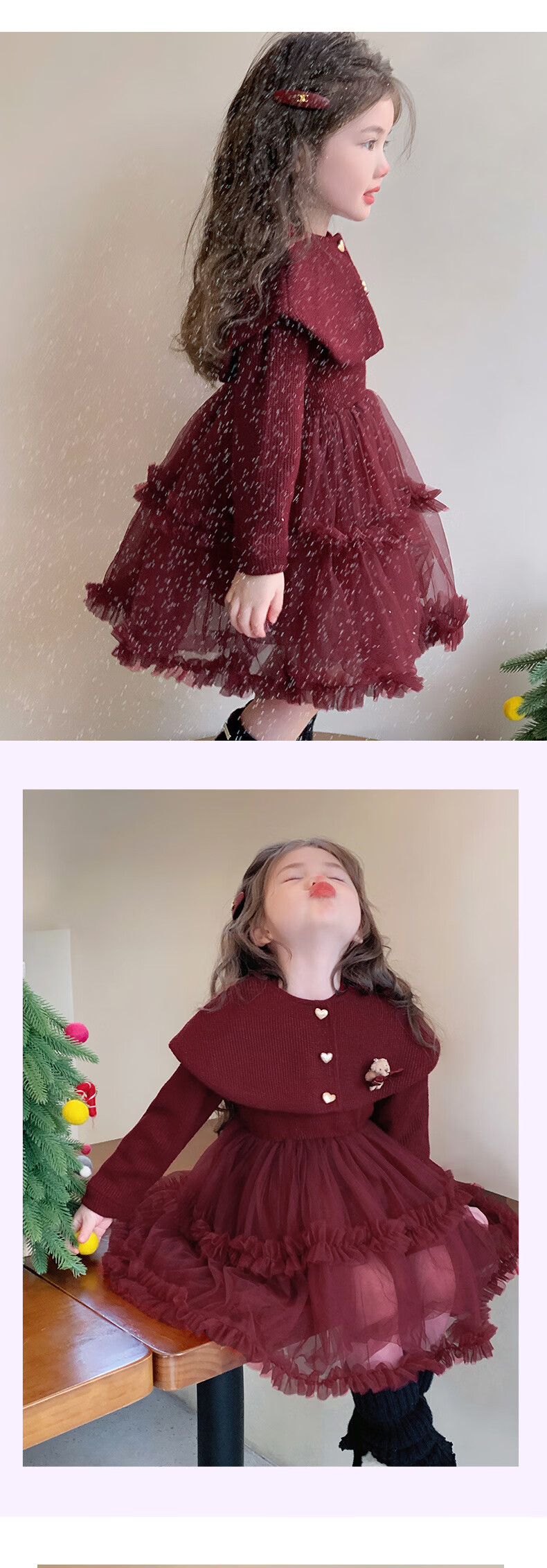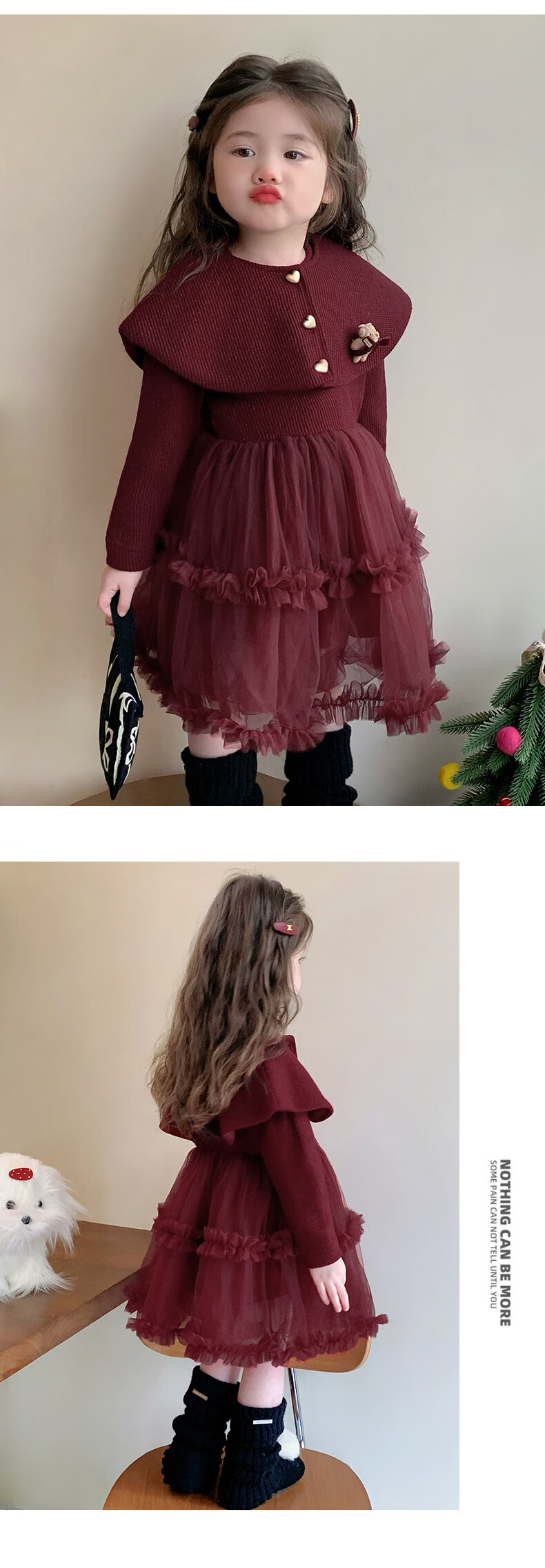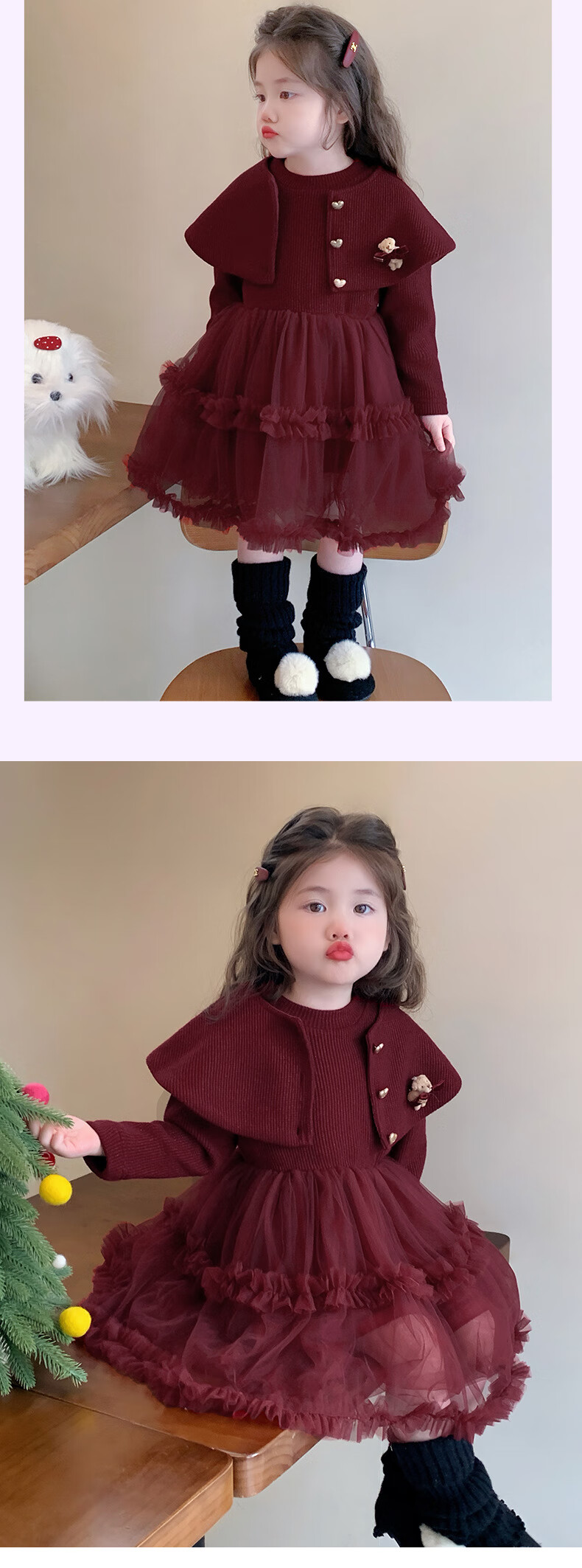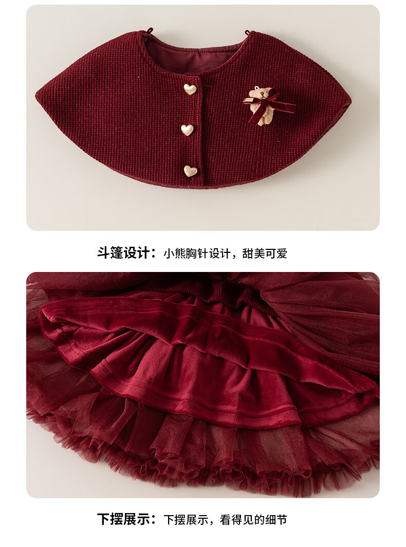G.duck girls' velvet dress, autumn and winter fashionable red sweater skirt gauze skirt winter wear children's bear shawl princess dress red 90 cm