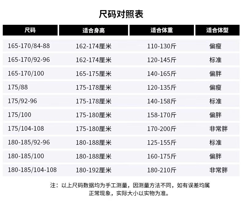 China (cm) 160-165/84-86 165-170 / 88-90 167-172 / 92-96 168-173 / 98-102 170-176 / 106-110