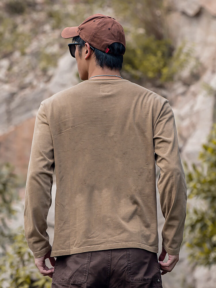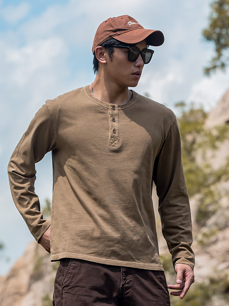 Hai Xing Henry Collar Long Sleeve T-Shirt Men's Loose Solid Color Bottoming Shirt Autumn Casual T-shirt Men's Top Brown XL