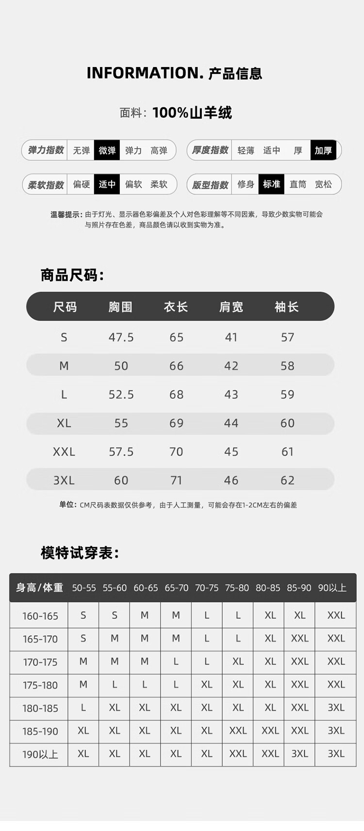 China (cm) 165 / 88-90 170 / 96-98 175 / 108-110 180 / 118-122 185 / 126-130