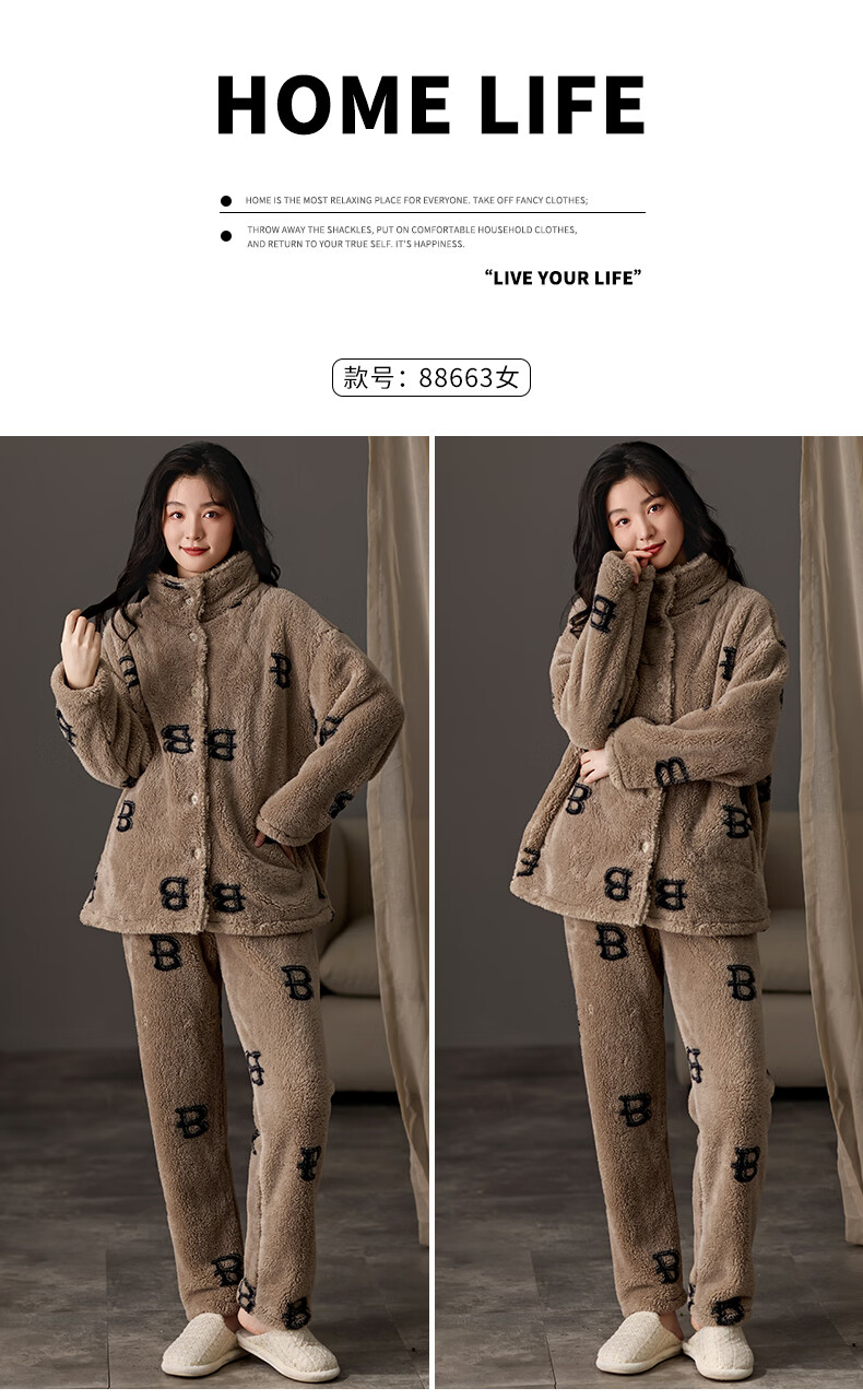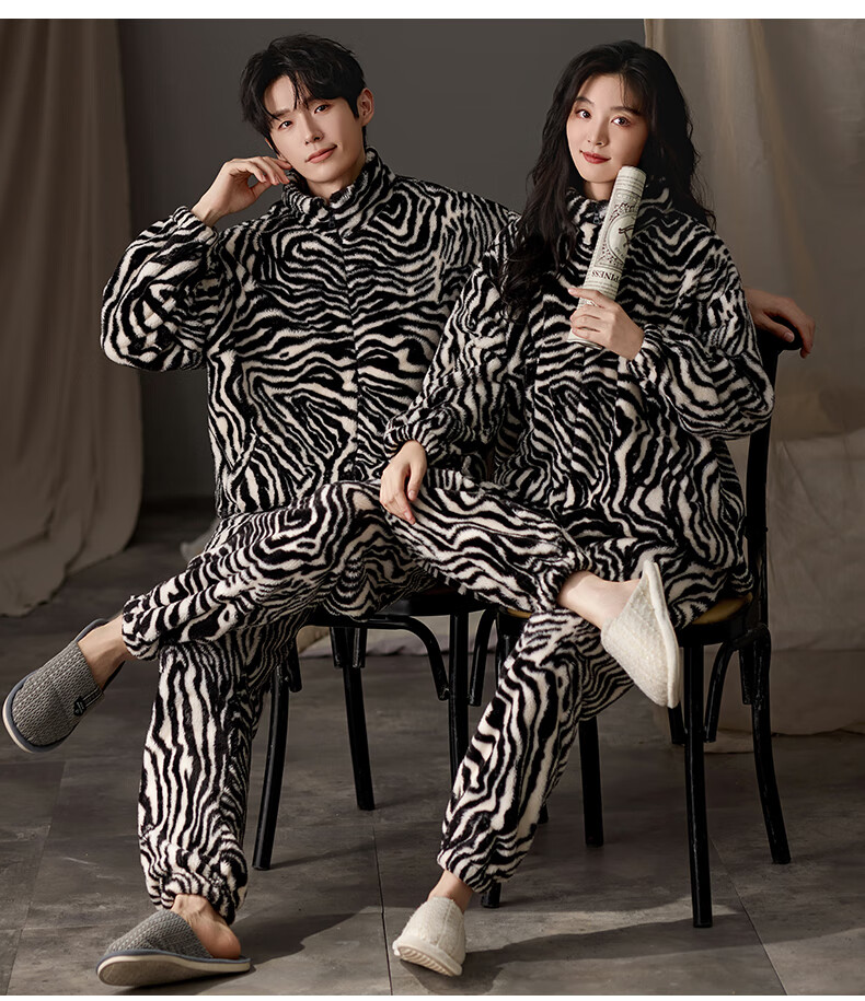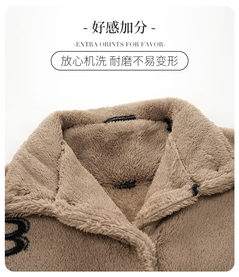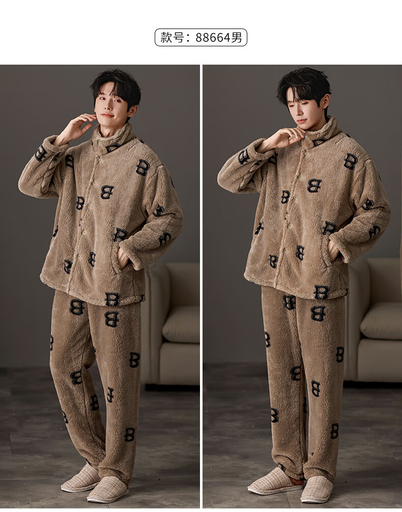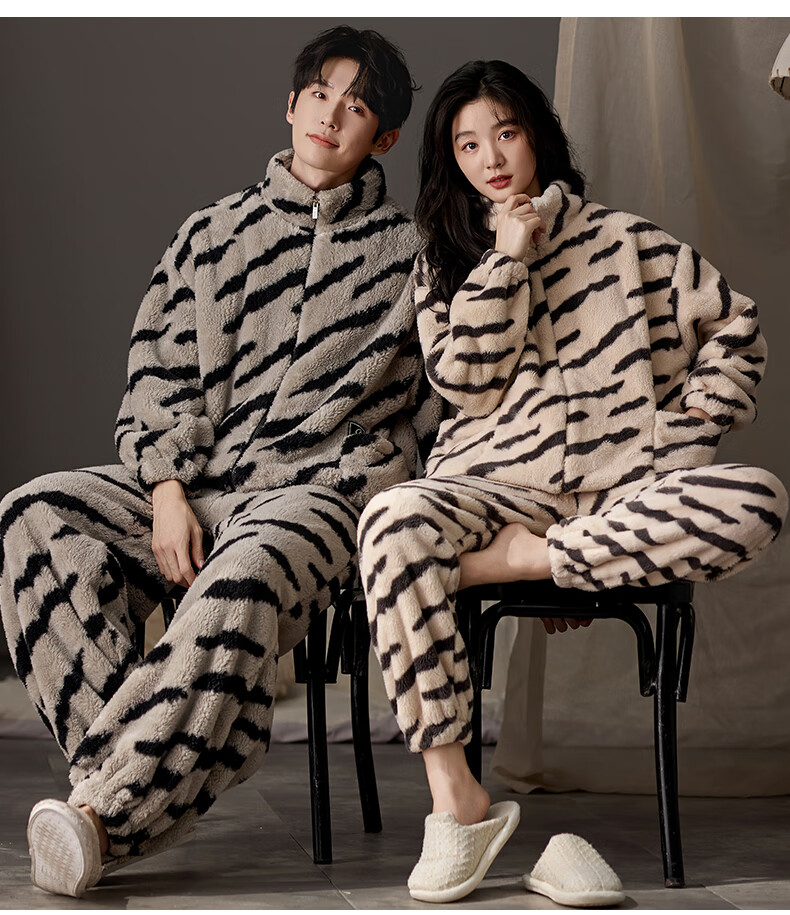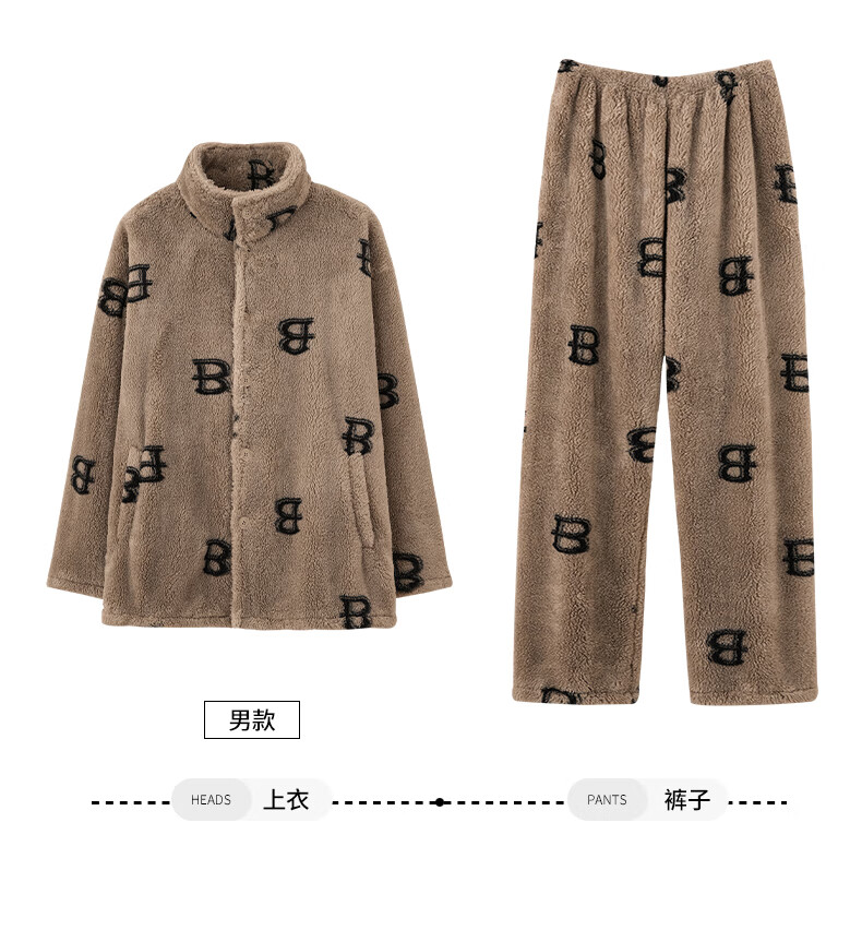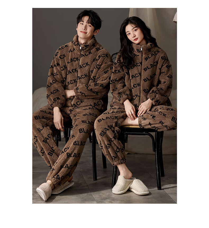 LangSha couple pajamas for winter, one man and one woman, warm flannel thickened cardigan, casual and can be worn outside, autumn and winter home clothes, female 88659 + male 88660 M female + L male
