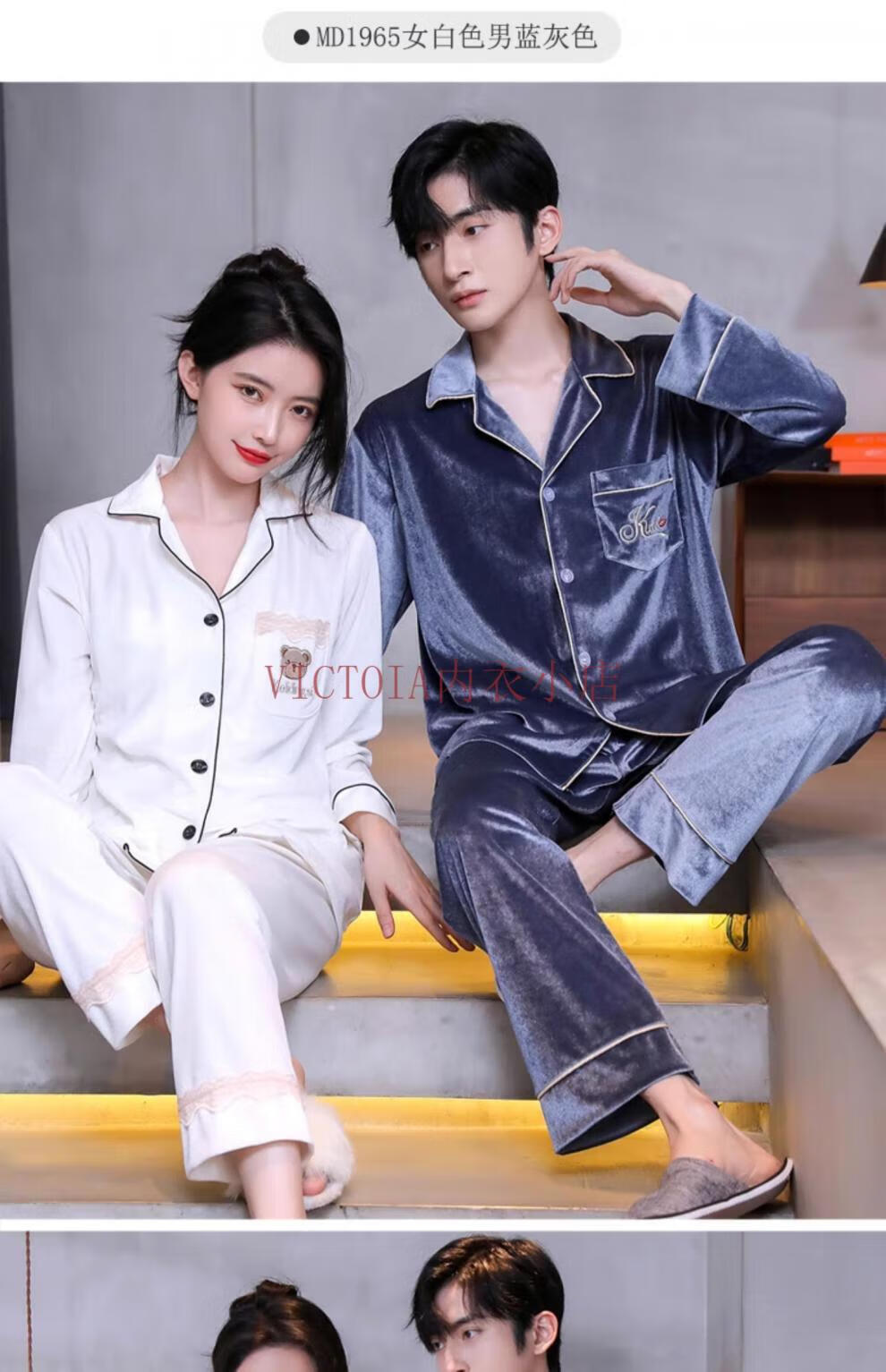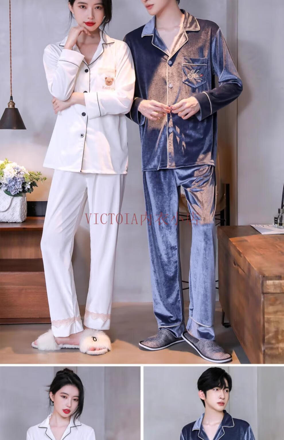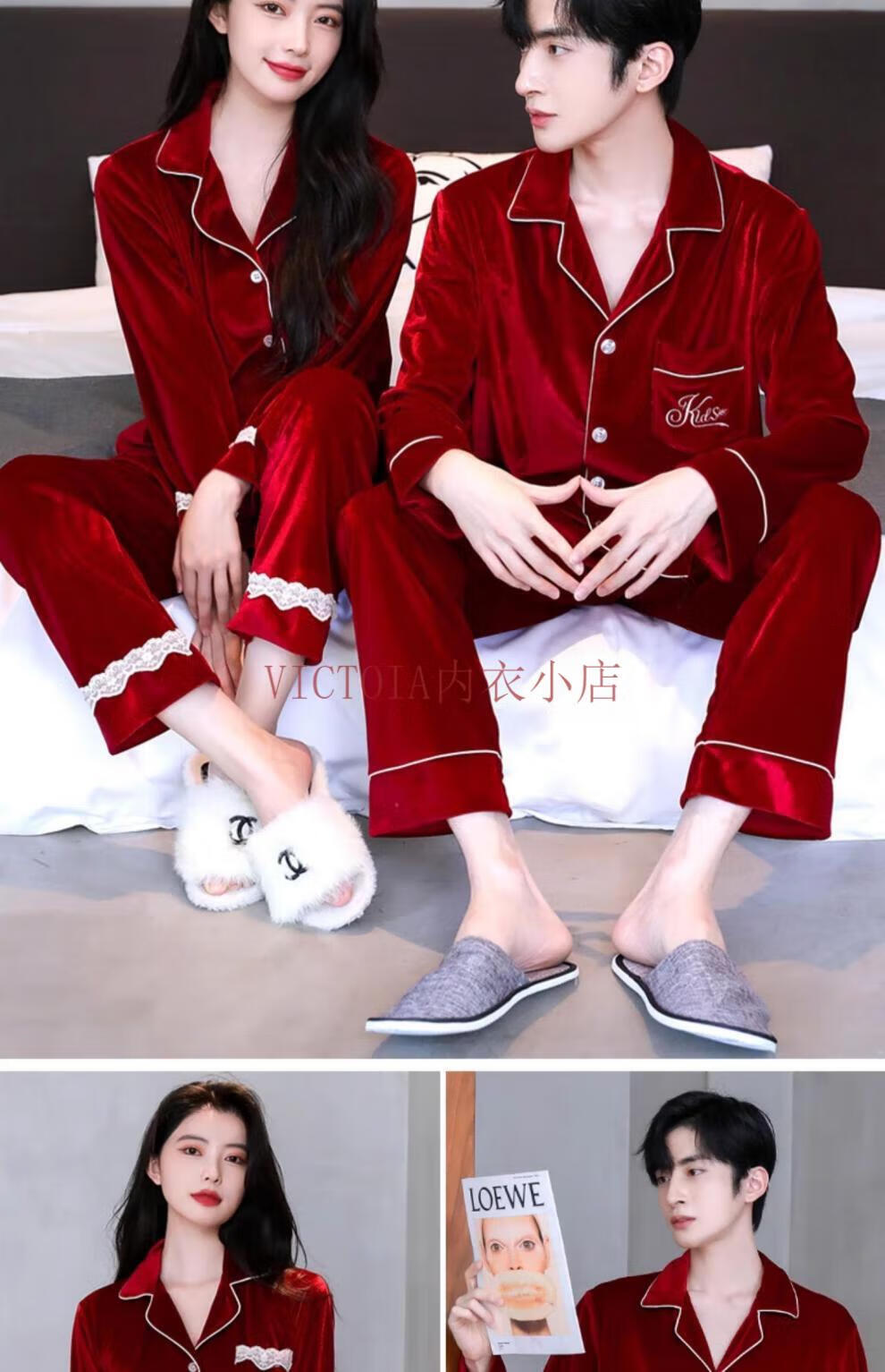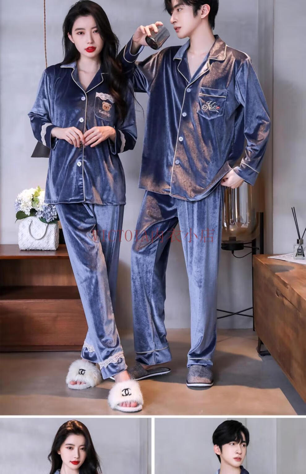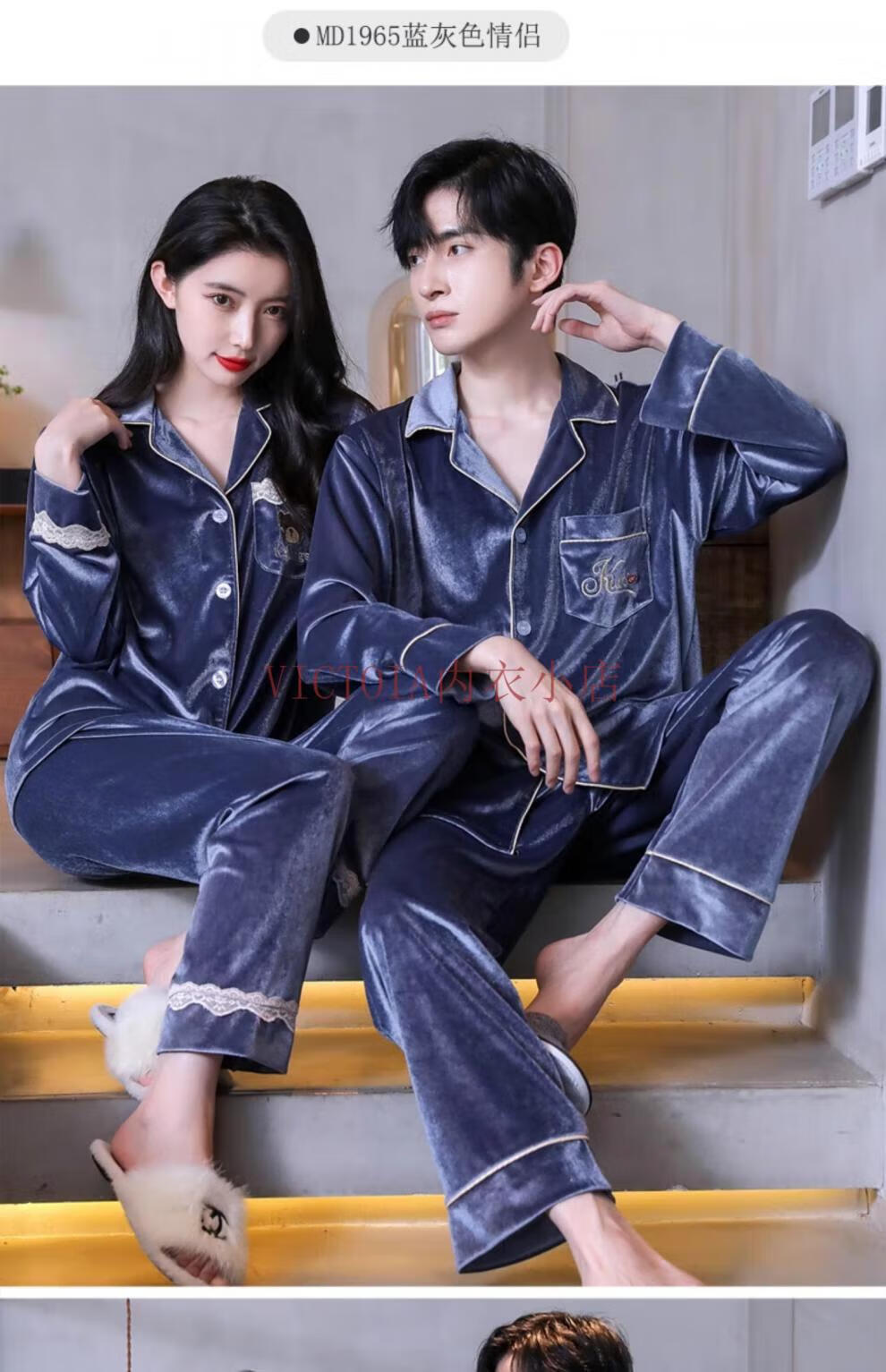 Victoria's Secret Autumn and Winter Gold Velvet Couple Pajamas for Women Red Wedding Bride Spring and Autumn Men's Long-Sleeved Home Clothes 713 Blue Gray Couple Suit (Gold Velvet) XL Women Get Men's XL