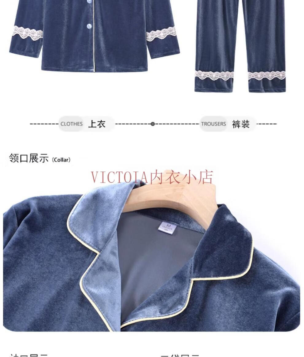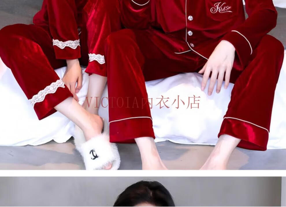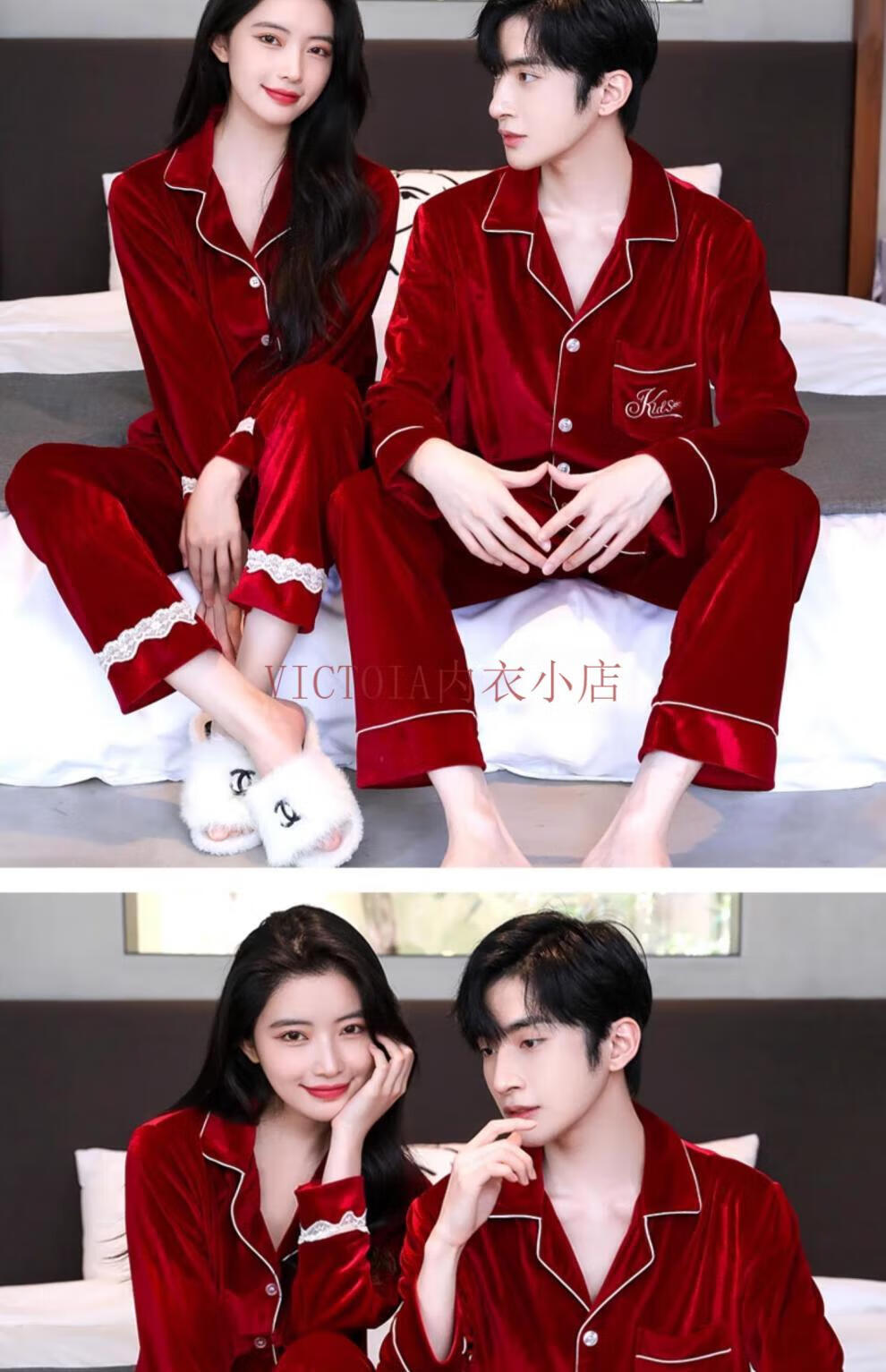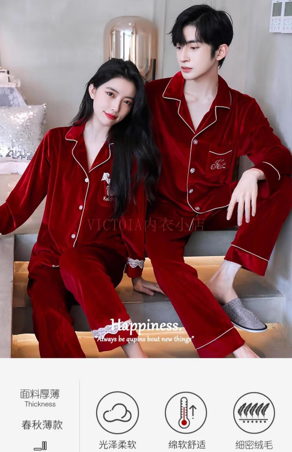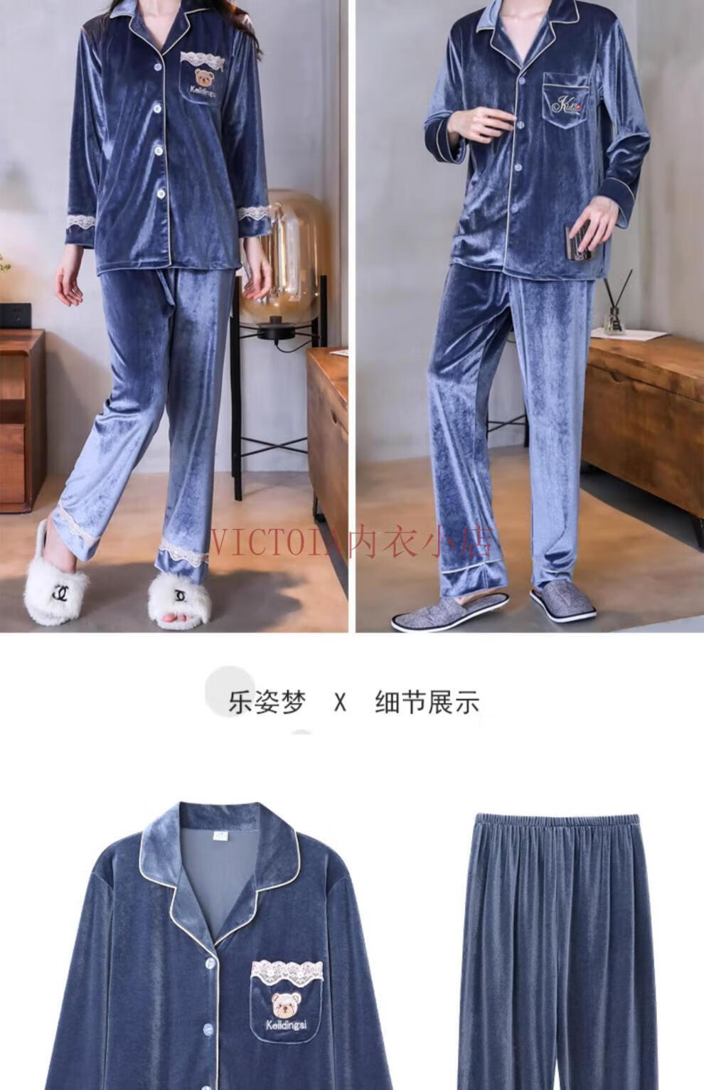 Victoria's Secret Autumn and Winter Gold Velvet Couple Pajamas for Women Red Wedding Bride Spring and Autumn Men's Long-Sleeved Home Clothes 713 Blue Gray Couple Suit (Gold Velvet) XL Women Get Men's XL