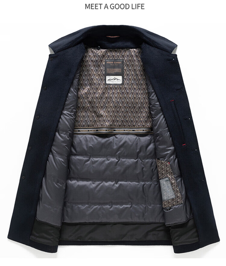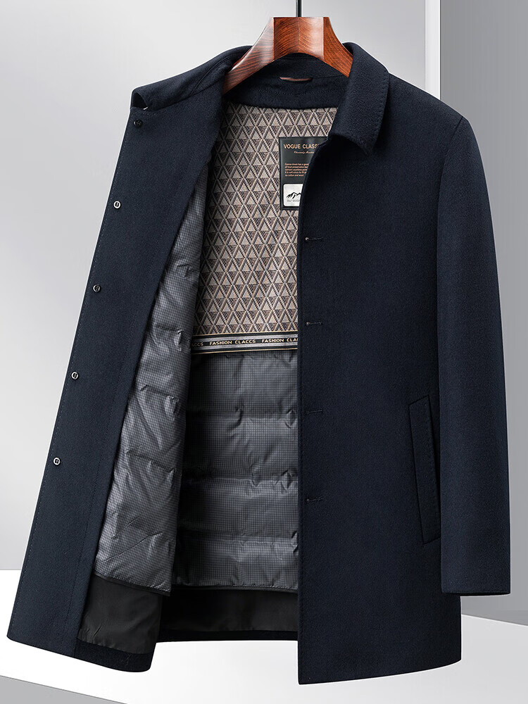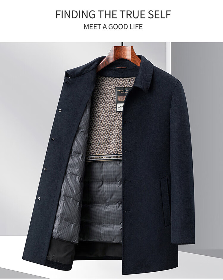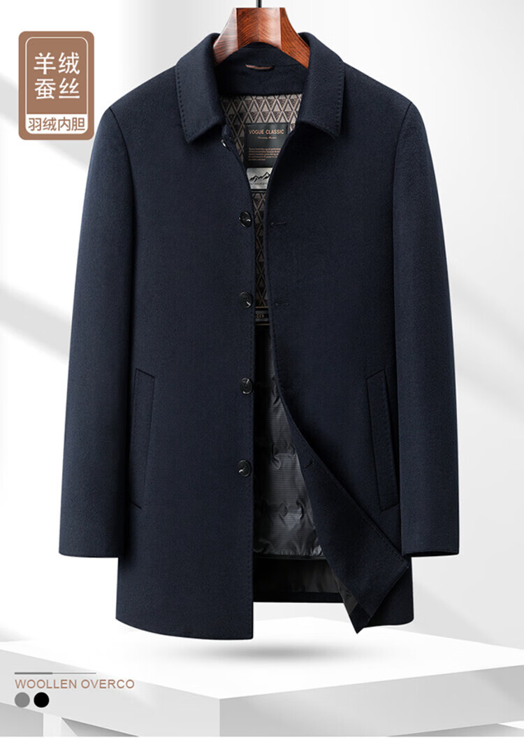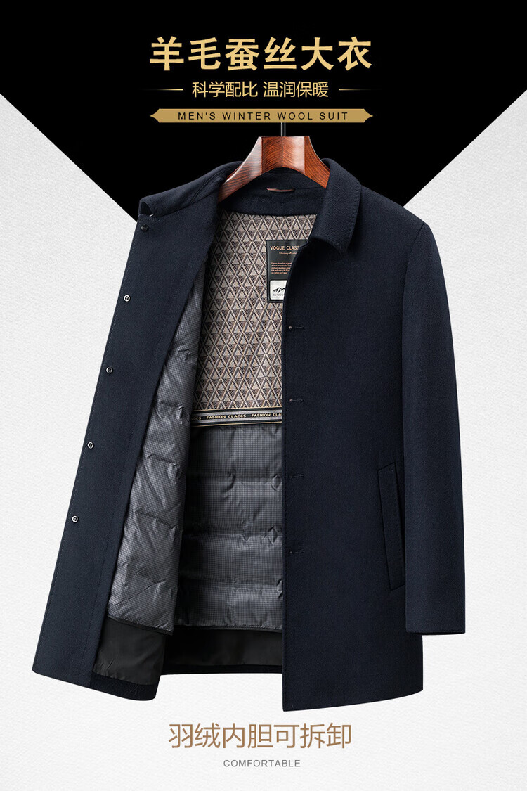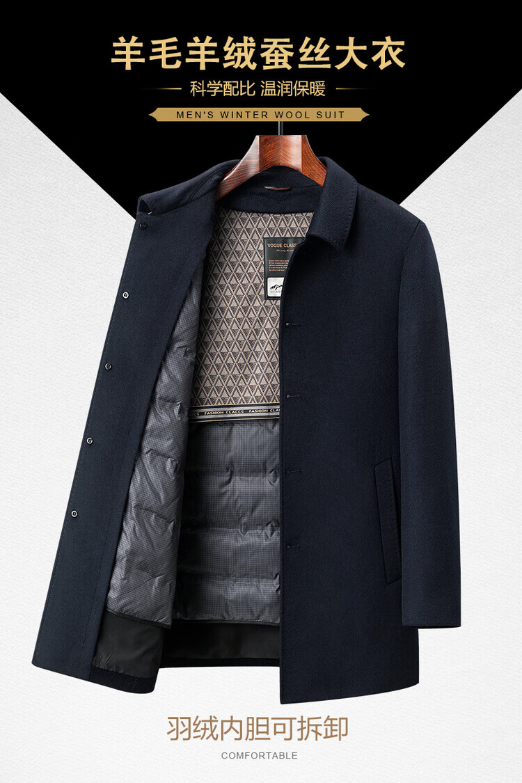 Red bean silk cashmere down removable liner 2025 new men's woolen coat cashmere silk wool navy blue 3XL