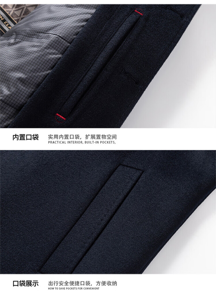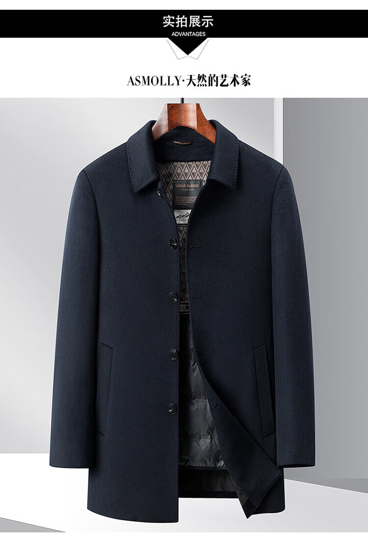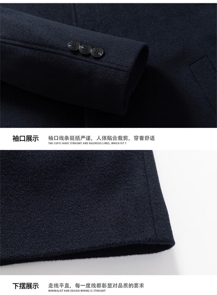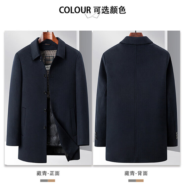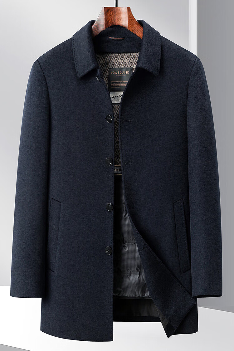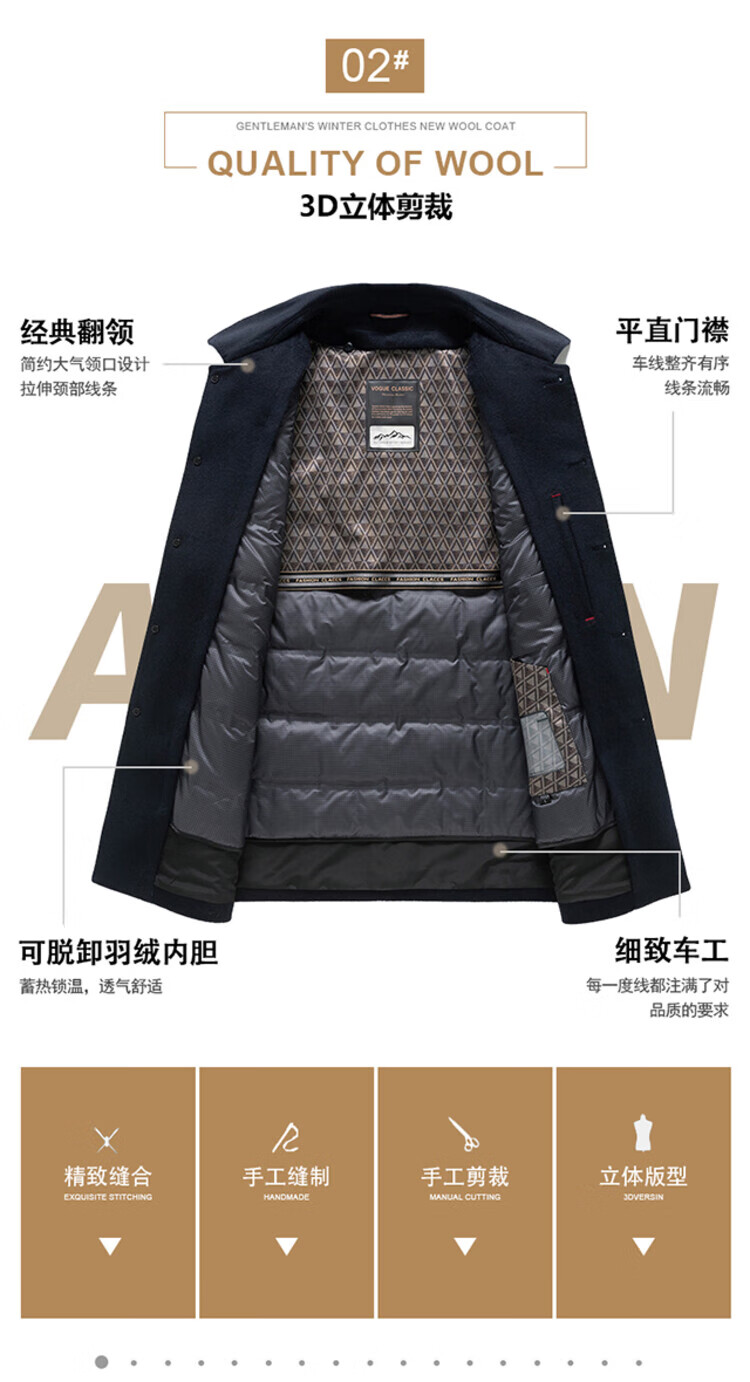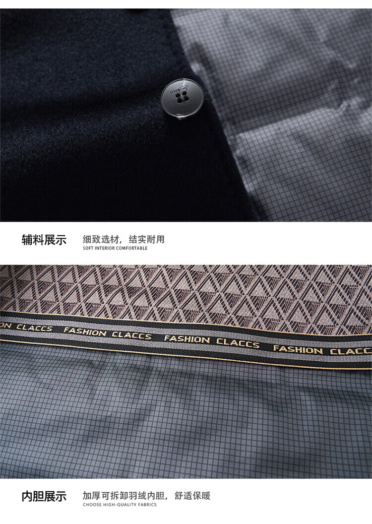 Red bean silk cashmere down removable liner 2025 new men's woolen coat cashmere silk wool navy blue 3XL