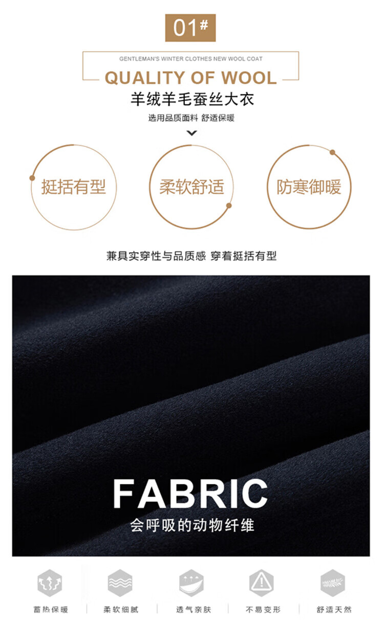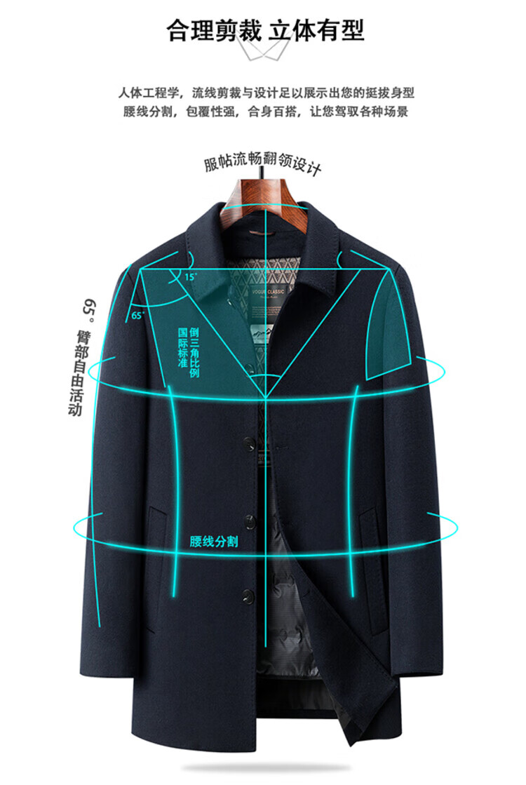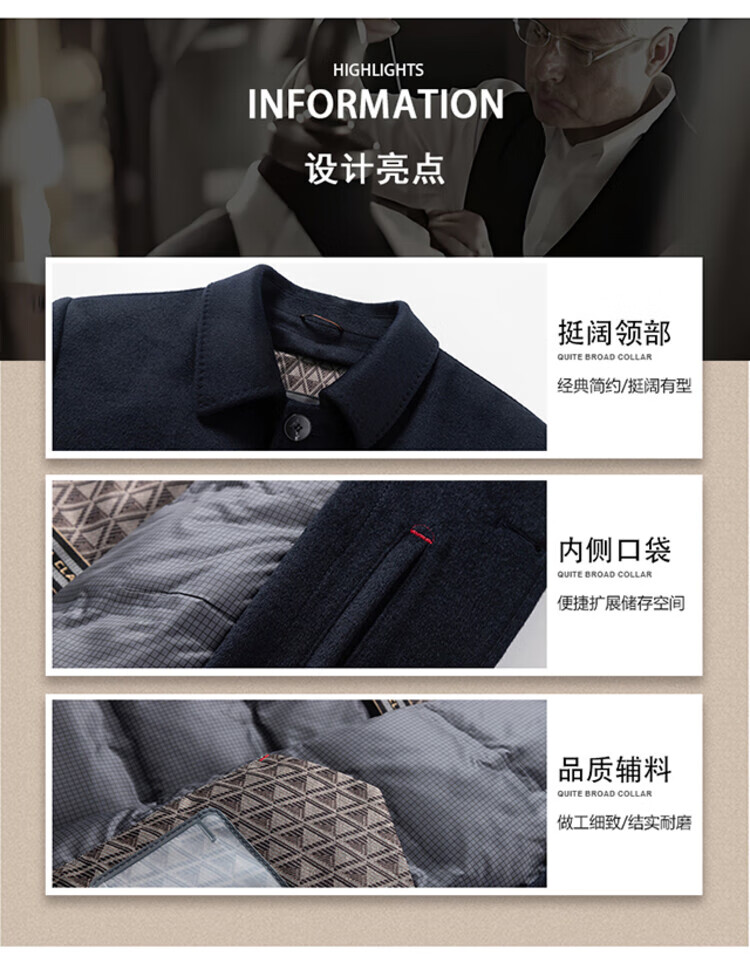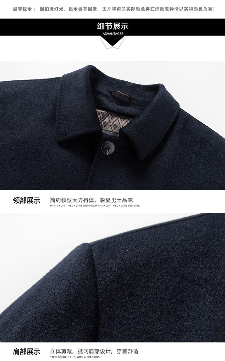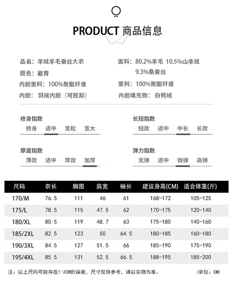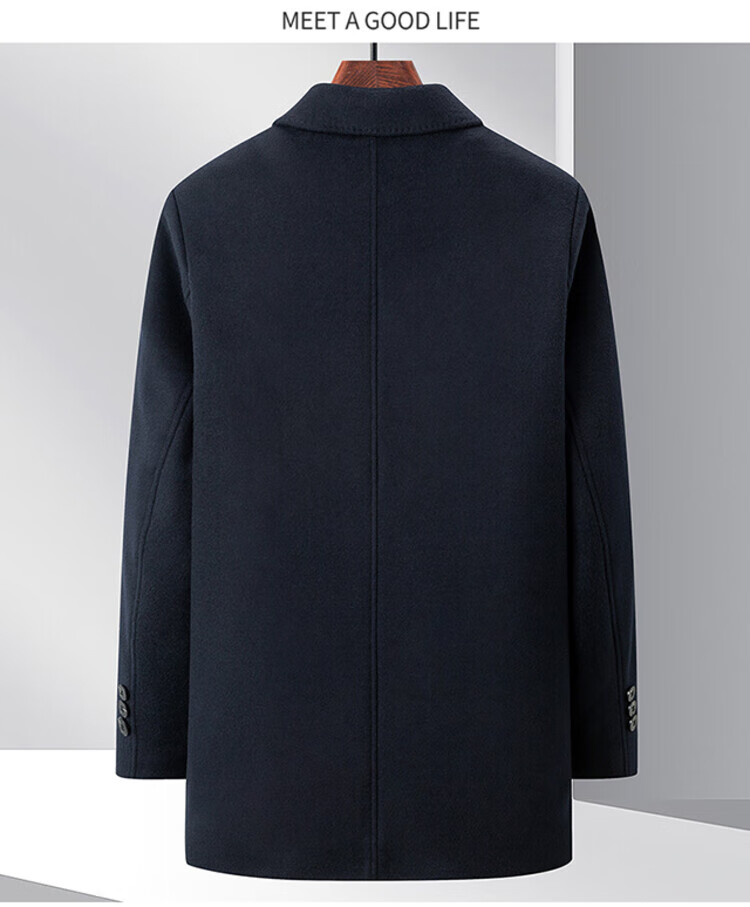 Red bean silk cashmere down removable liner 2025 new men's woolen coat cashmere silk wool navy blue 3XL