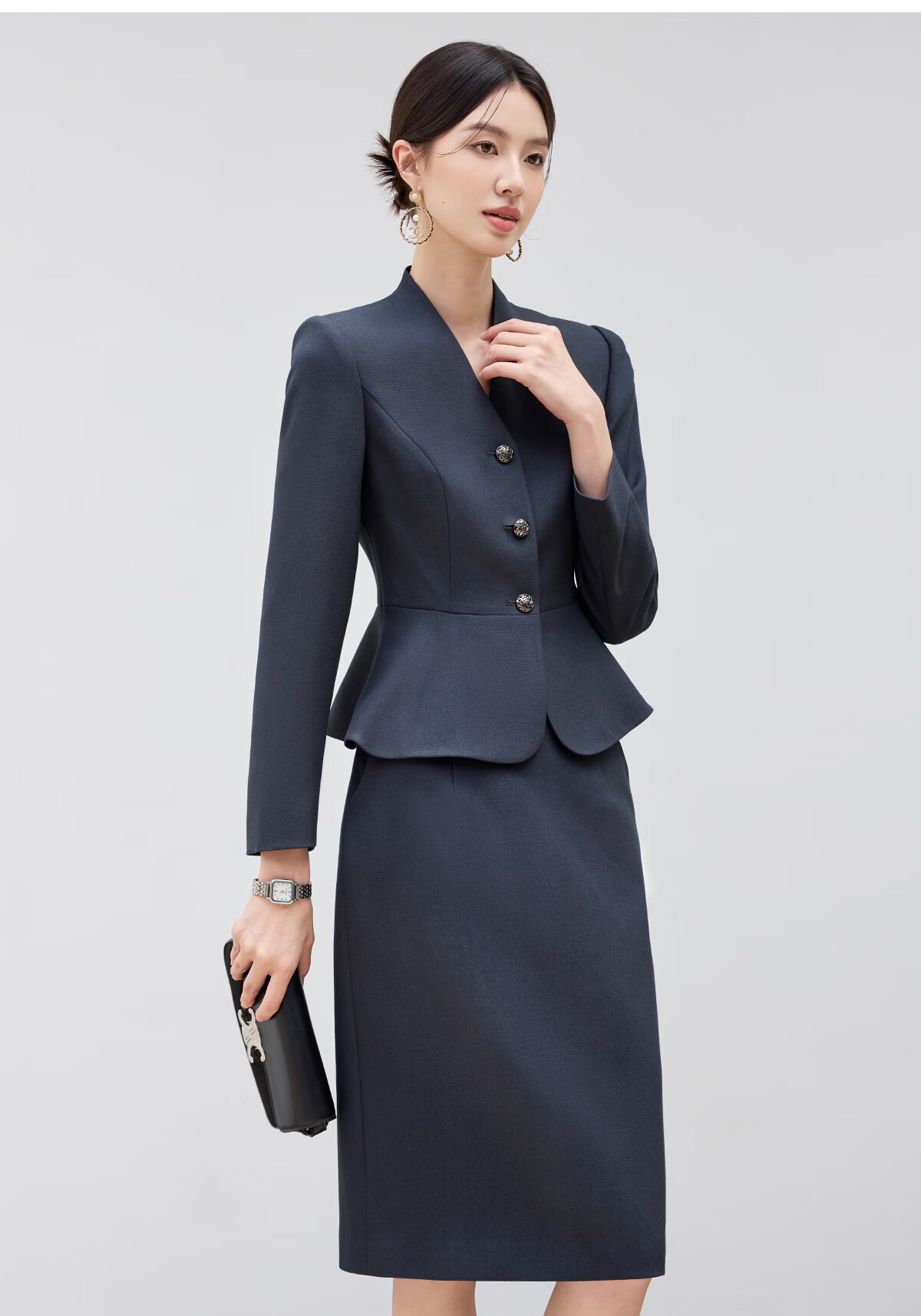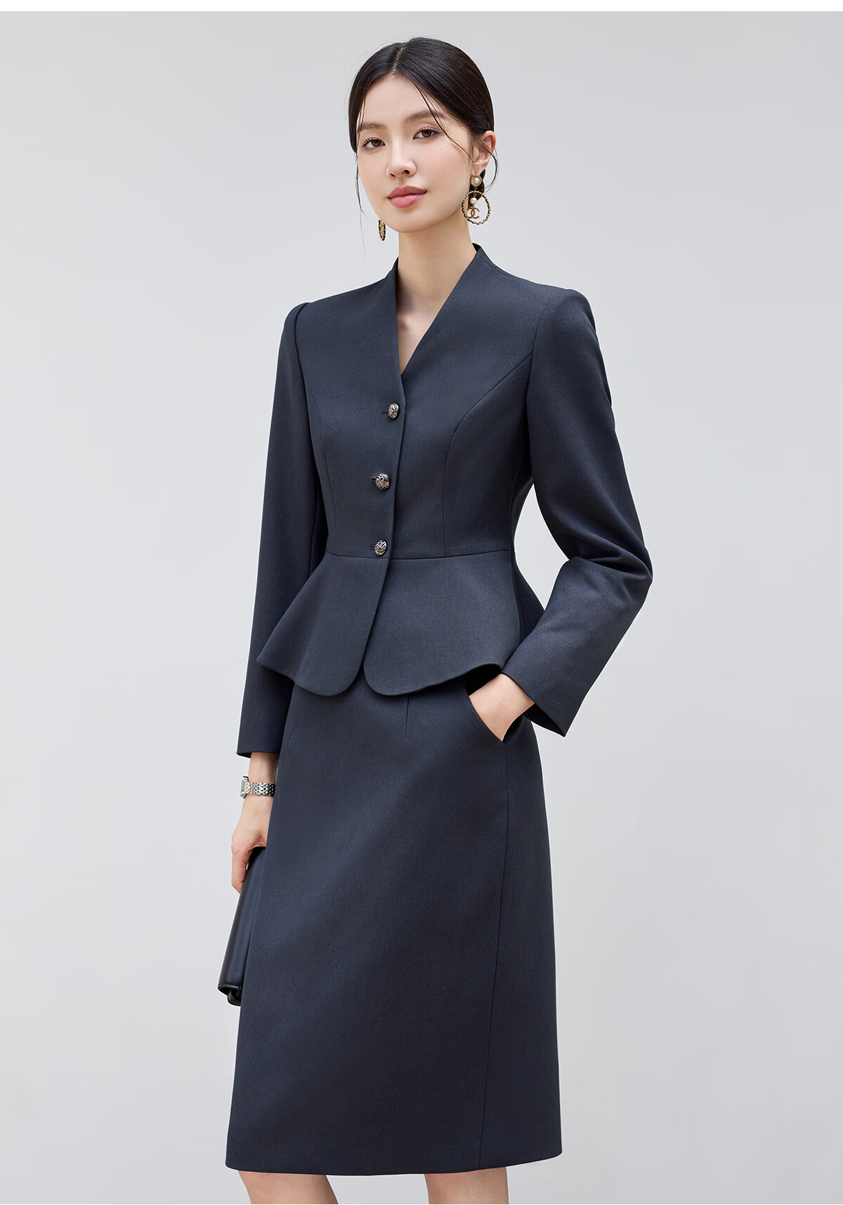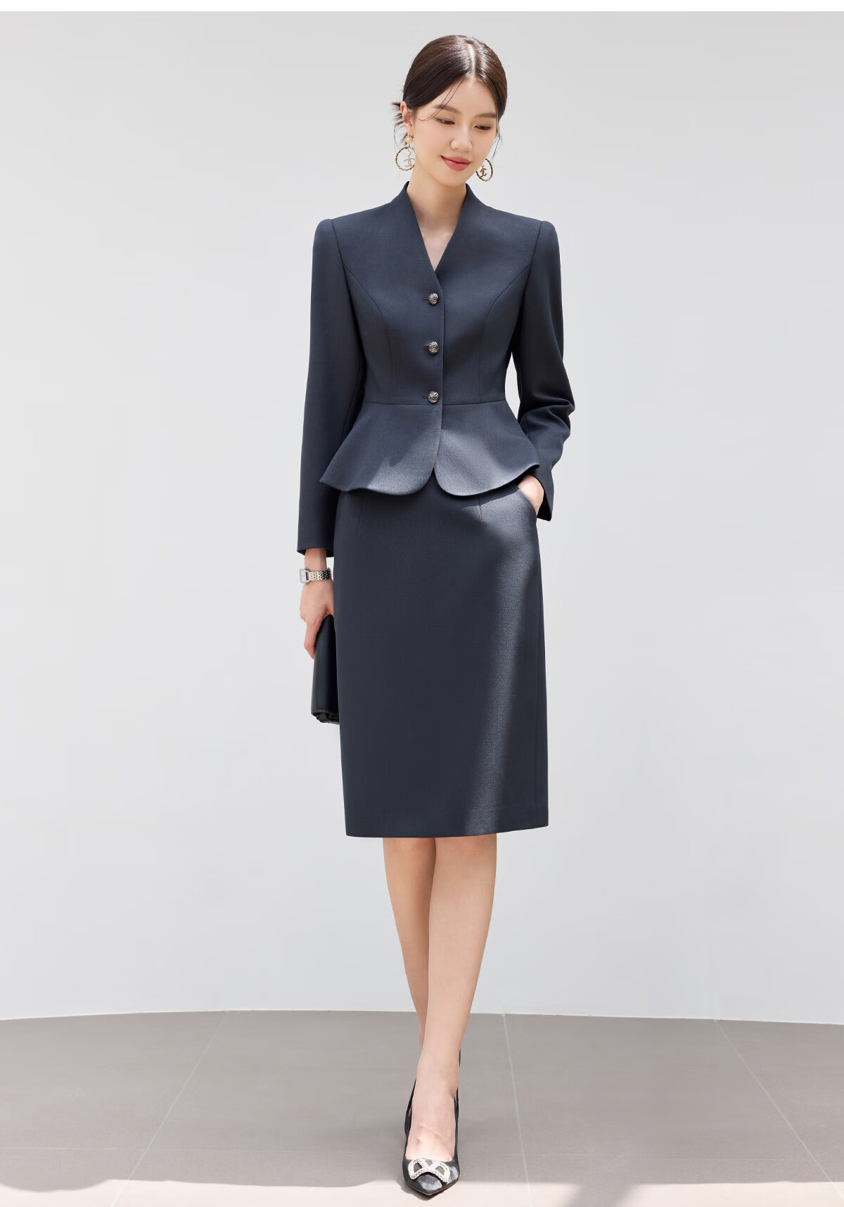黛维亚2025新青灰色西装套裙女秋气质显瘦酒店前台接待工服珠宝店职业装 藏青色西服+半裙 XL