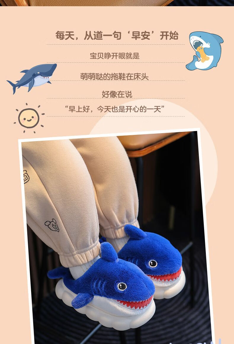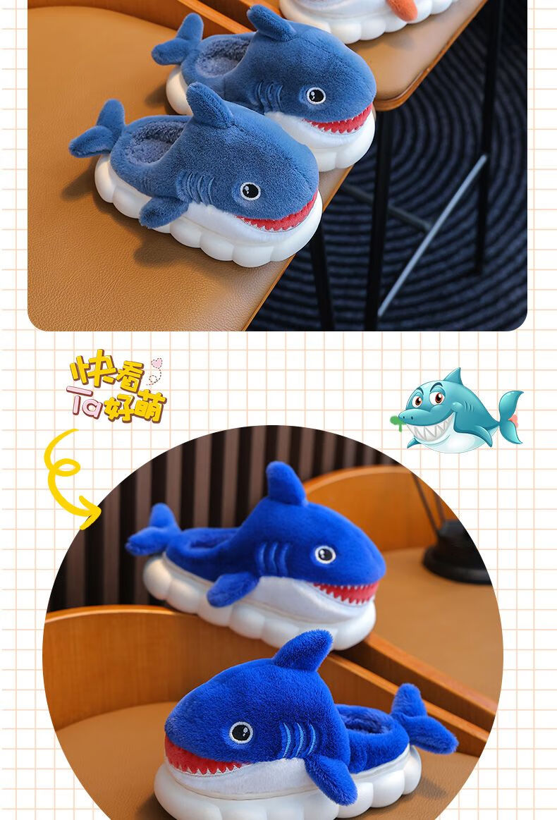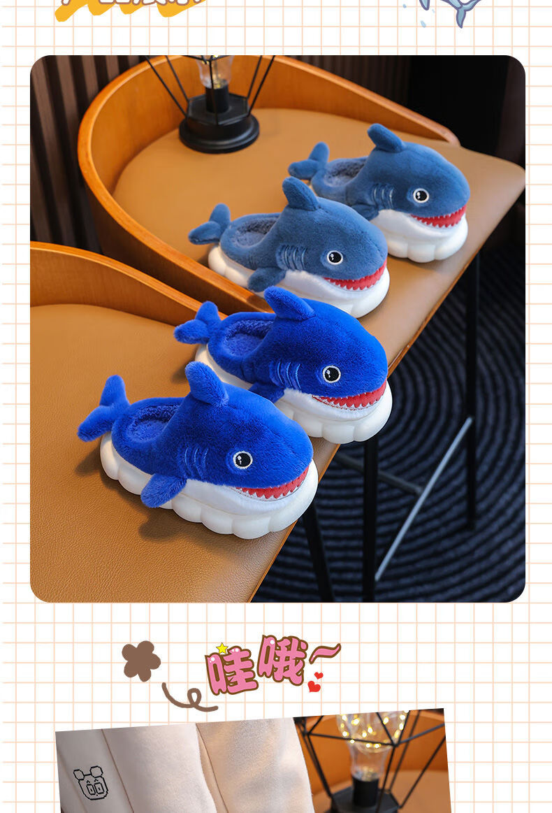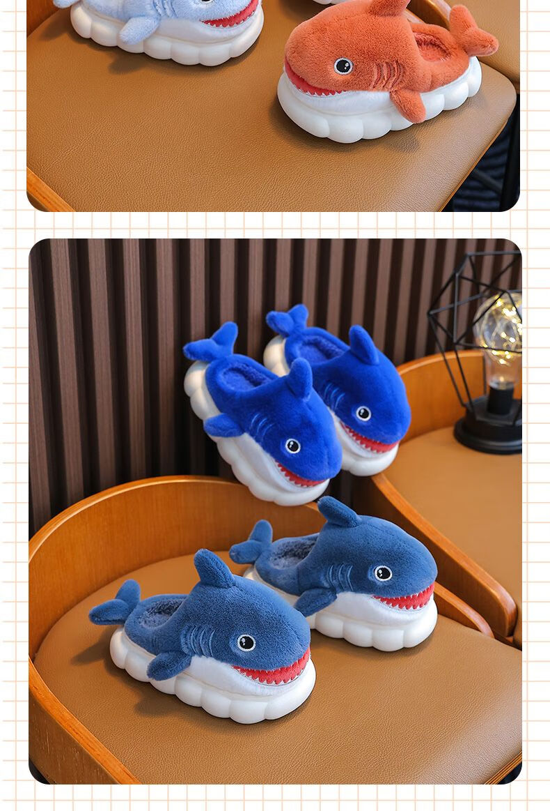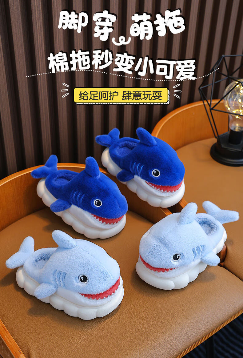 G.duck little yellow duck children's cotton slippers for boys winter cartoon shark bag and furry shoes for children baby home shoes parent-child sapphire blue slippers size 24 25 inner length 15CM suitable for 1-2 years old