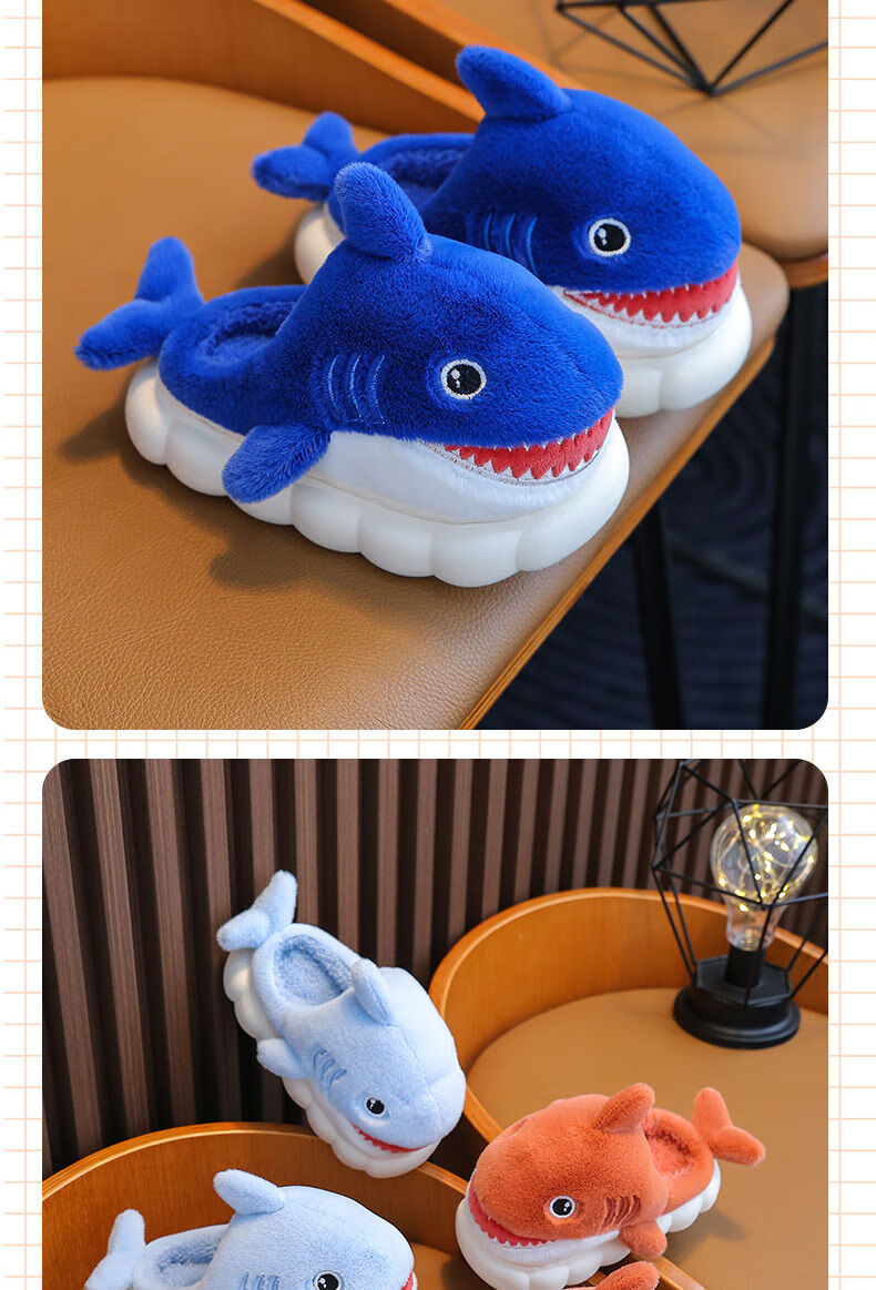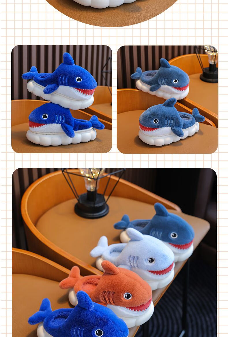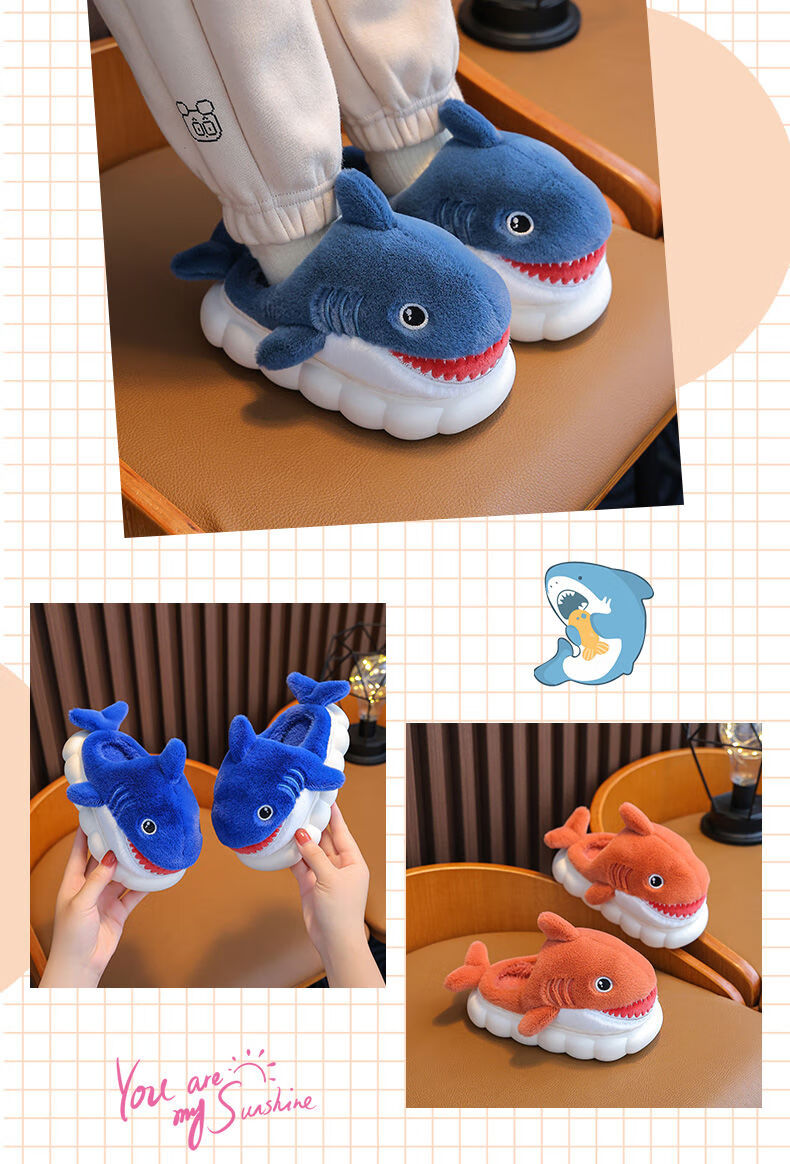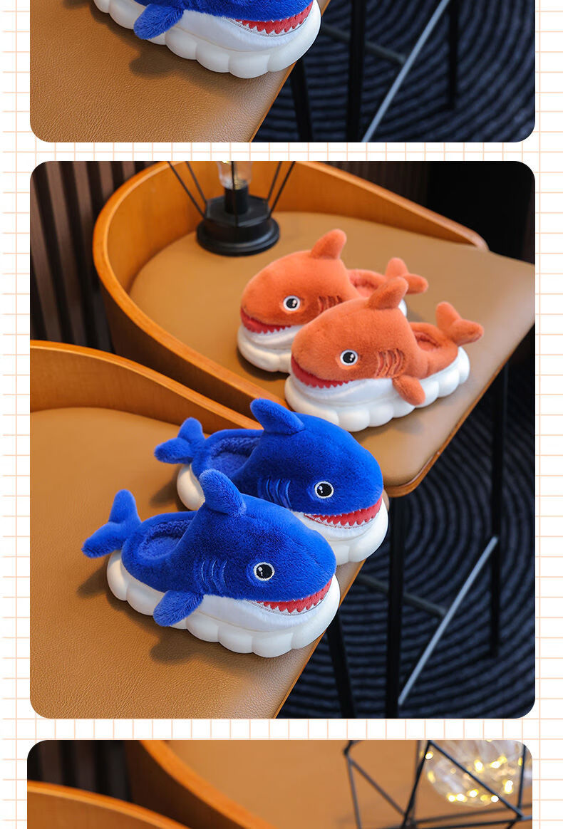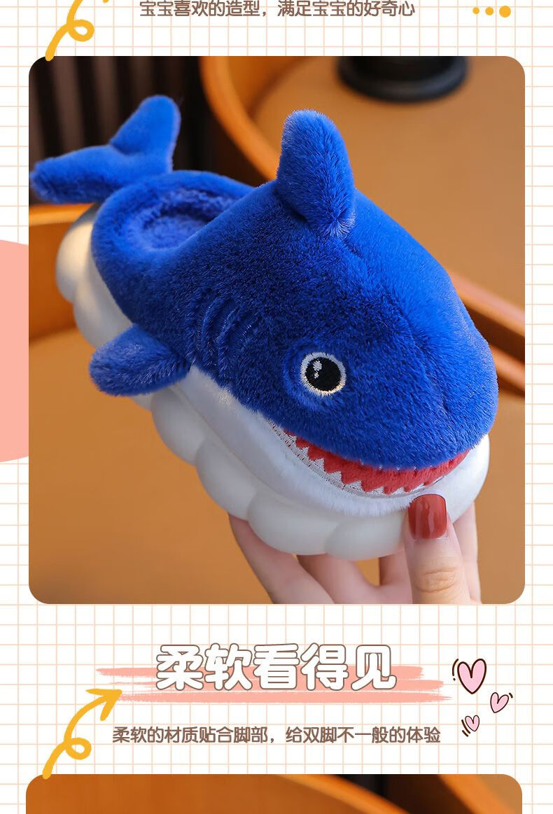 G.duck little yellow duck children's cotton slippers for boys winter cartoon shark bag and furry shoes for children baby home shoes parent-child sapphire blue slippers size 24 25 inner length 15CM suitable for 1-2 years old
