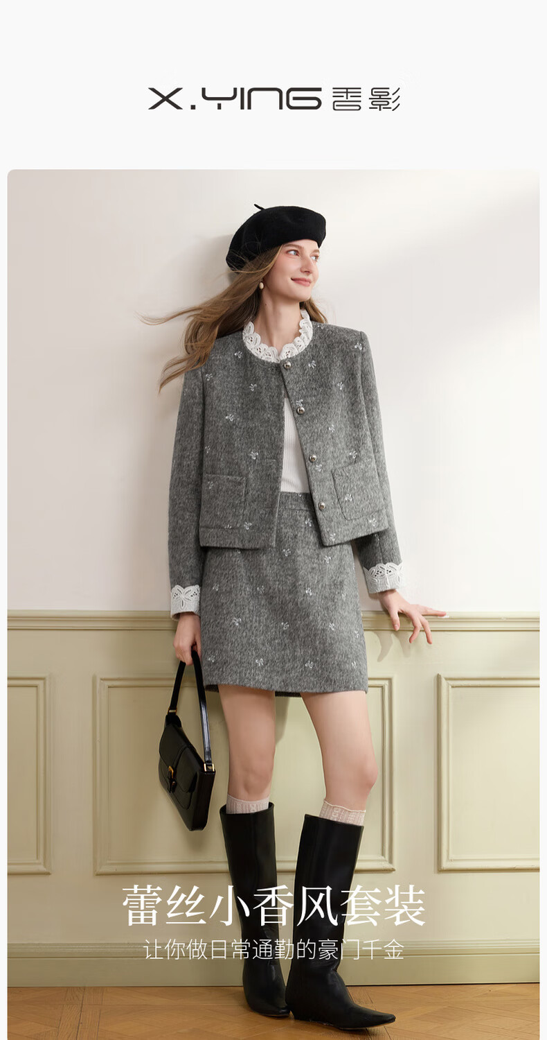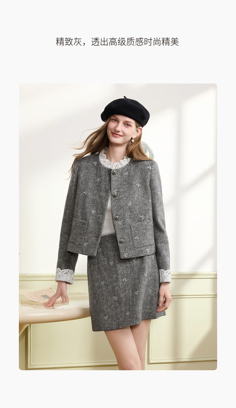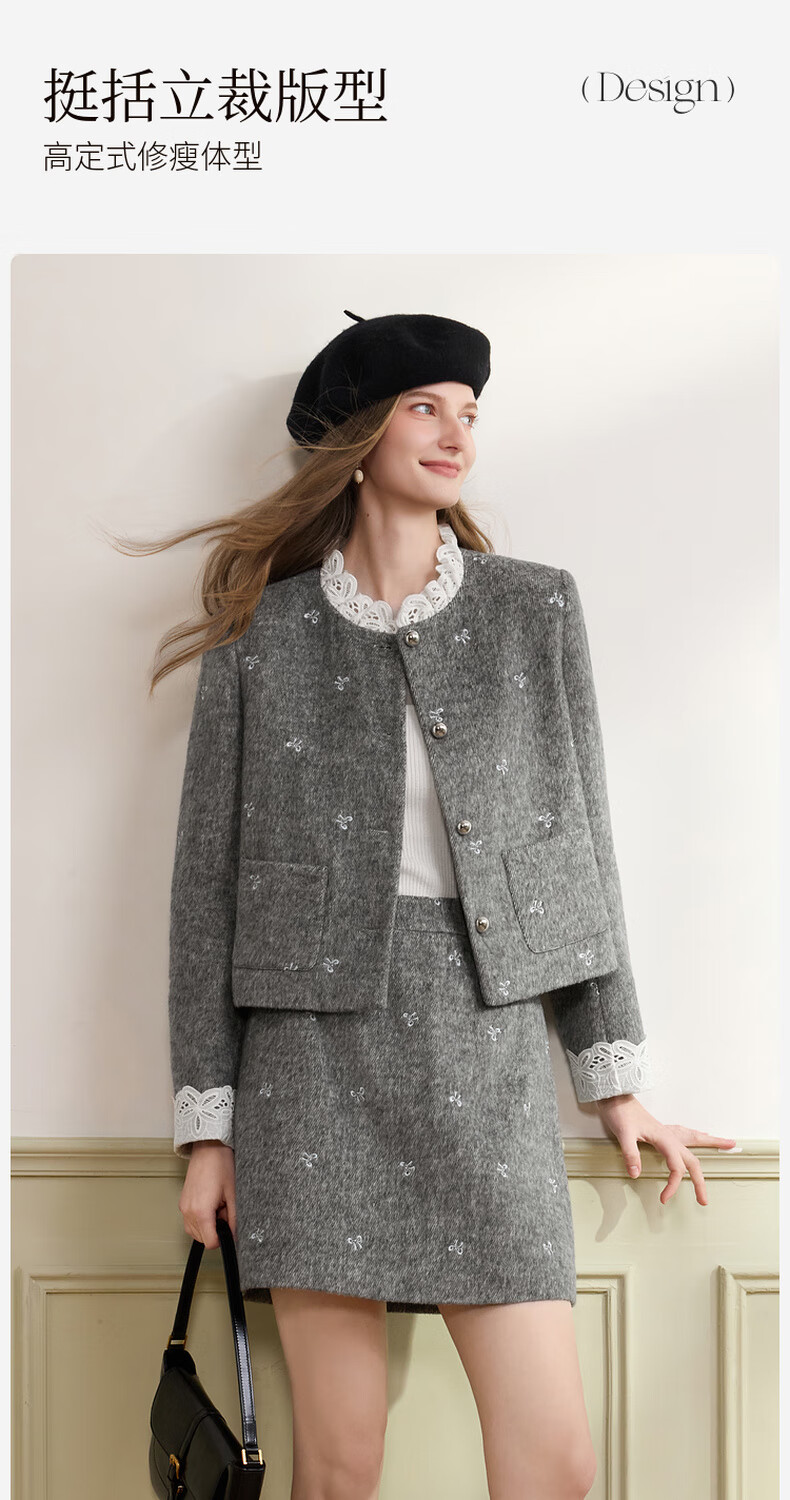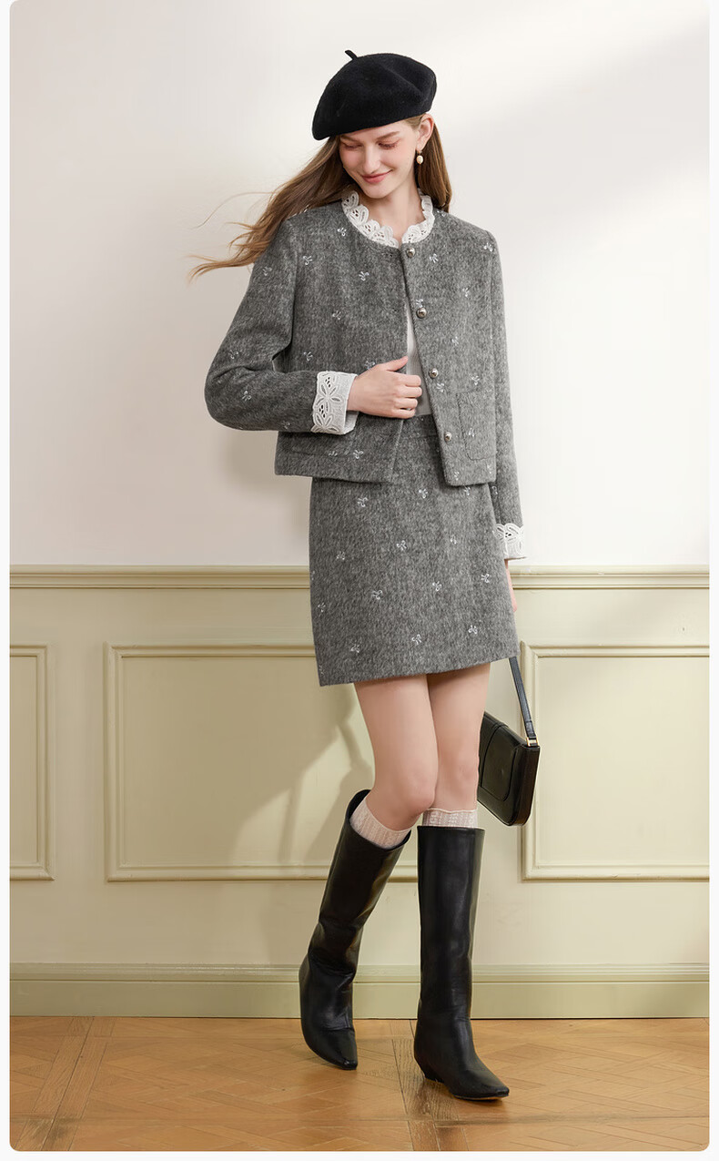 Xiangying Xiaoxiangfeng gray woolen jacket women's suit 2025 winter new miu style short skirt two-piece set light gray M