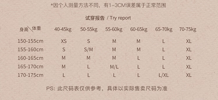 China (cm) 160-165/84-86 165-170 / 88-90 167-172 / 92-96 168-173 / 98-102 170-176 / 106-110