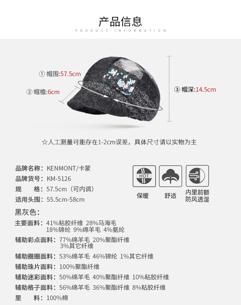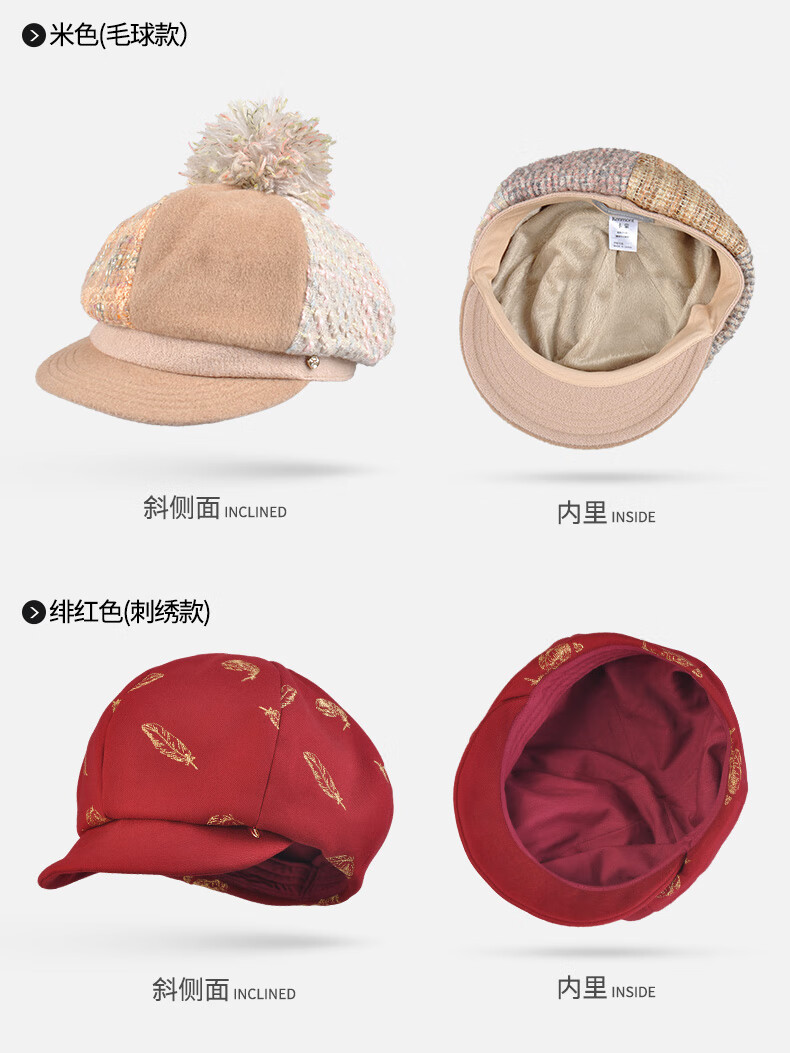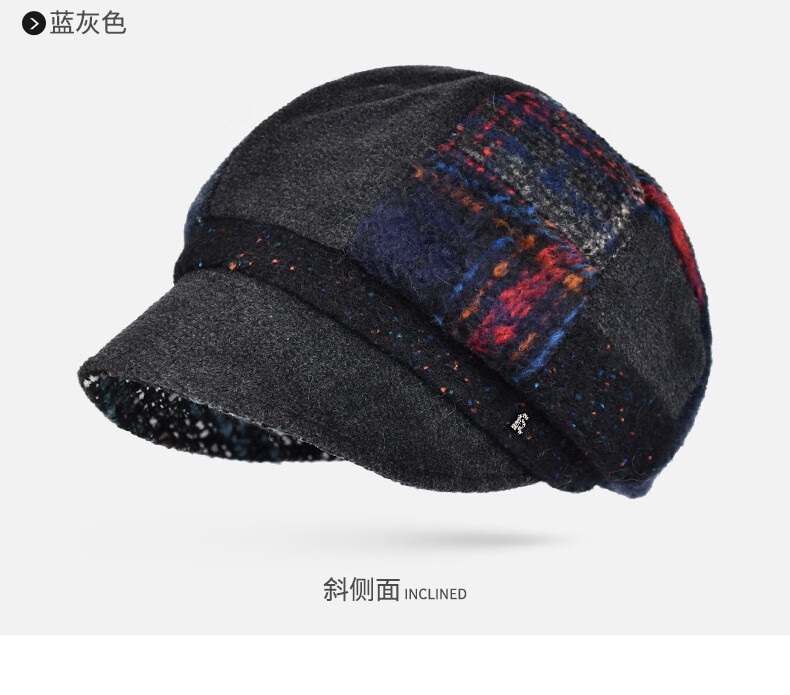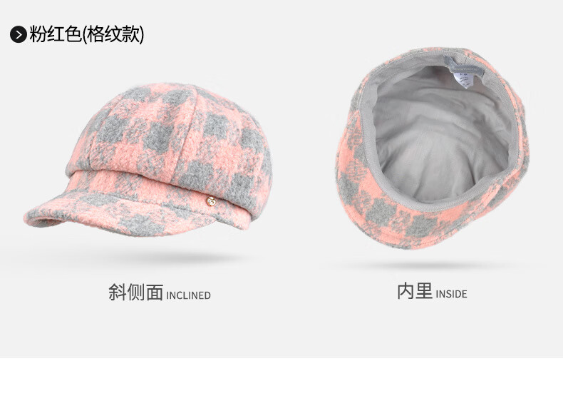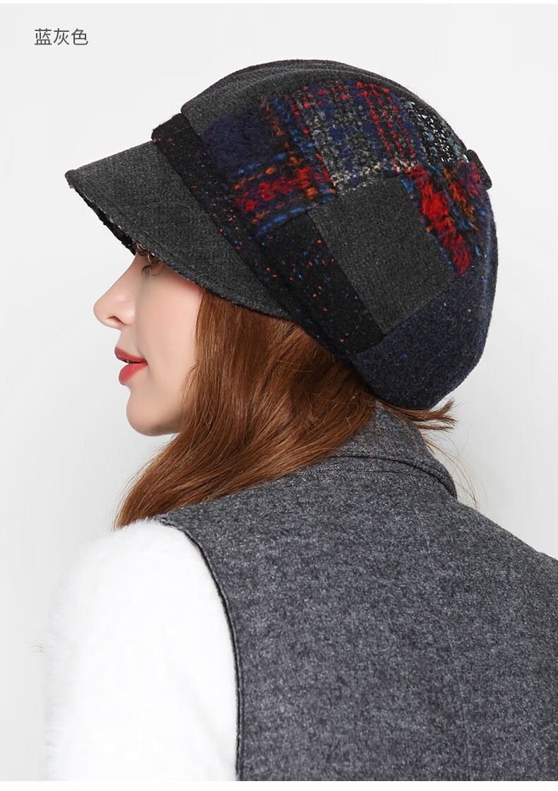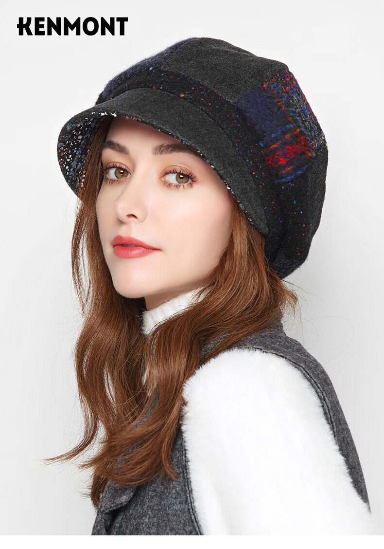 Kenmont forehead wind-resistant woolen patchwork plaid octagonal hat for women winter British autumn beret pile hat face shaping black gray (spliced style, forehead windproof film) M 57.5c (adjustable)