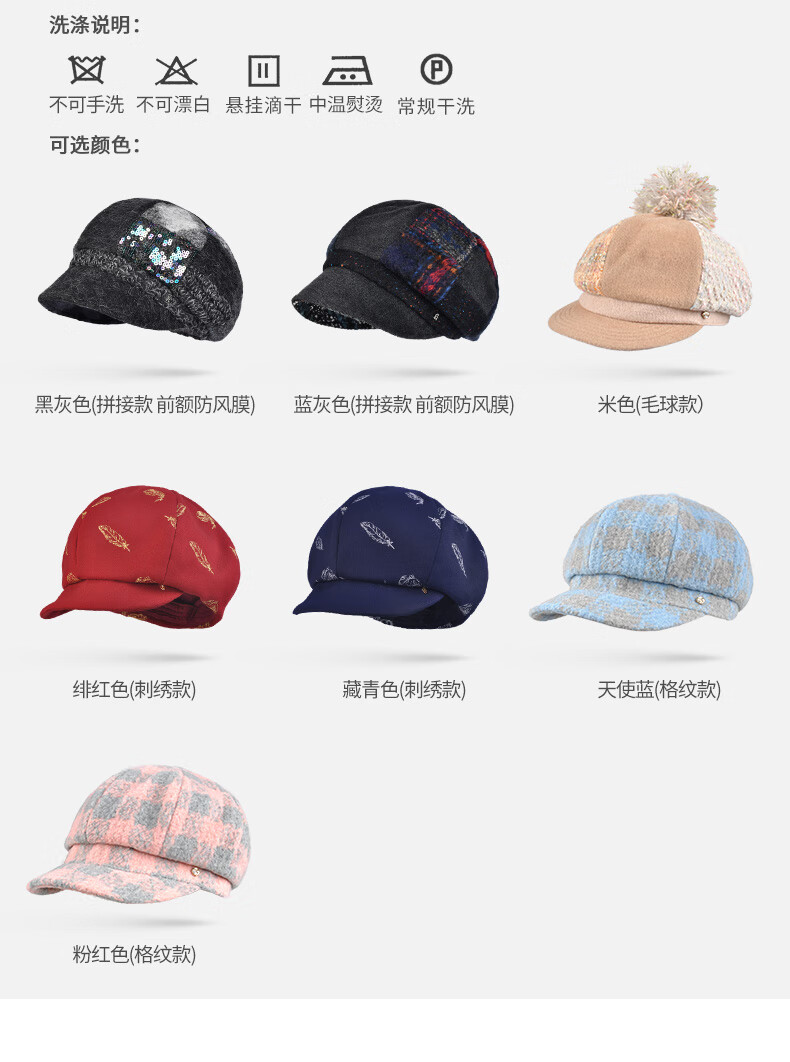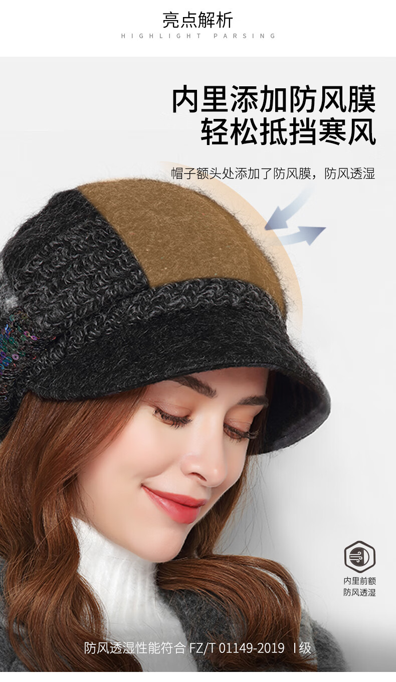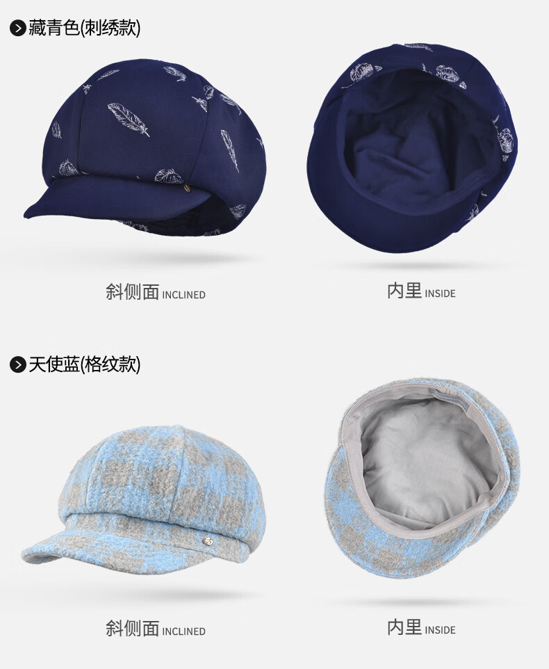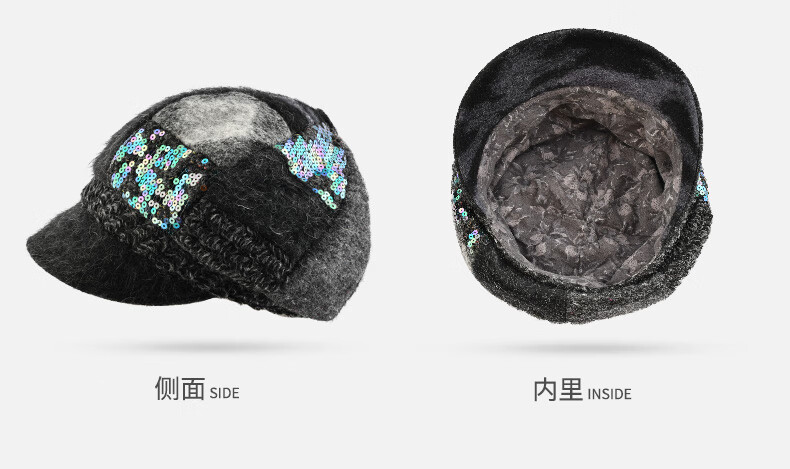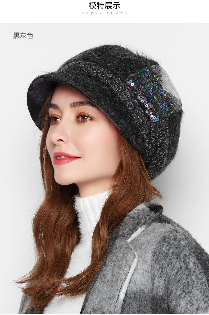 Kenmont forehead wind-resistant woolen patchwork plaid octagonal hat for women winter British autumn beret pile hat face shaping black gray (spliced style, forehead windproof film) M 57.5c (adjustable)