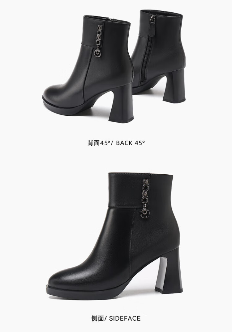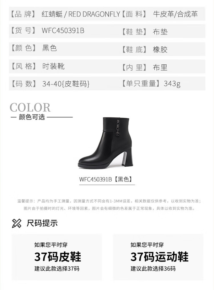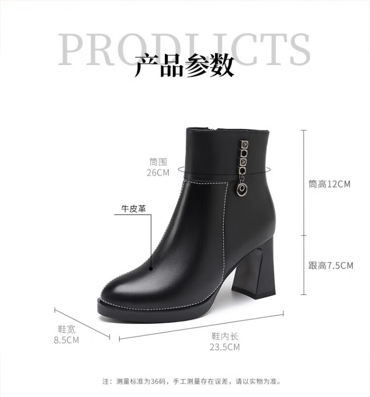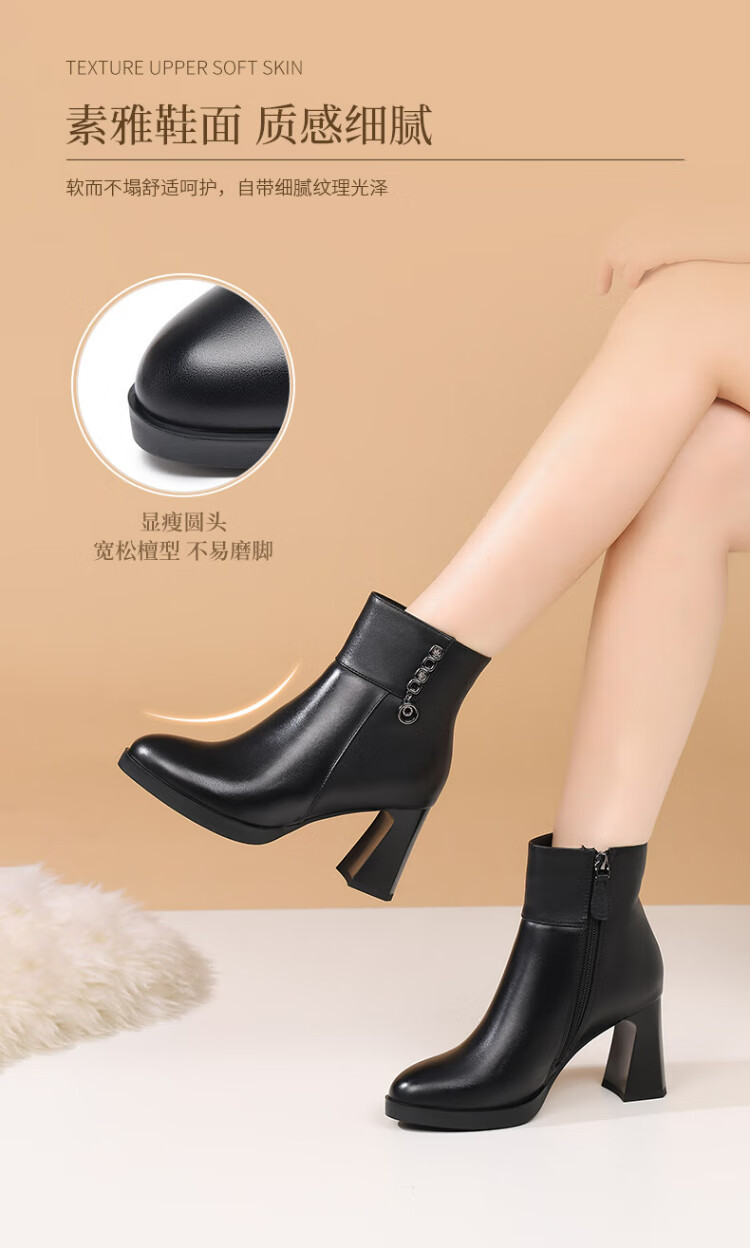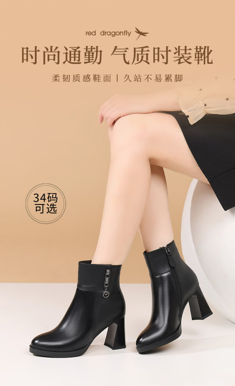 Red Dragonfly Genuine Leather Women's Boots Ankle Boots Short Boots Winter Velvet Warm French High Heel Boots Mother's Boots Slim Boots Short Boots Black Single Liner (Heel Height 7.5cm) 37