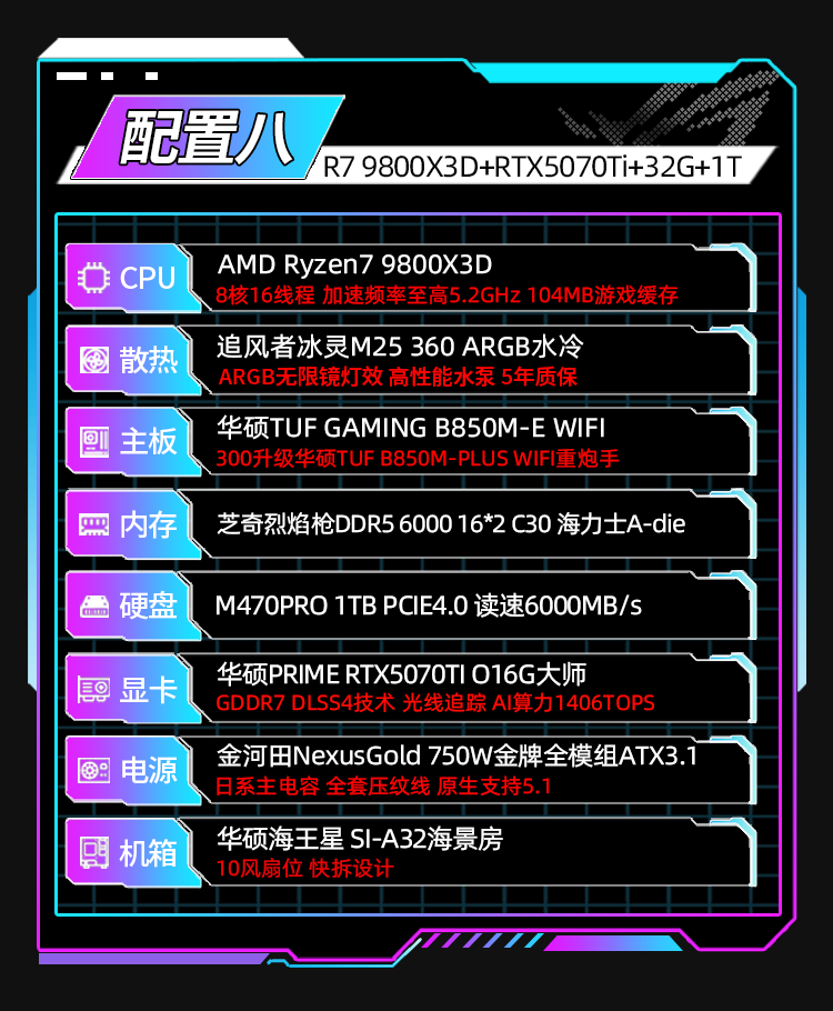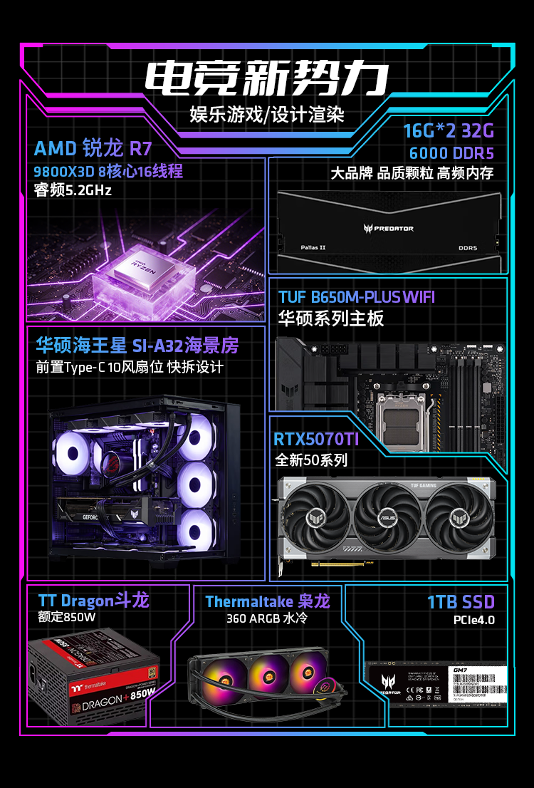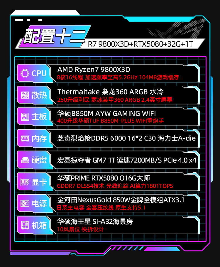 ASUS family bucket AMD R7 9800X3D host RTX5080 graphics card desktop computer high-end complete machine game editing modeling rendering DIY assembly machine configuration four 9800X3D+48G+2T+X870 Fuxue