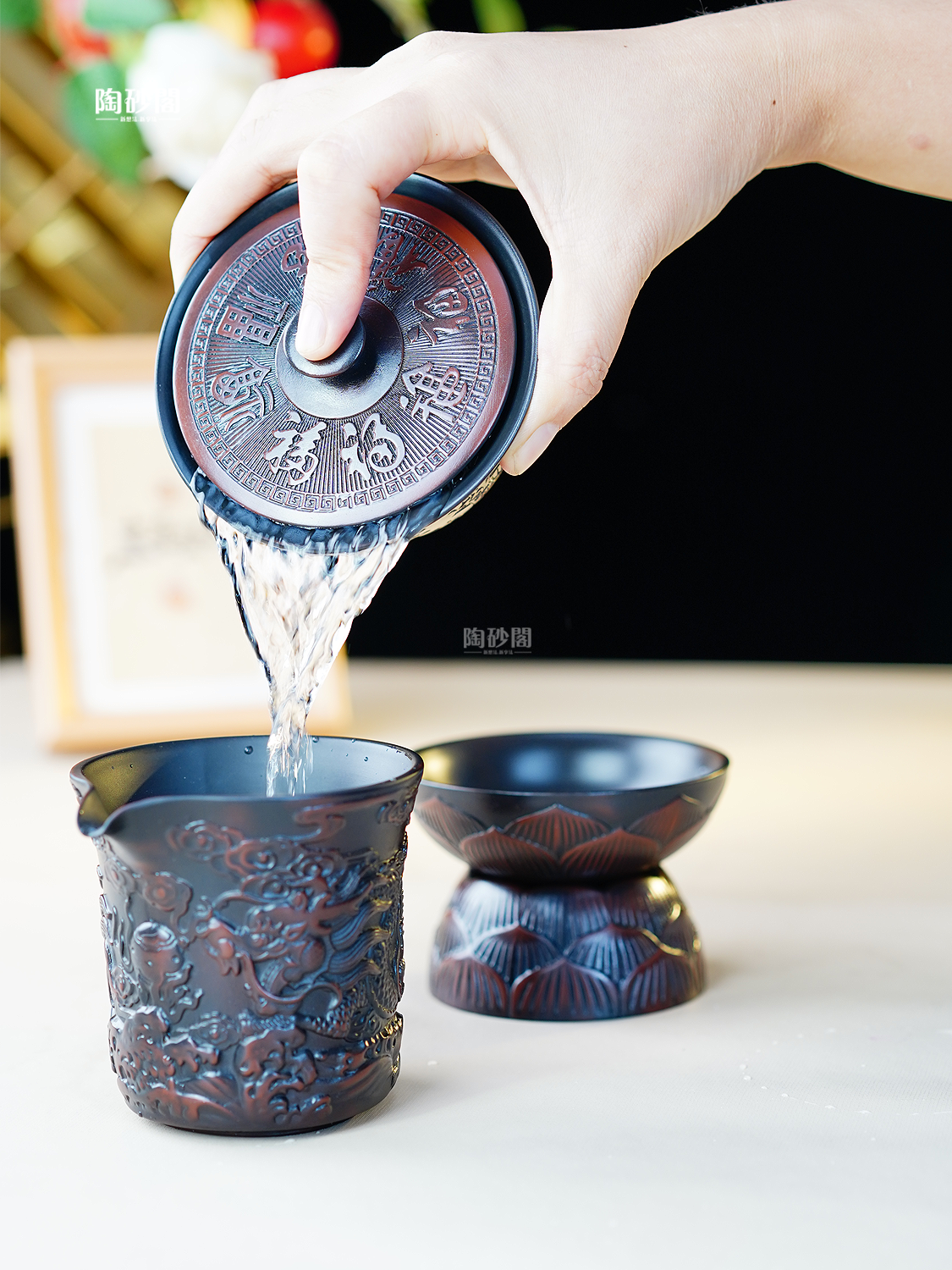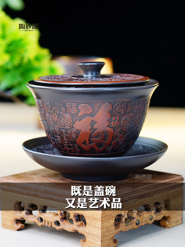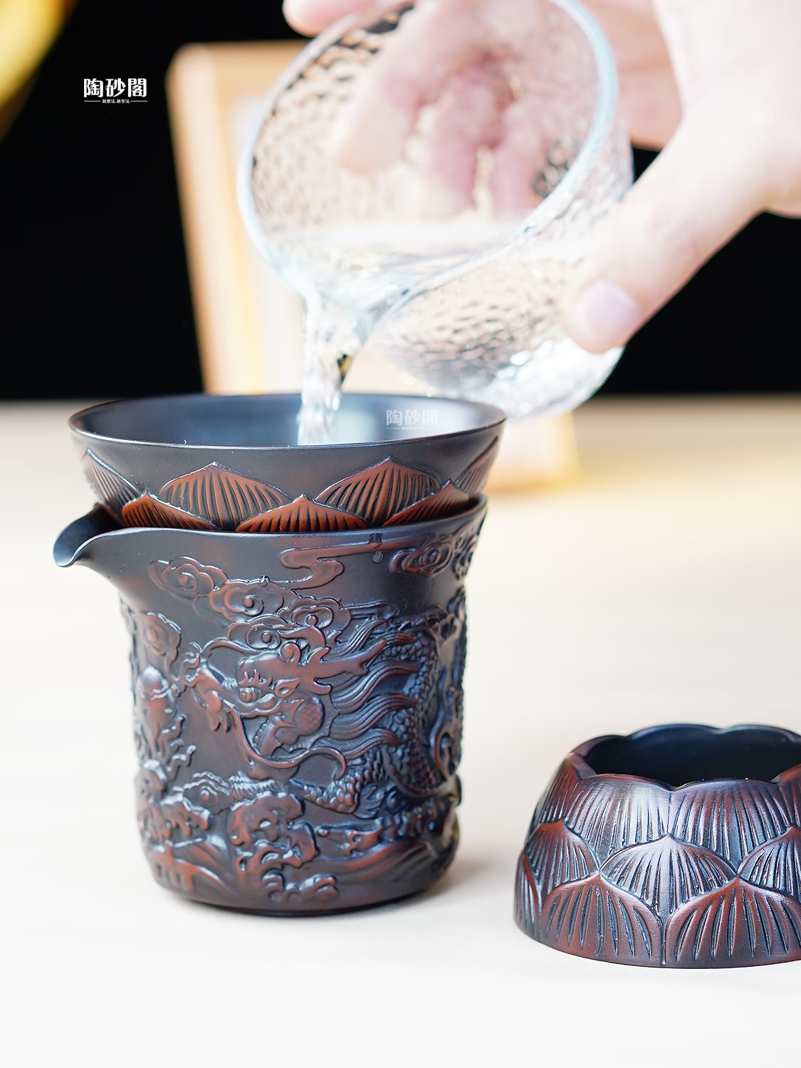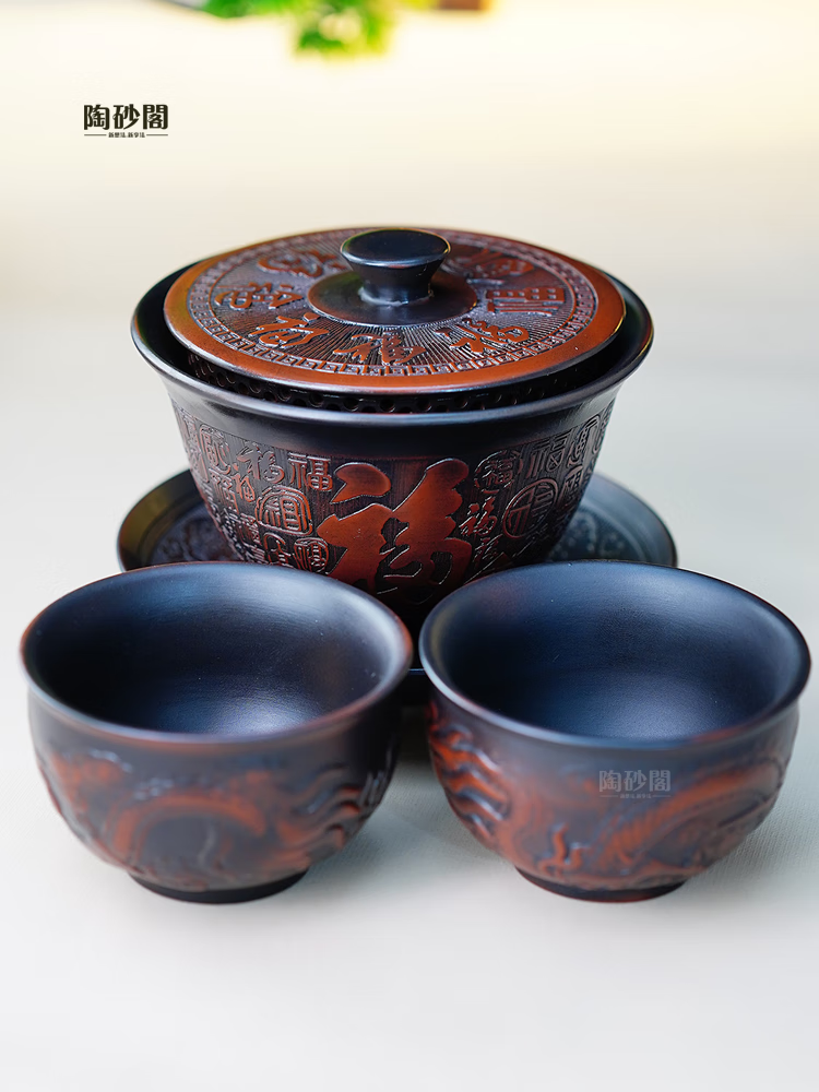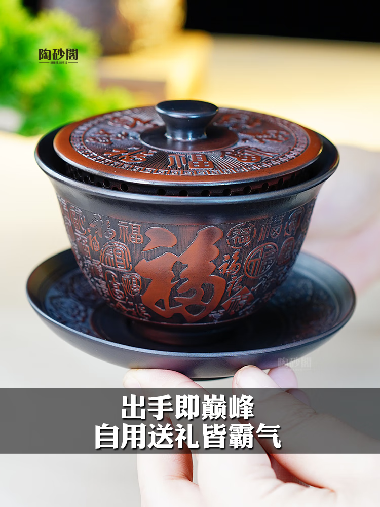 Purple pottery three-cai bowl tea set, non-hot, high-end three-piece tea set, high-end light luxury purple sand tea set, Pfaff genuine purple pottery three-cai bowl 1 piece