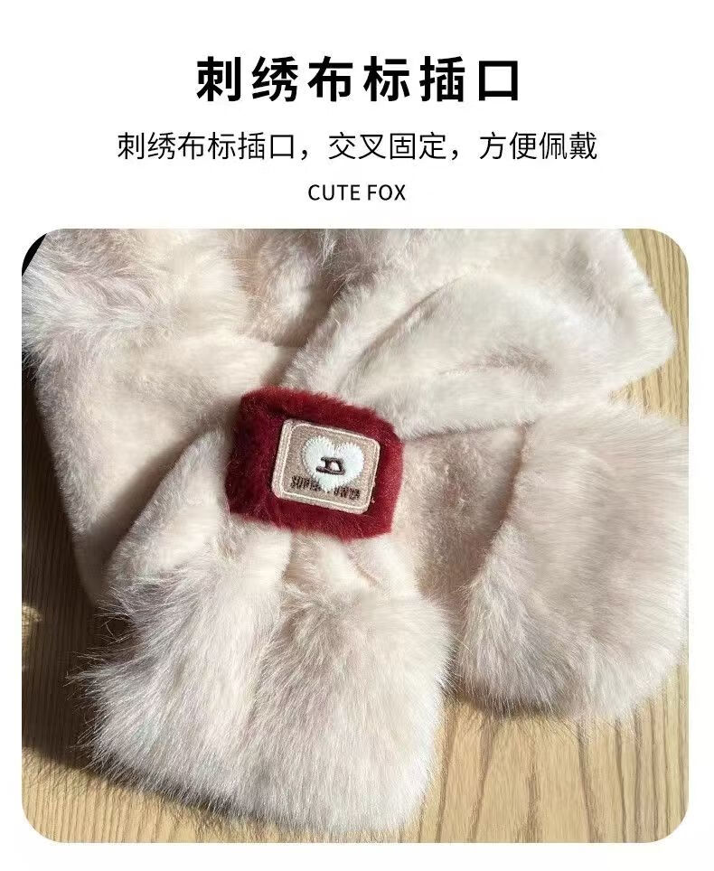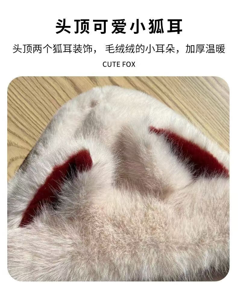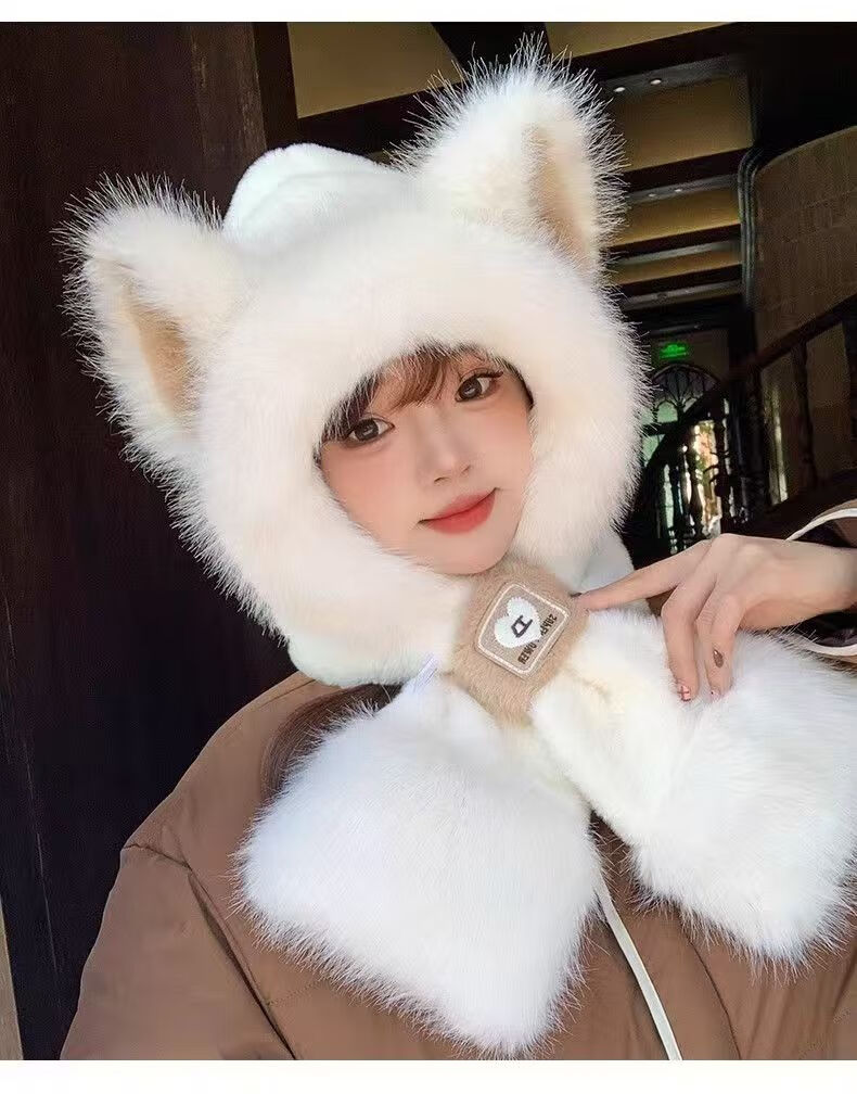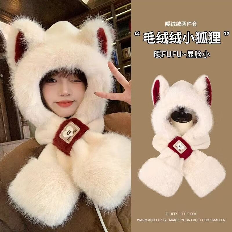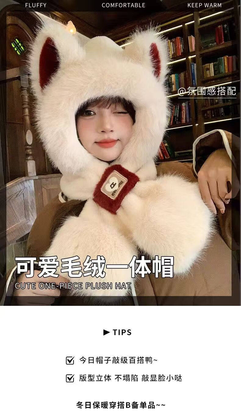 Hat Women's New Autumn and Winter Scarf One-piece Hat Cute Furry Cycling Thickening Warm Protection Love Two-piece Set-Beige One Size