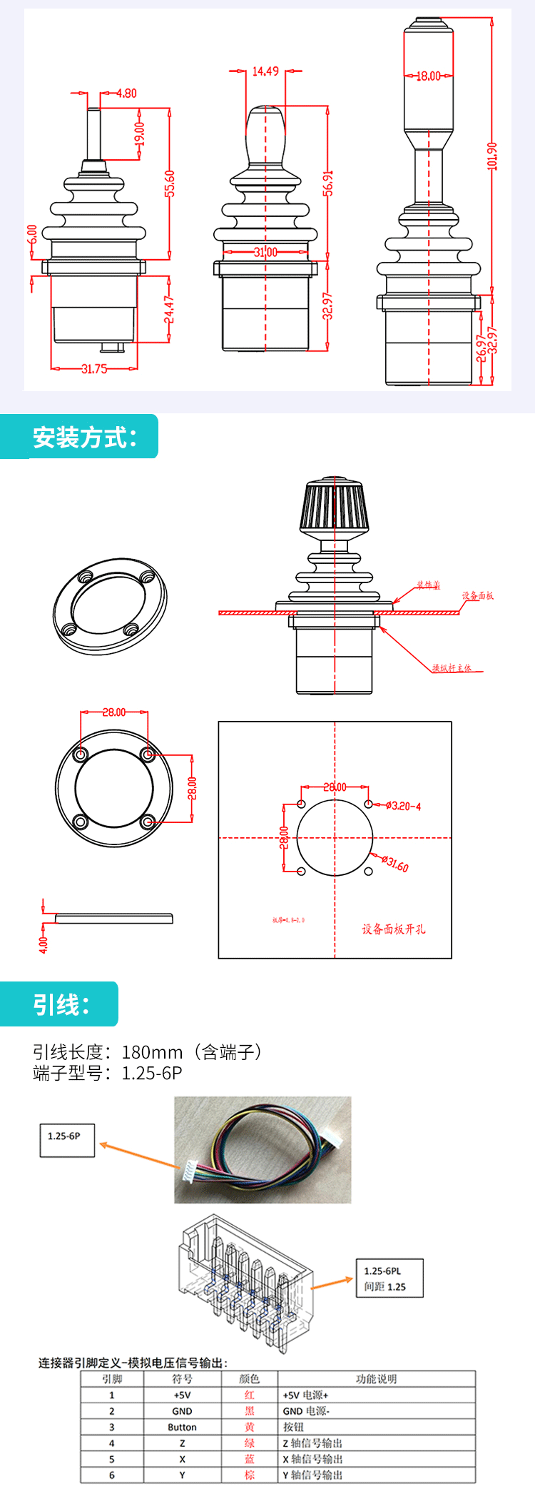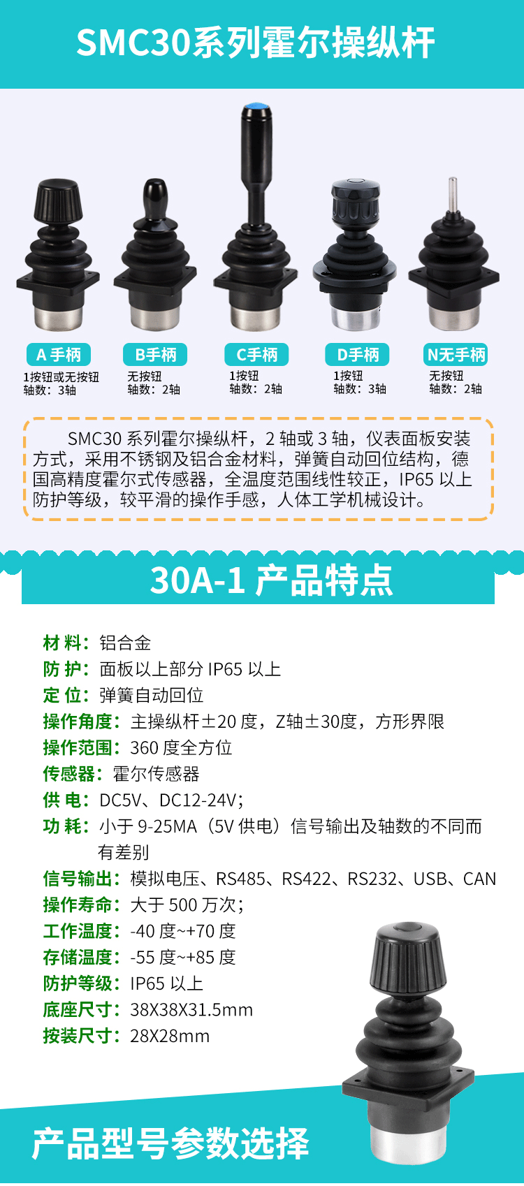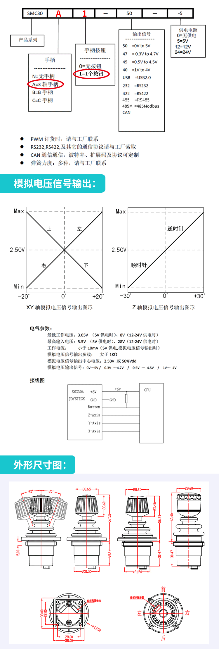 SMC30A1 Industrial Hall Joystick Industrial Control Rod Industrial Rocker Industrial Three-Axis Rocker Handle Head + Press Power Supply DC5V Output 1--4V