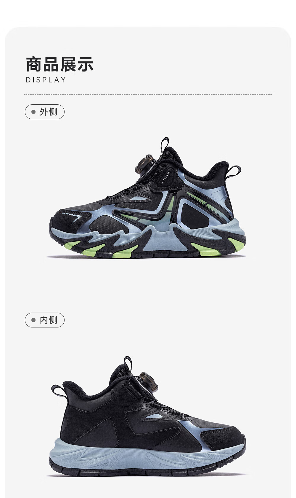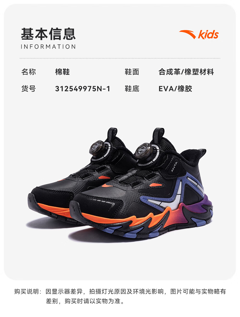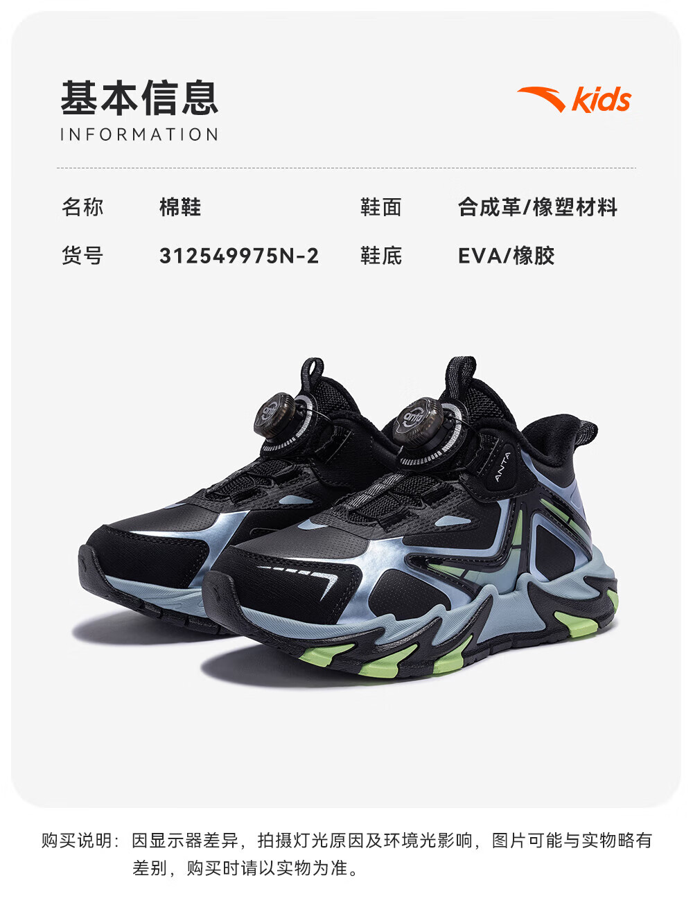 ANTA Children's Cotton Shoes for Boys Dengfeng 3 New Knob Buckle Leather Water-Repellent Cotton Shoes 312549975N Black/Metallic Blue-2 32
