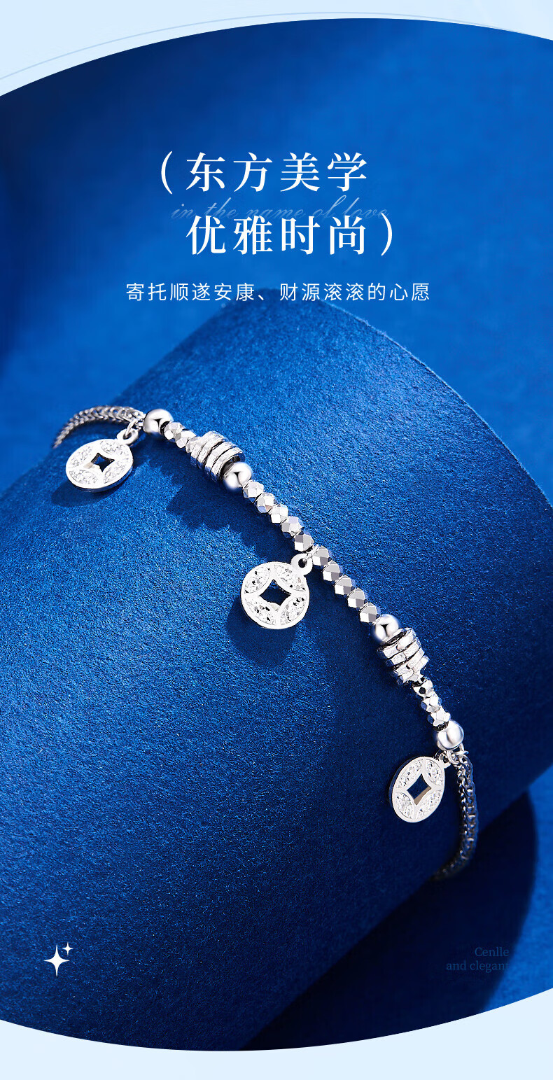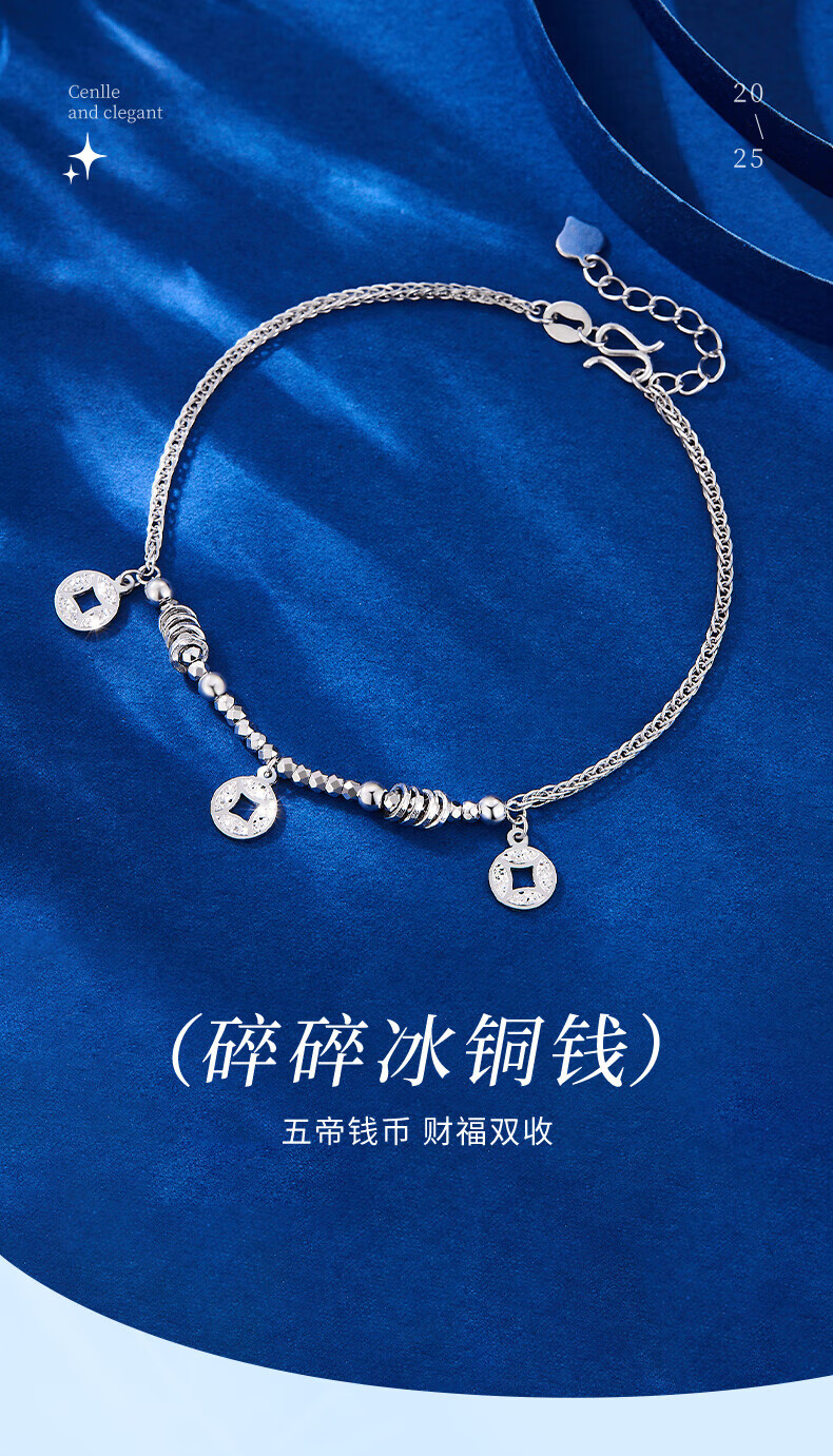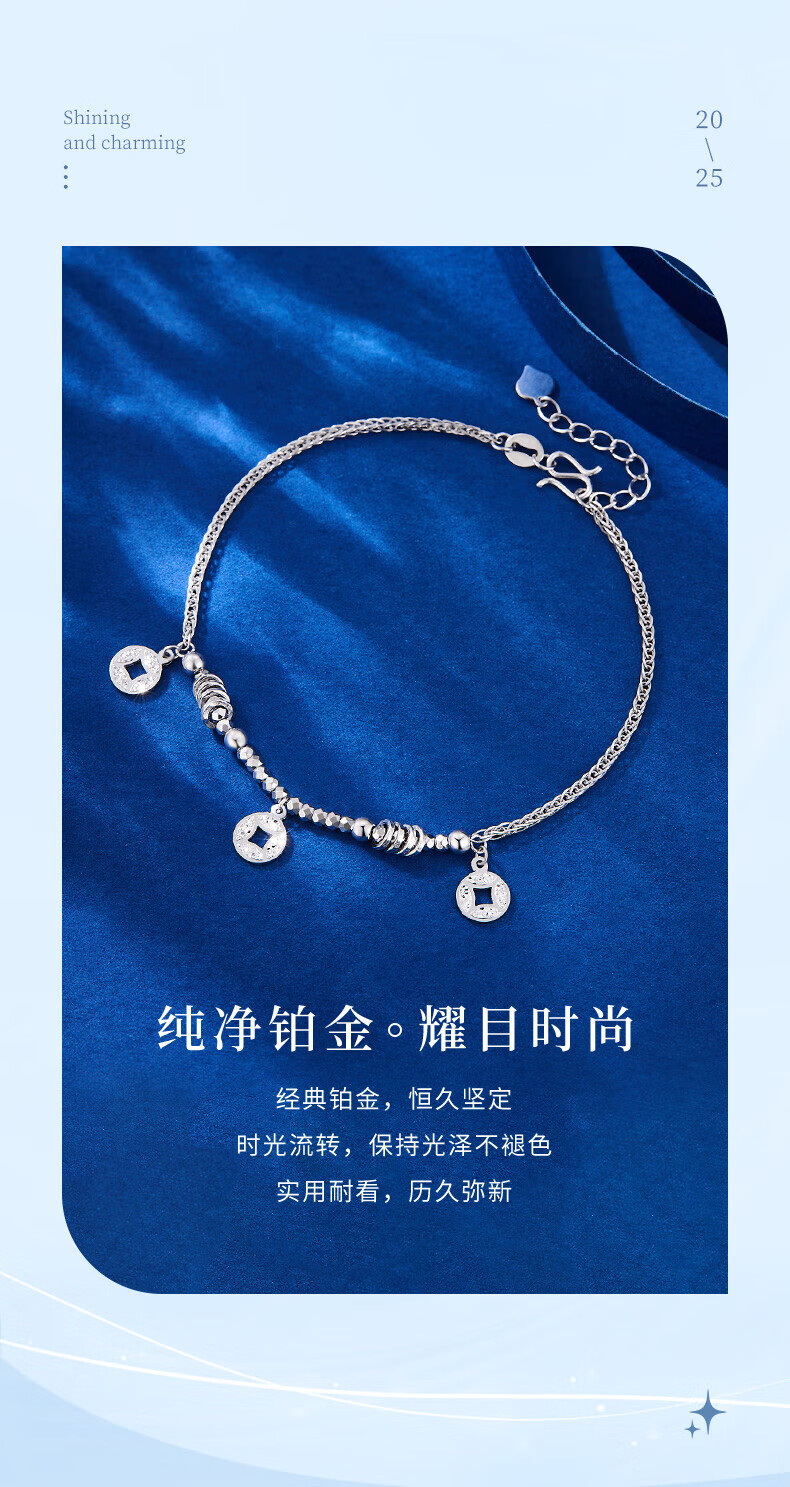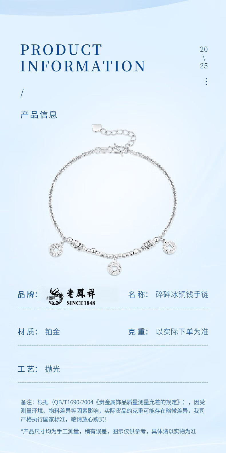 Lao Fengxiang pt950 platinum crushed ice copper coin bracelet for women, white money and Duoduo jewelry, Valentine's Day birthday gift for girlfriend, platinum crushed ice copper coin bracelet, about 5.3g, brand gift box