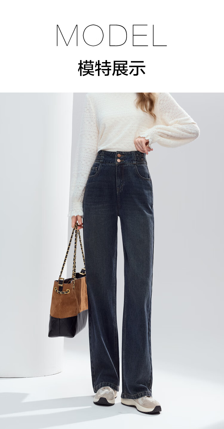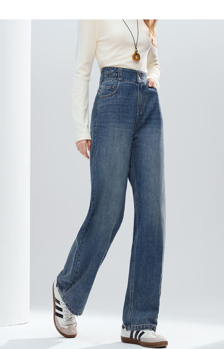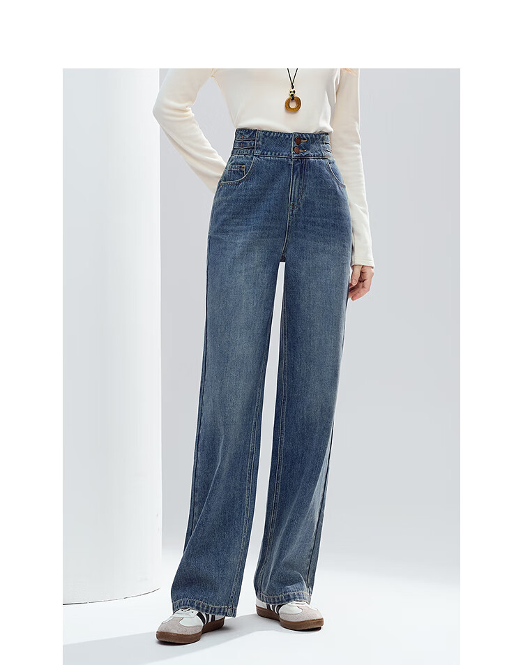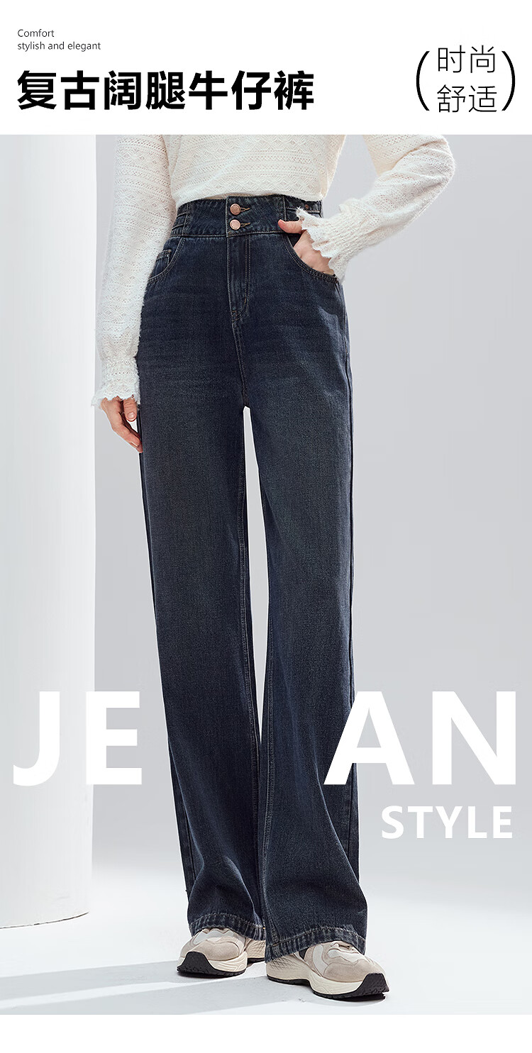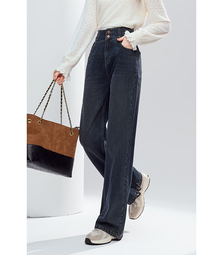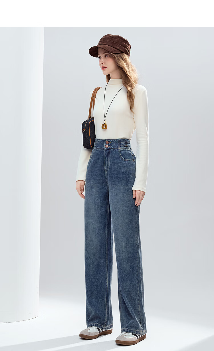 Betu Women's 2025 Winter New Denim Wide Leg Pants Retro Washed High Waist Slim Cotton Feel Pants 2510T86 Dark Denim Blue L