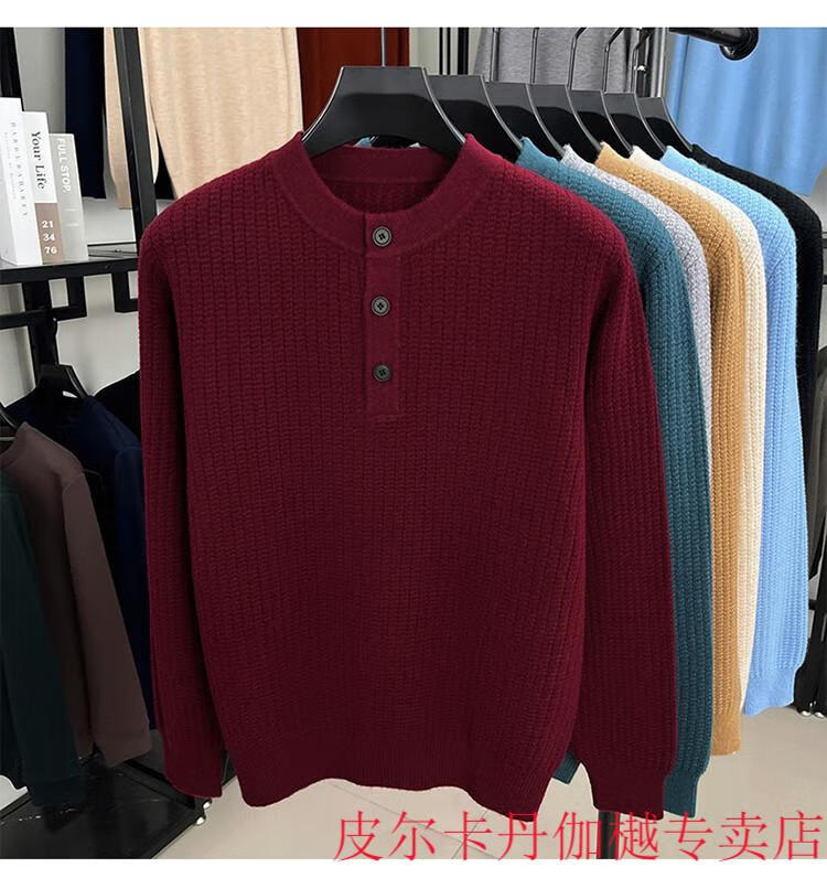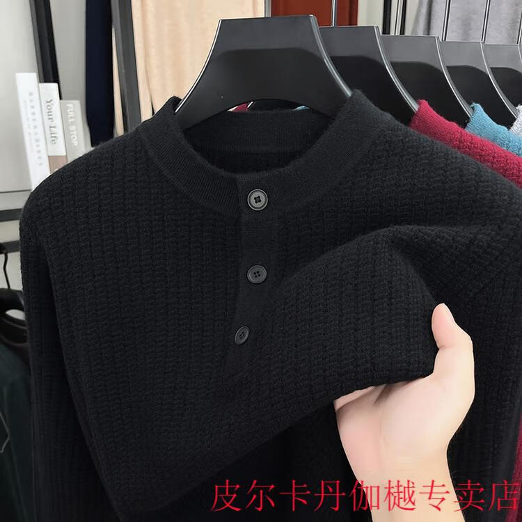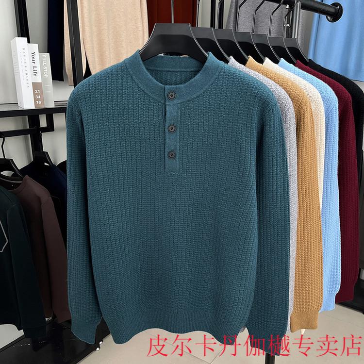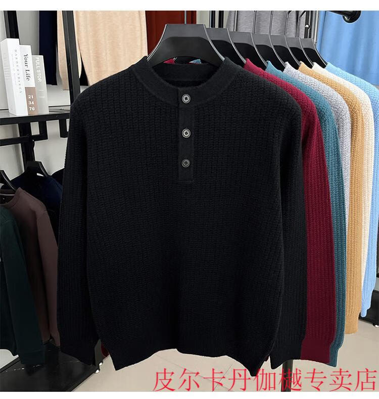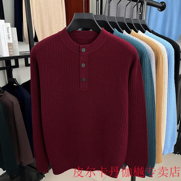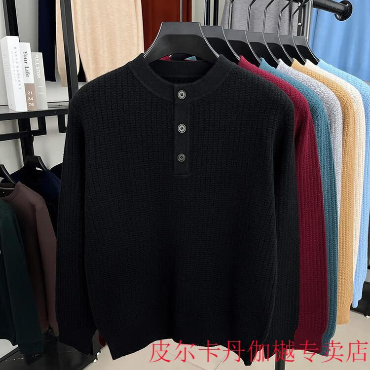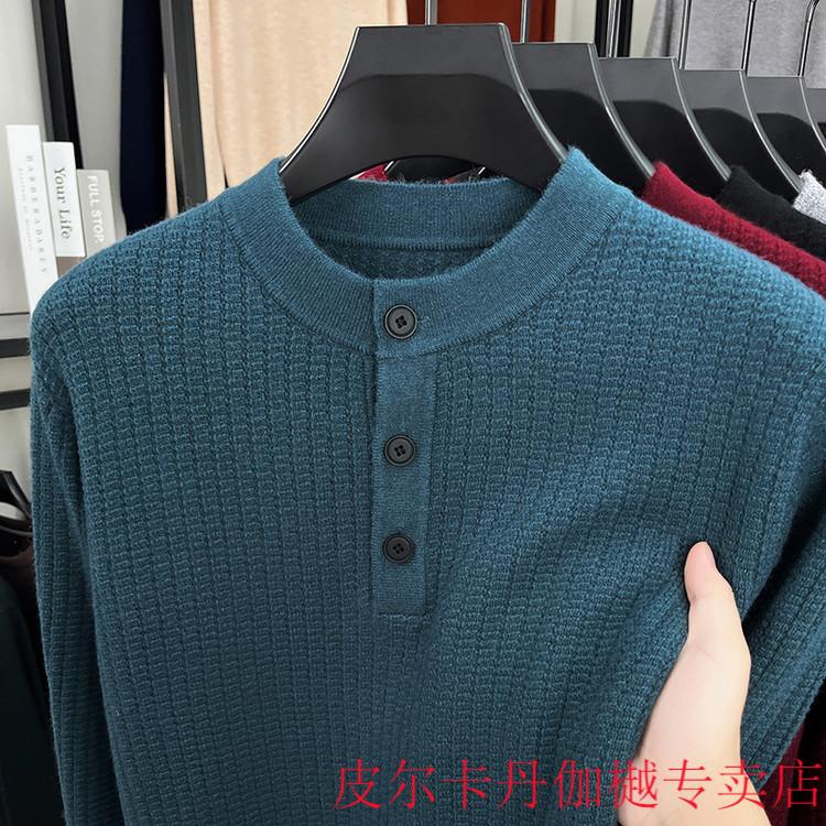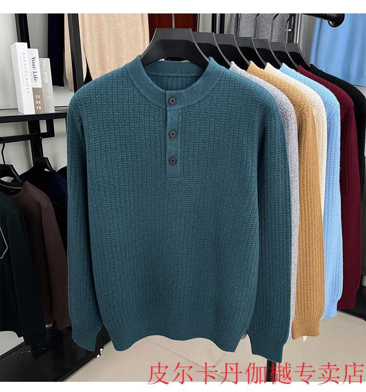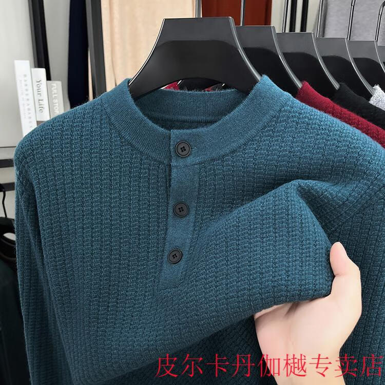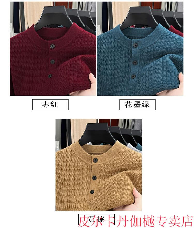 Pierre Cardin thickened sweater men's autumn and winter middle-aged casual cardigan Henry collar pullover knitted bottoming sweater warm and trendy floral dark green one size 105