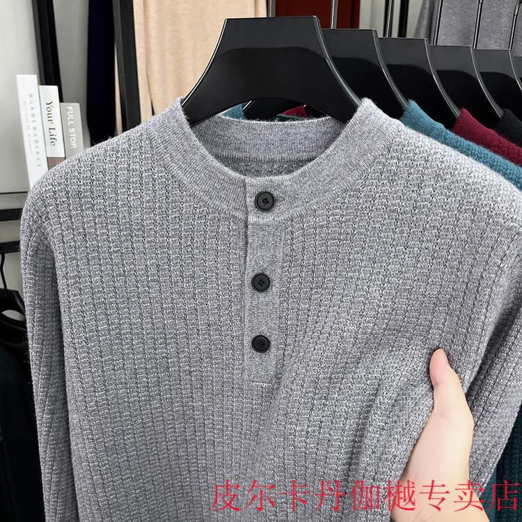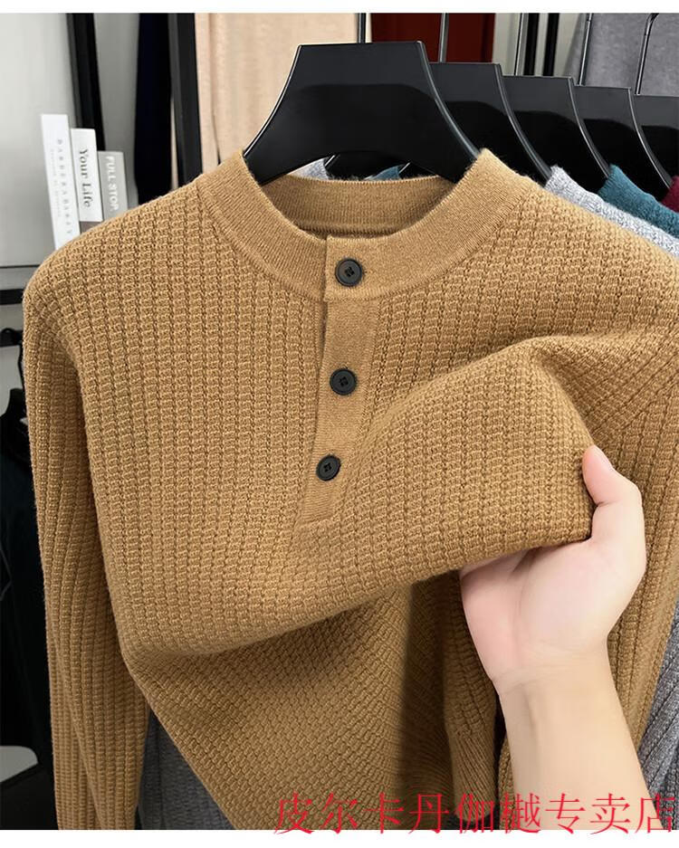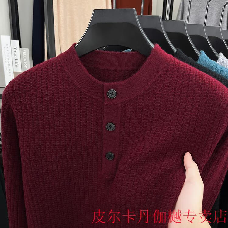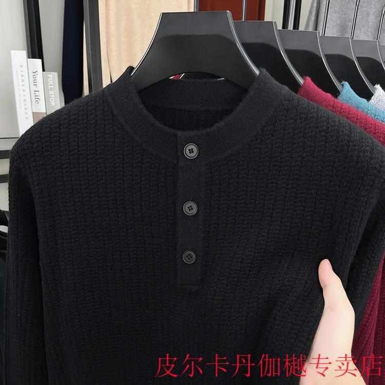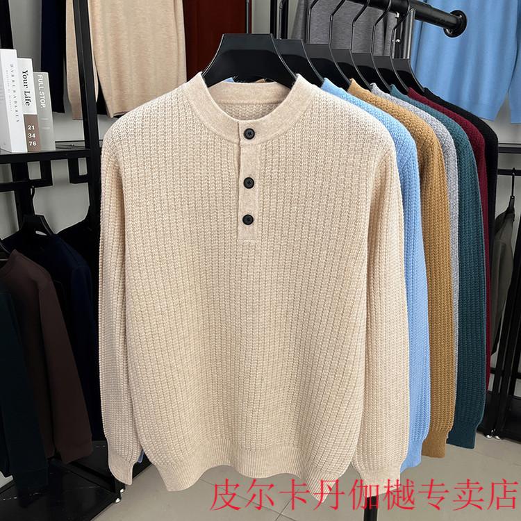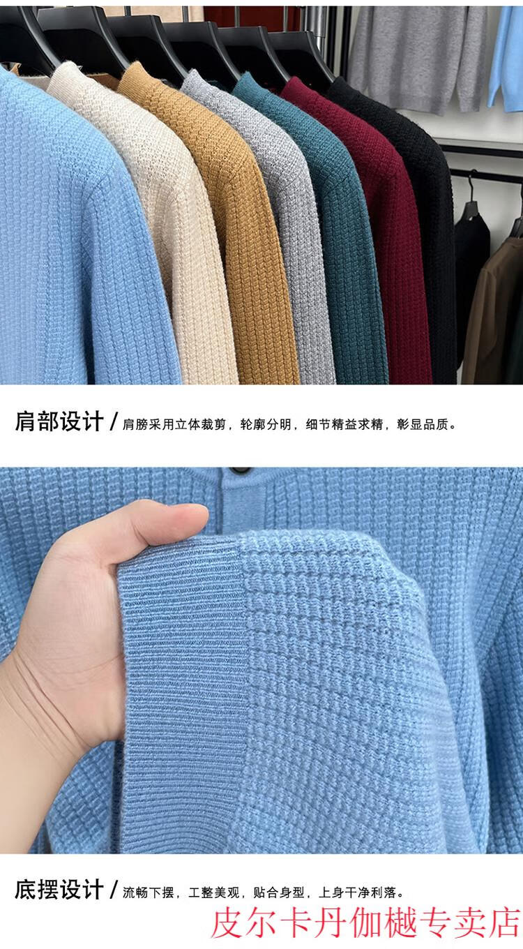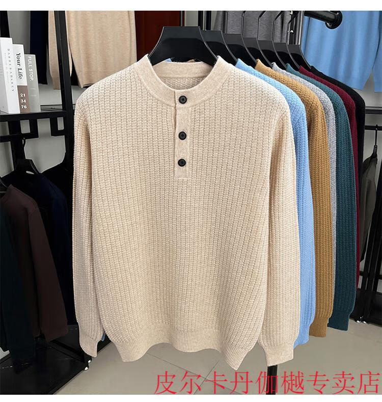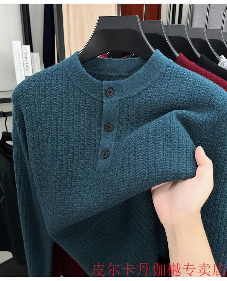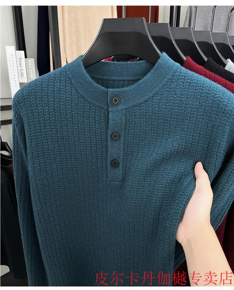 Pierre Cardin thickened sweater men's autumn and winter middle-aged casual cardigan Henry collar pullover knitted bottoming sweater warm and trendy floral dark green one size 105