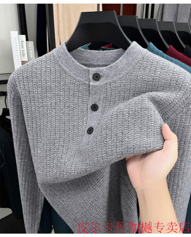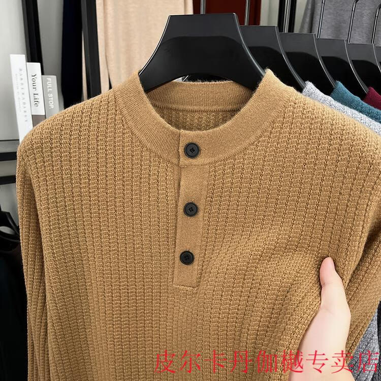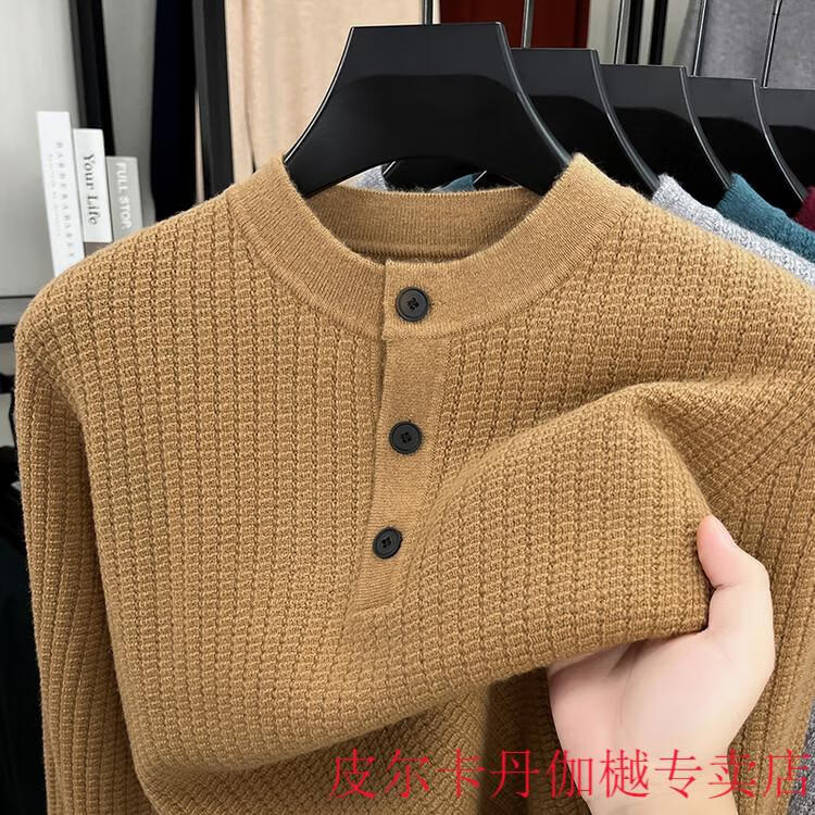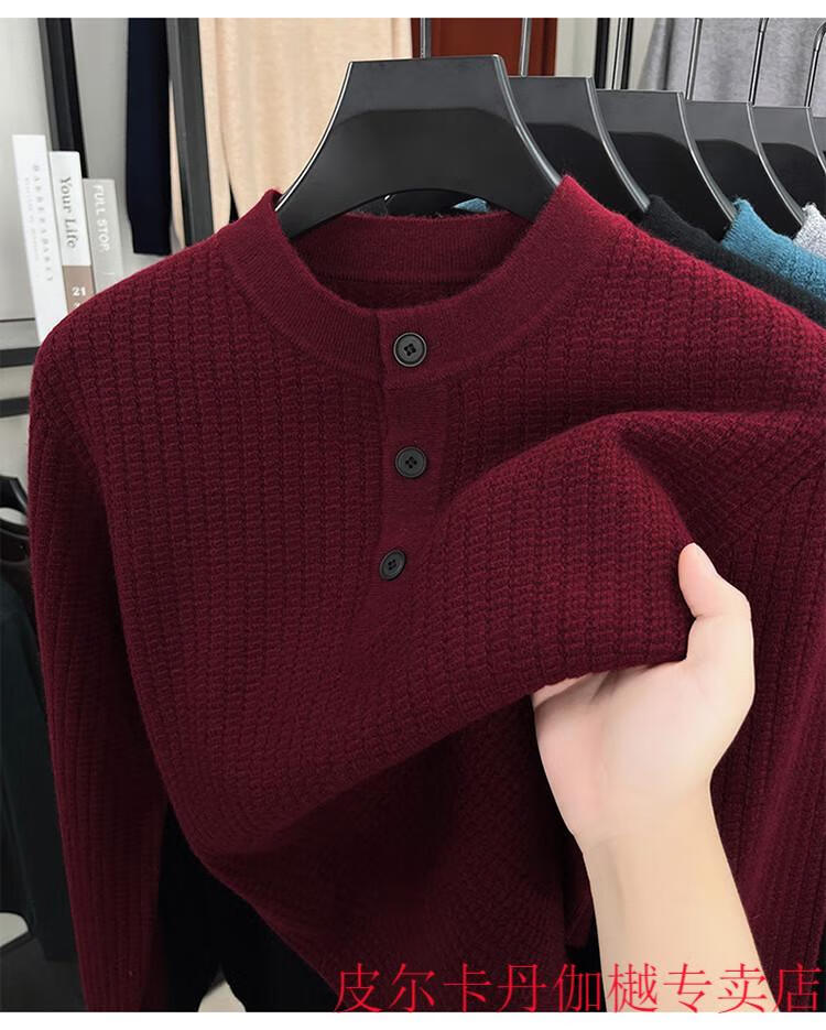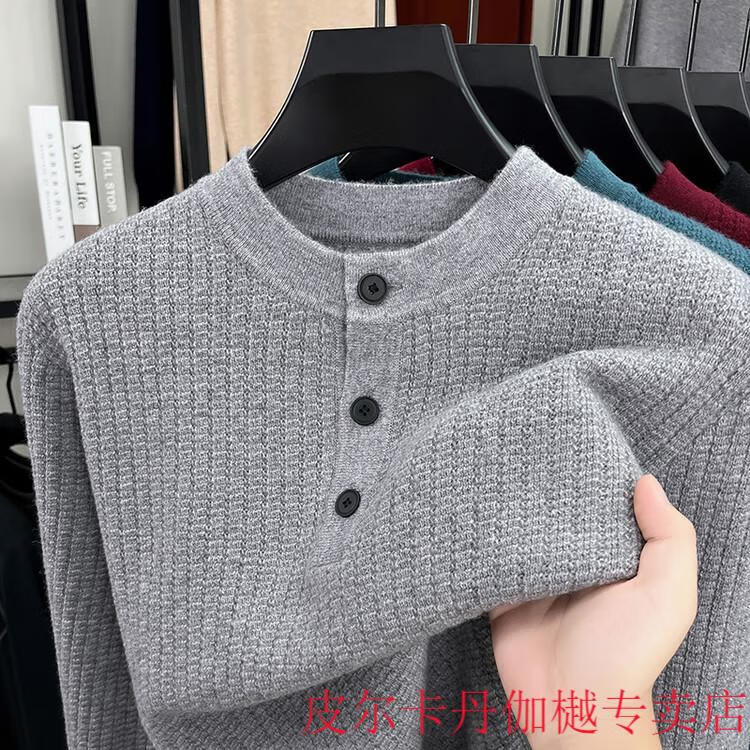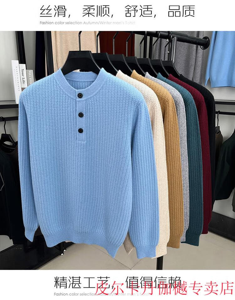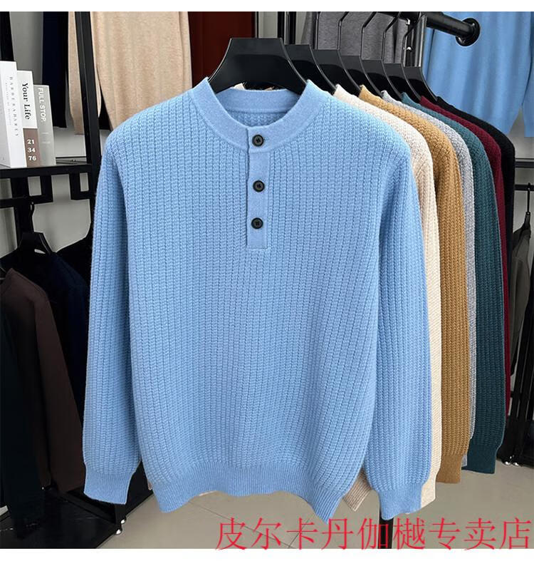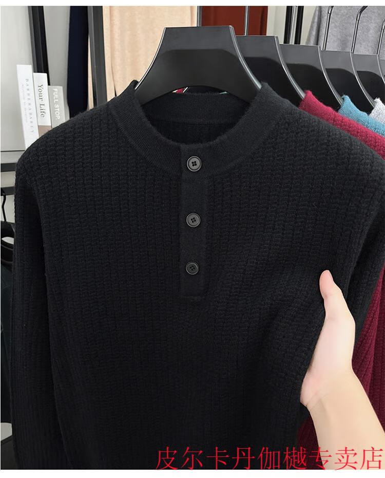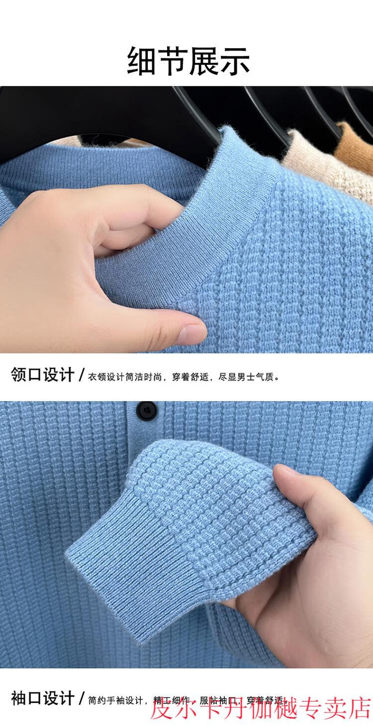 Pierre Cardin thickened sweater men's autumn and winter middle-aged casual cardigan Henry collar pullover knitted bottoming sweater warm and trendy floral dark green one size 105