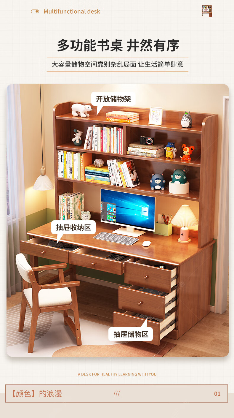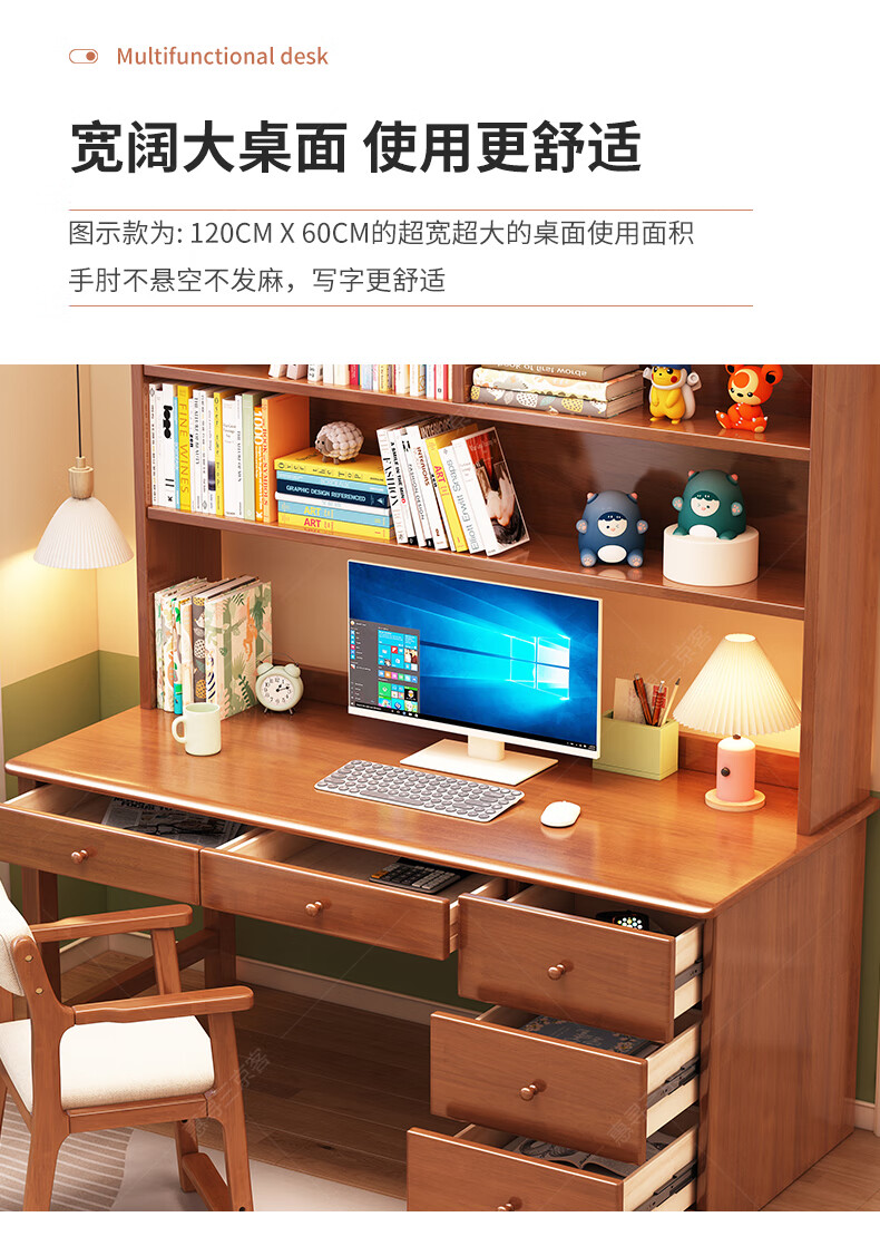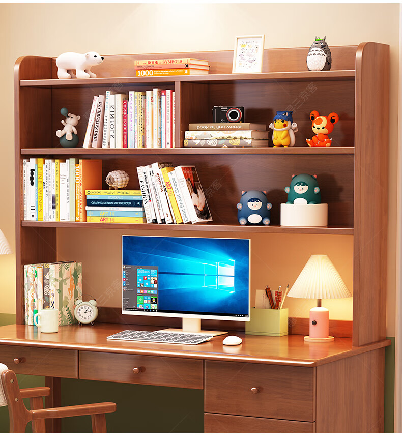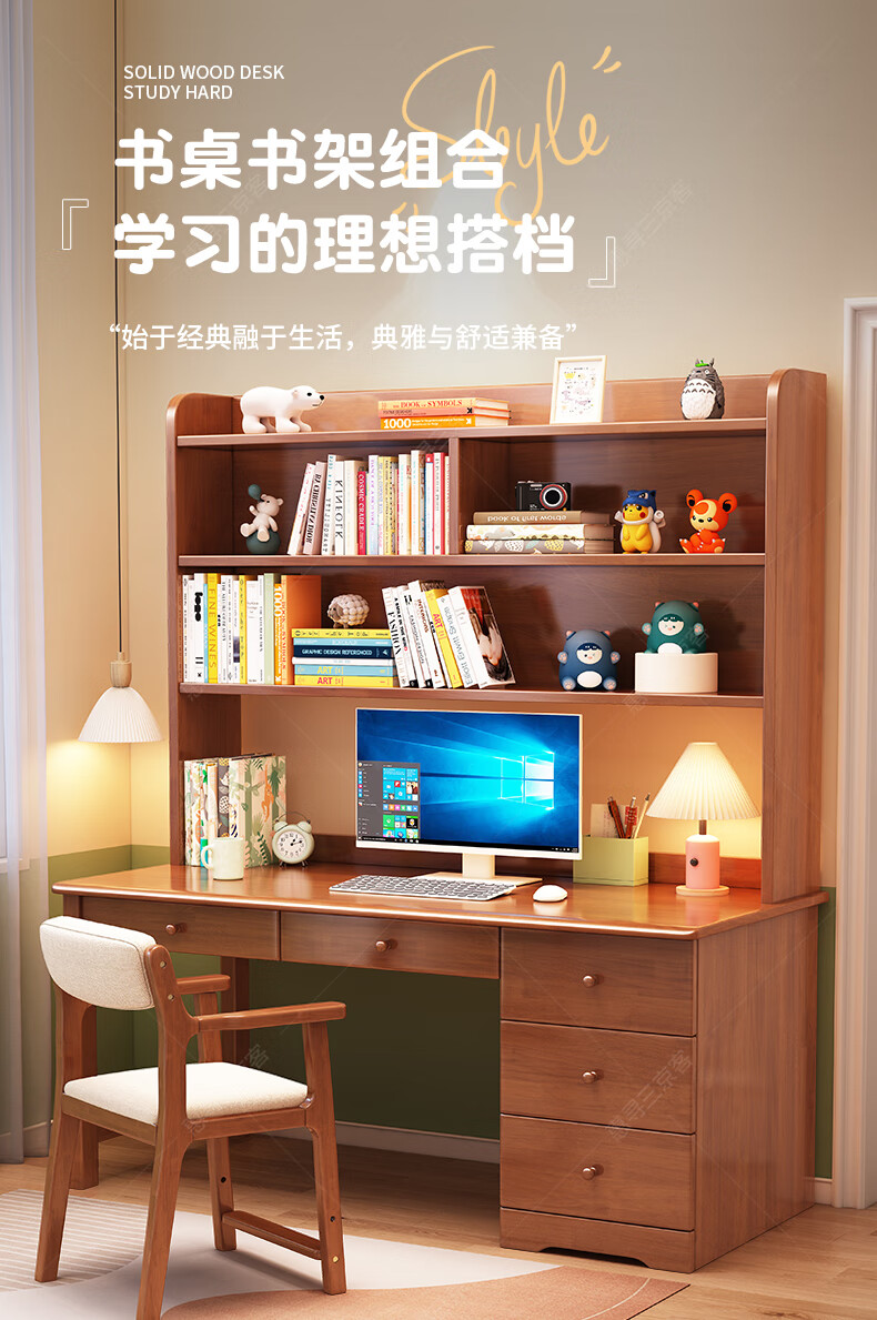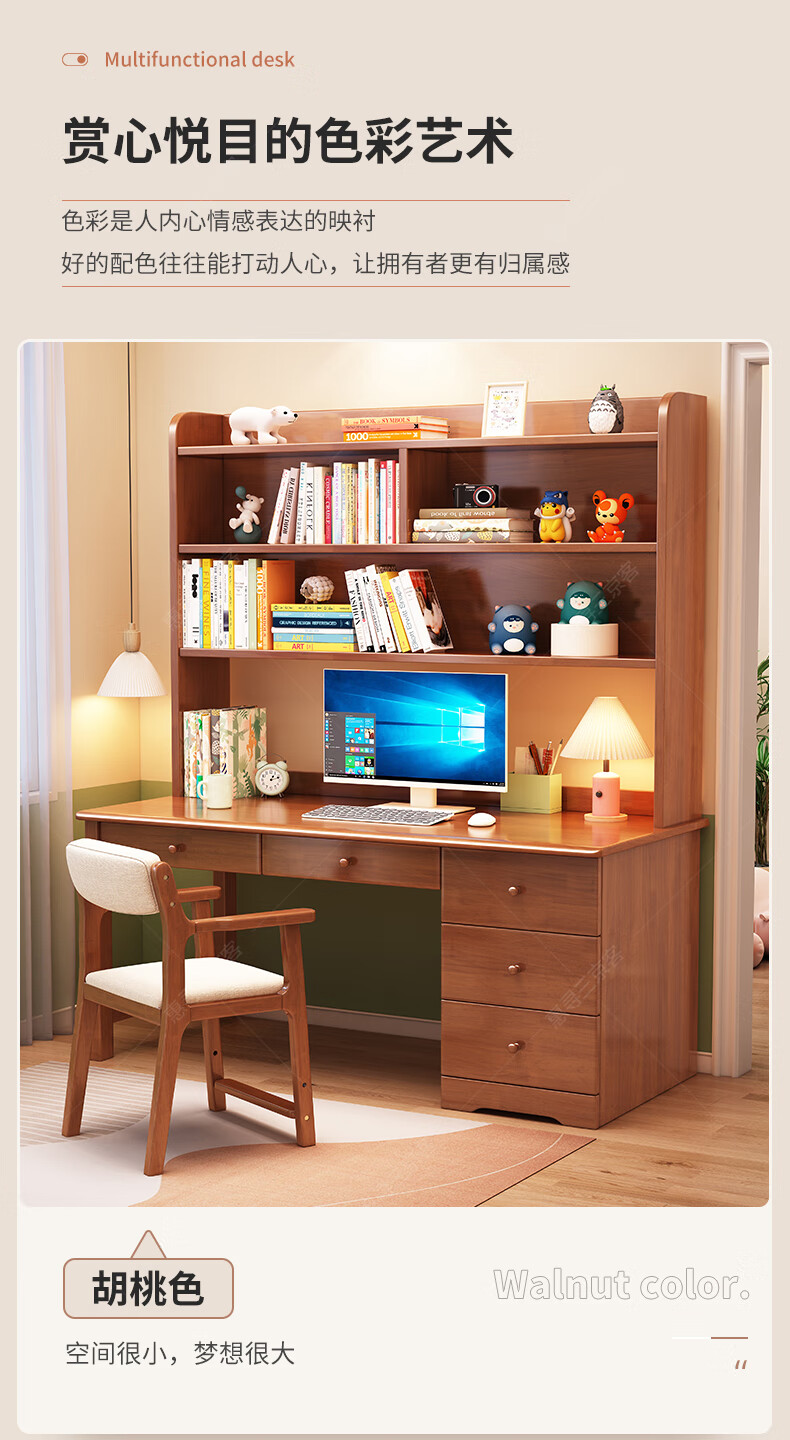 Huixun solid wood desk bookcase bookshelf combination computer desk bedroom home student writing desk multi-functional children's study table walnut color #desk + bookshelf 100cm*60cm*75cm total height 185cm