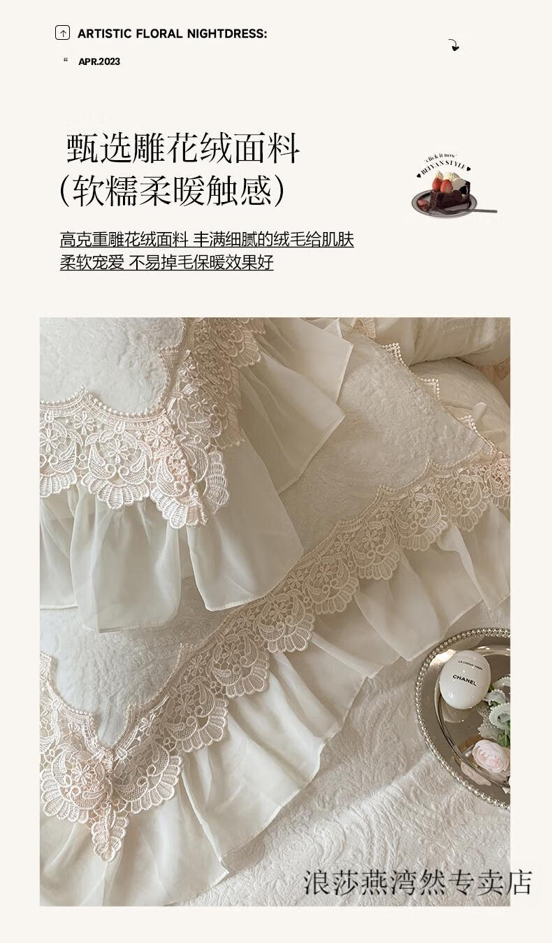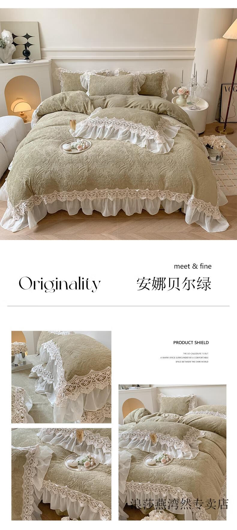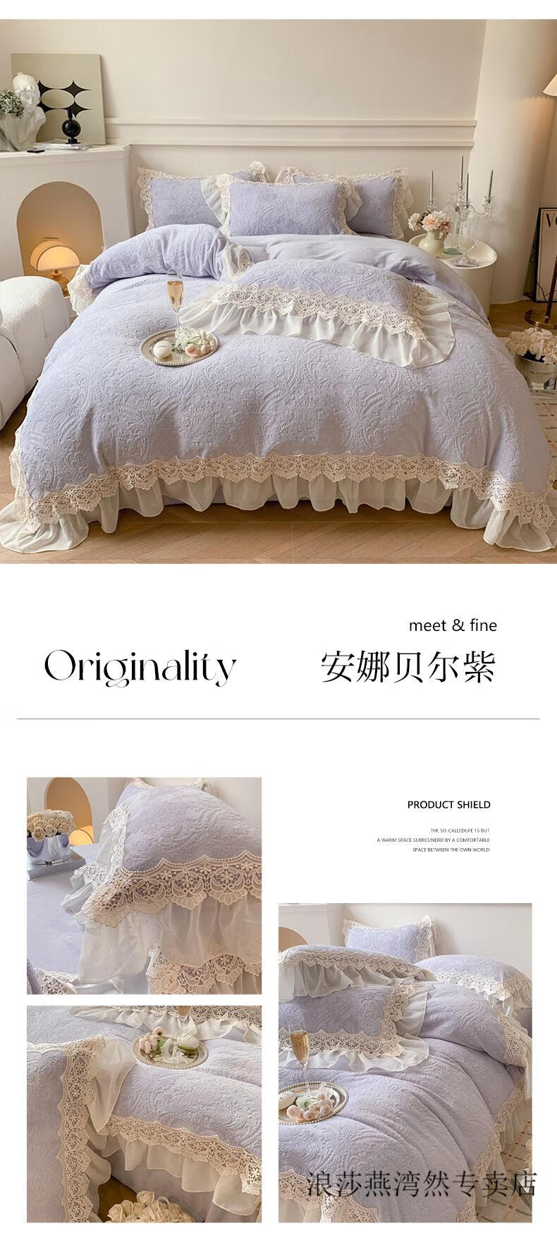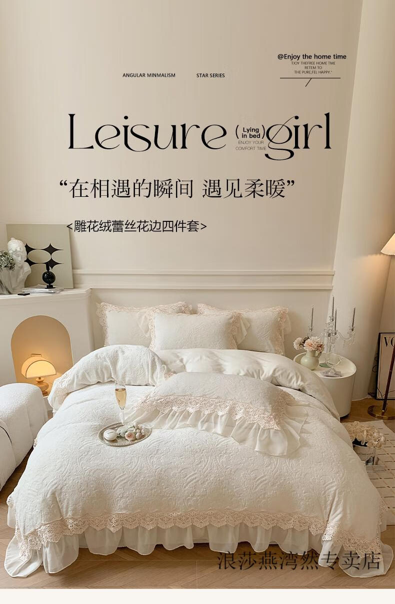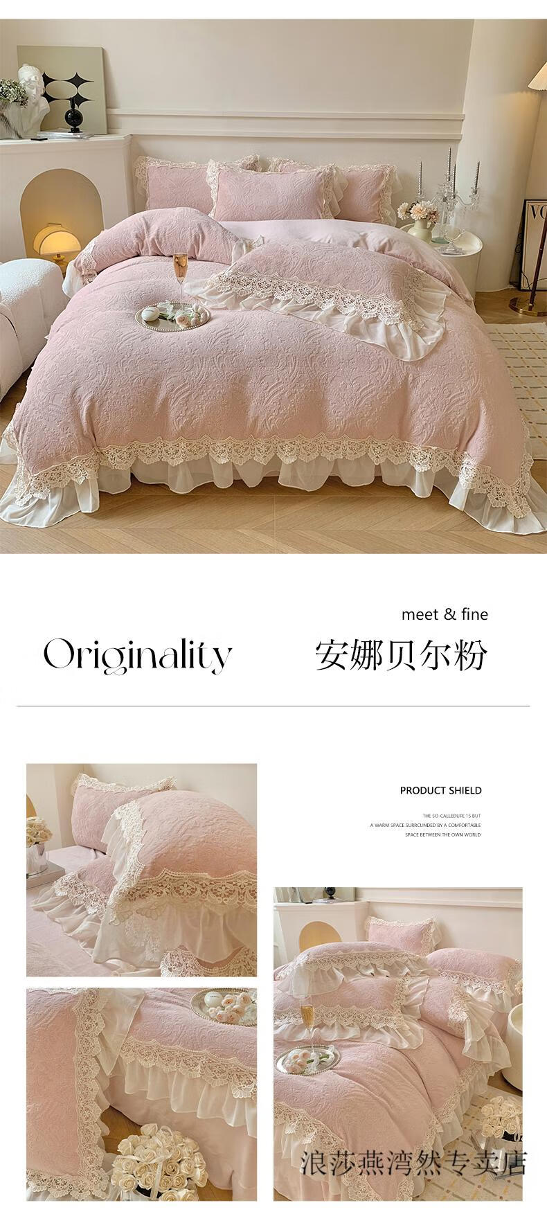 Langsha 2025 autumn and winter new thickened carved velvet baby velvet Annabell series French double-layer lace four-piece set Annabell pink bed sheet style 1.5m four-piece set