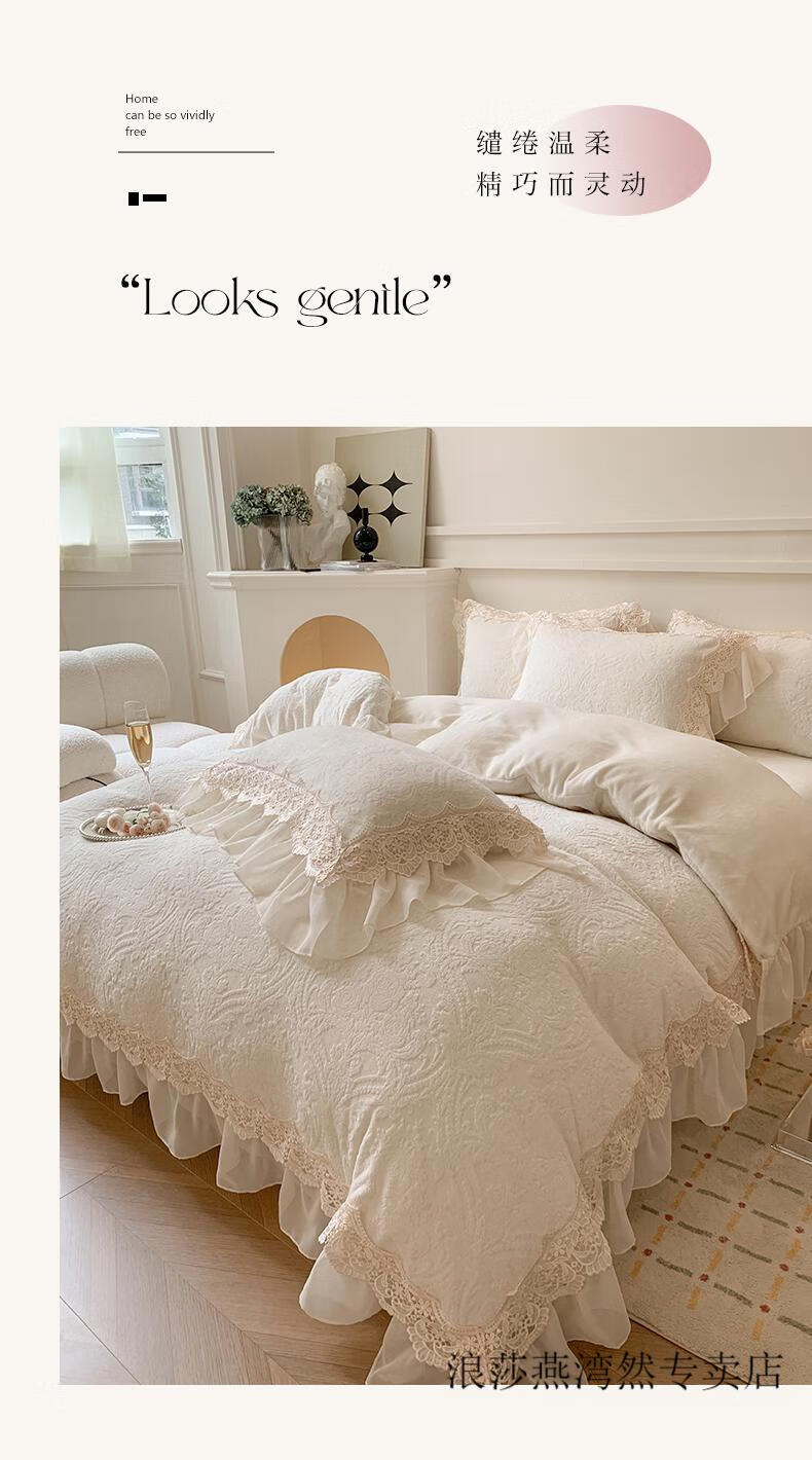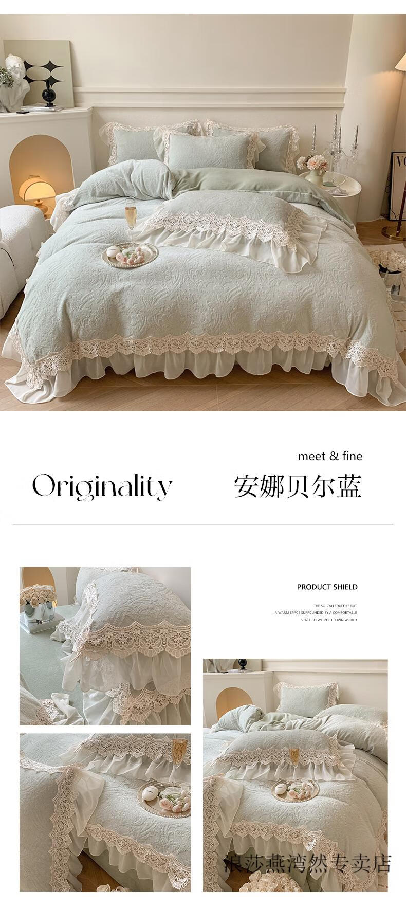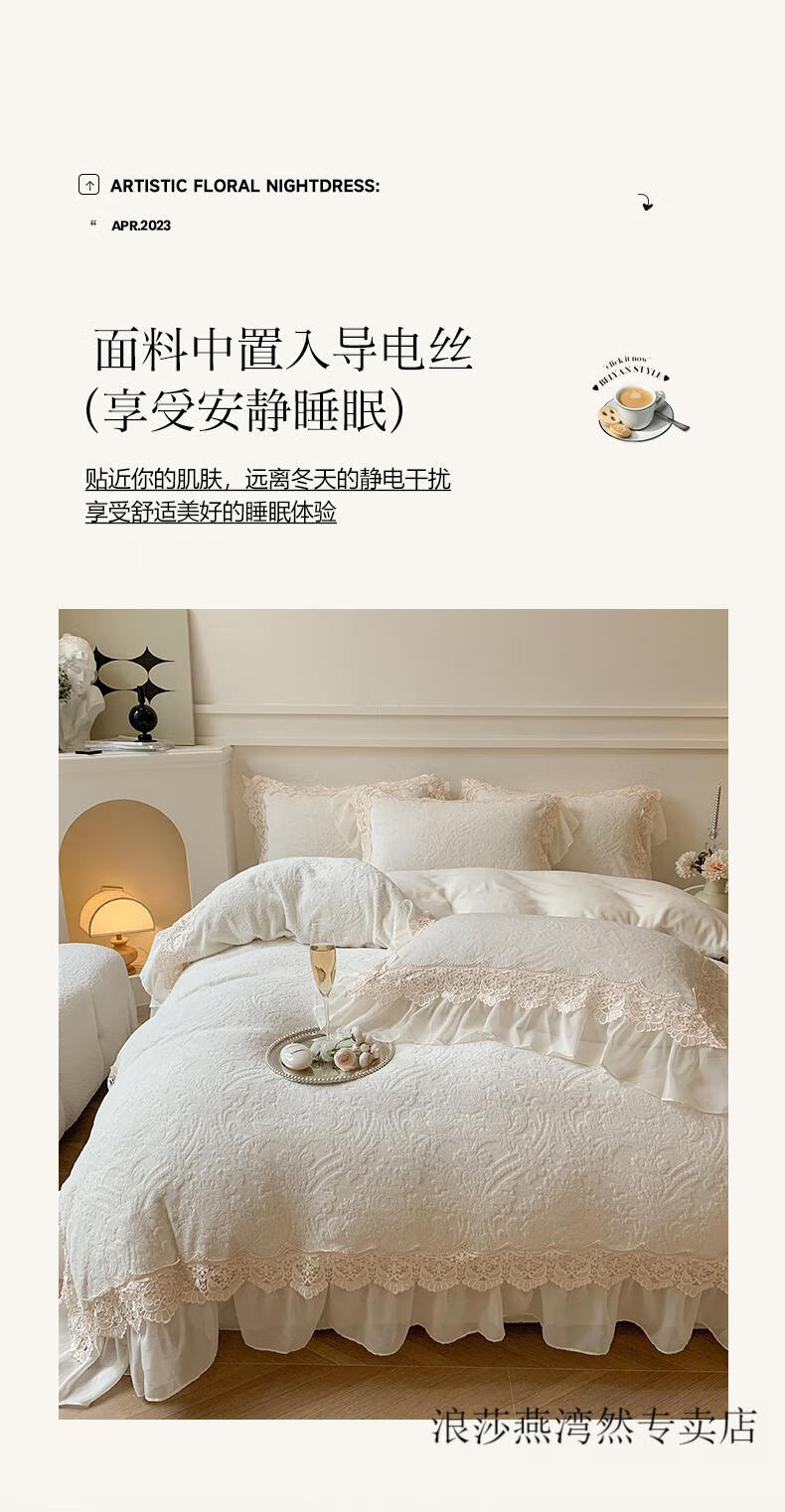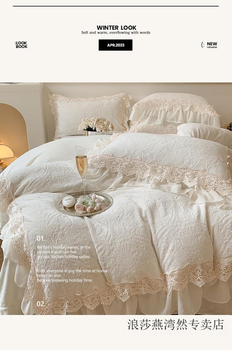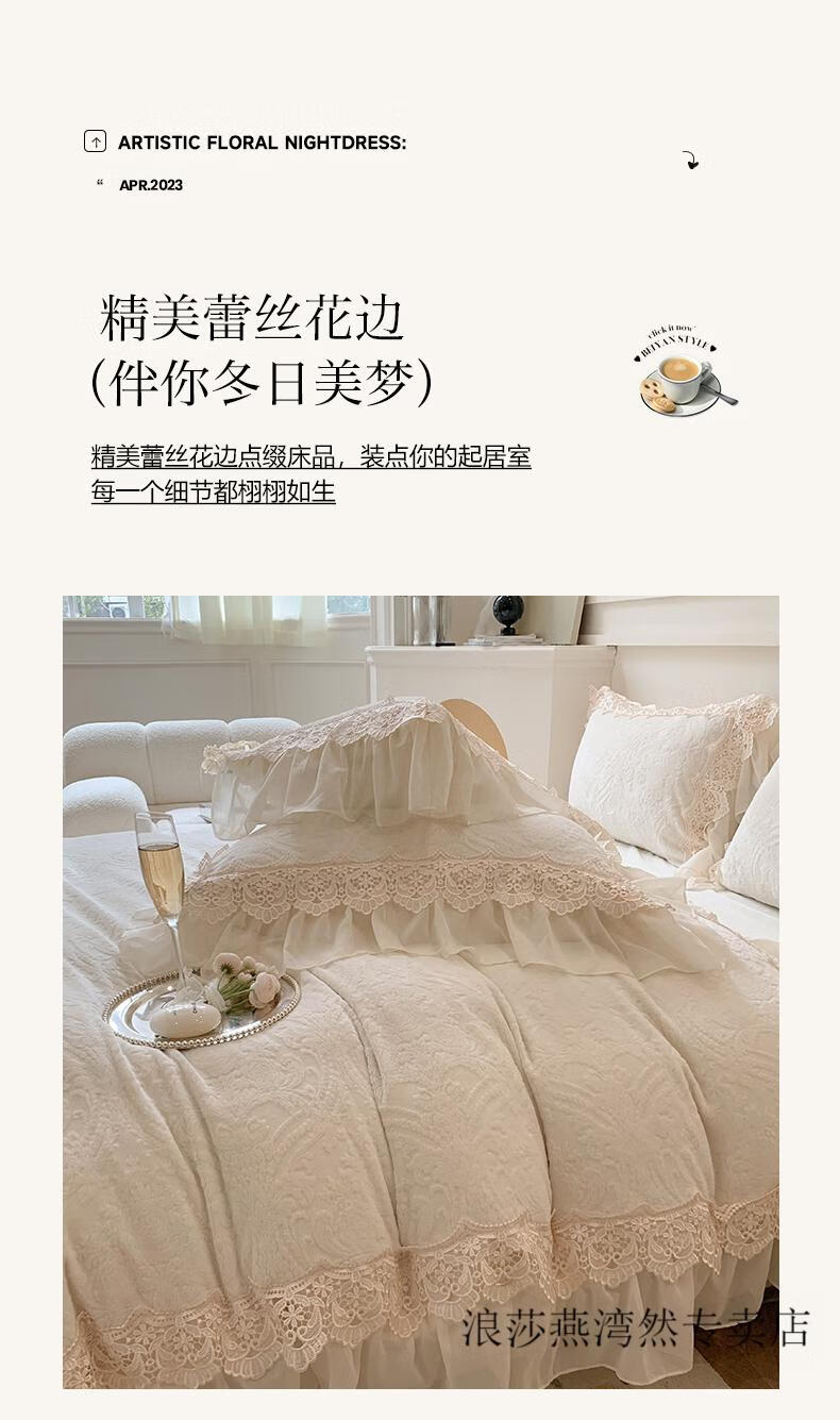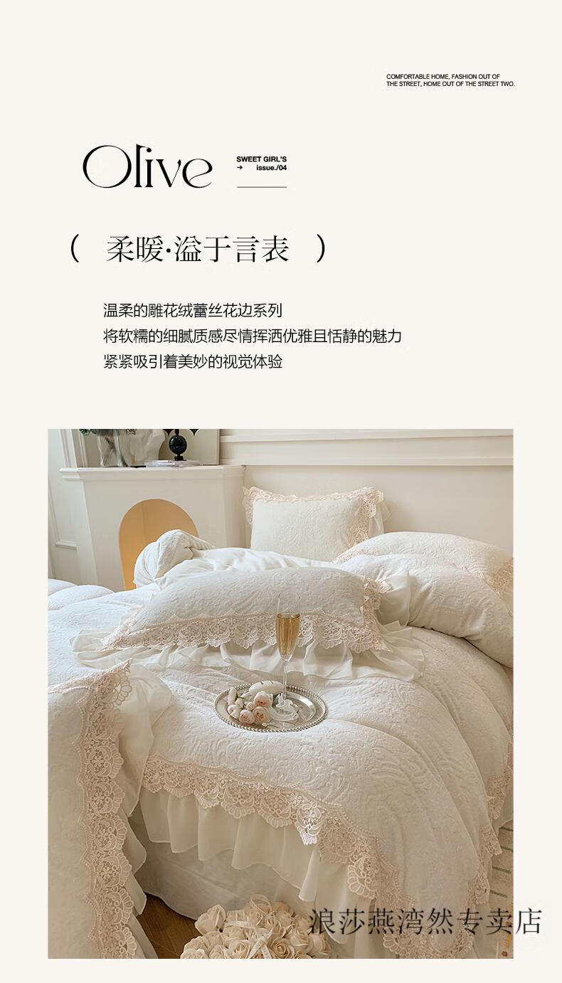 Langsha 2025 autumn and winter new thickened carved velvet baby velvet Annabell series French double-layer lace four-piece set Annabell pink bed sheet style 1.5m four-piece set