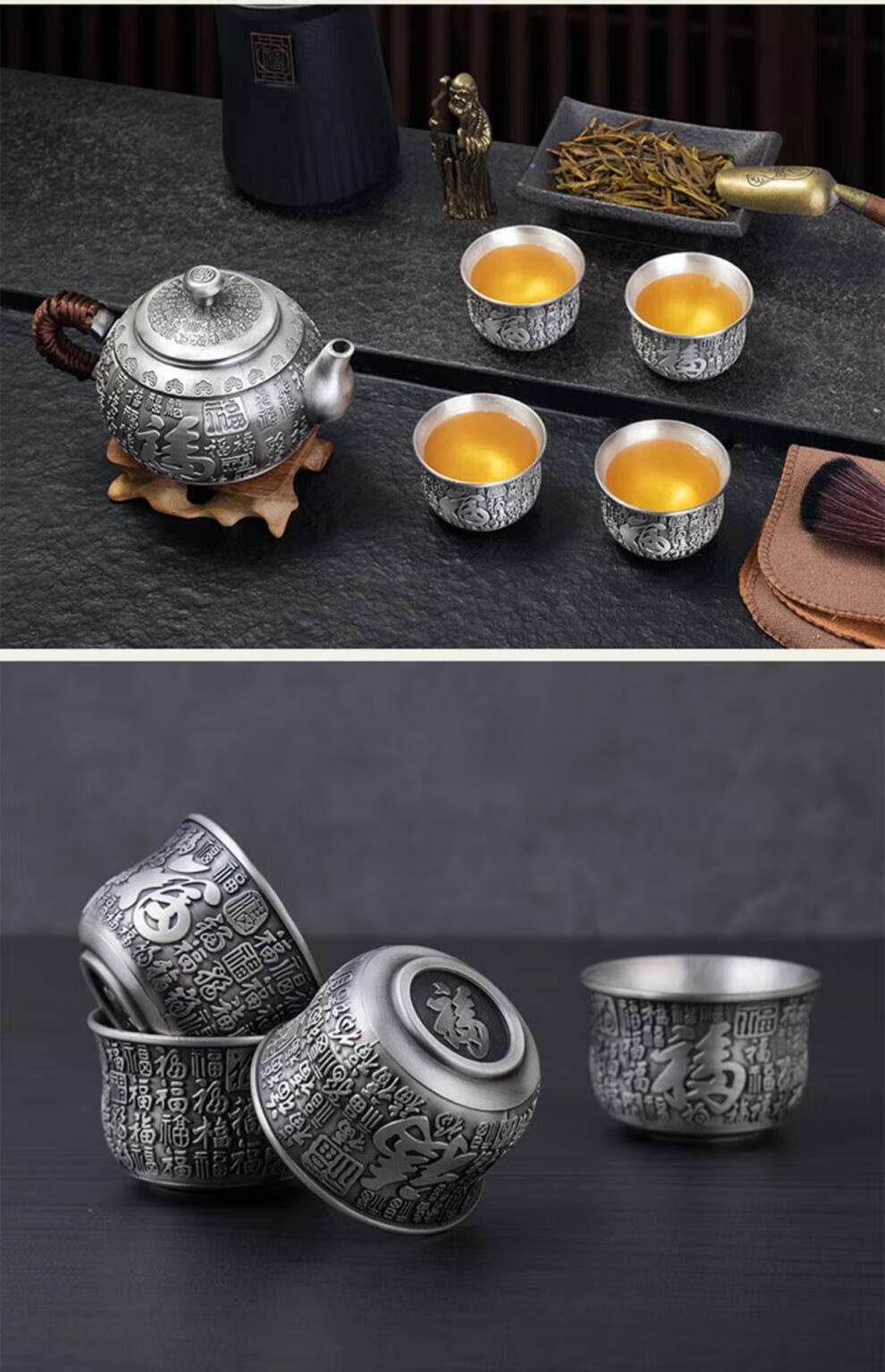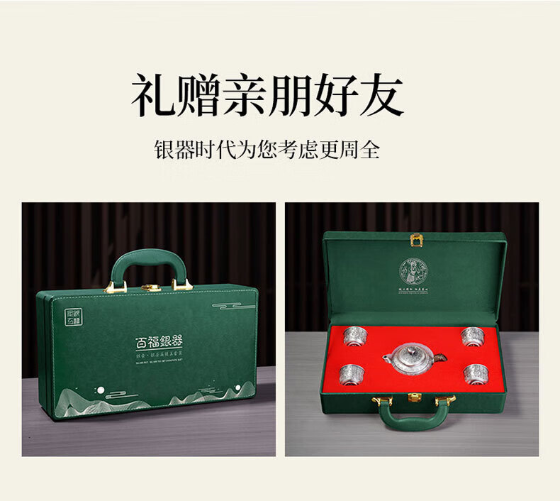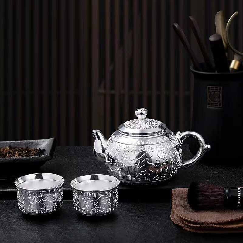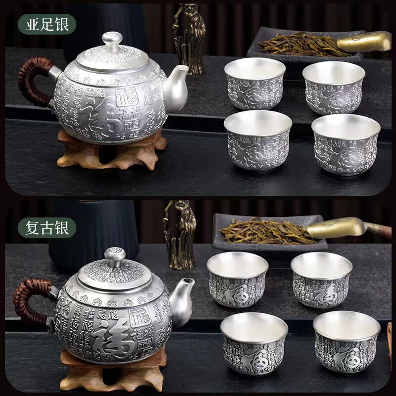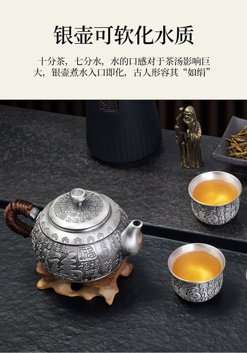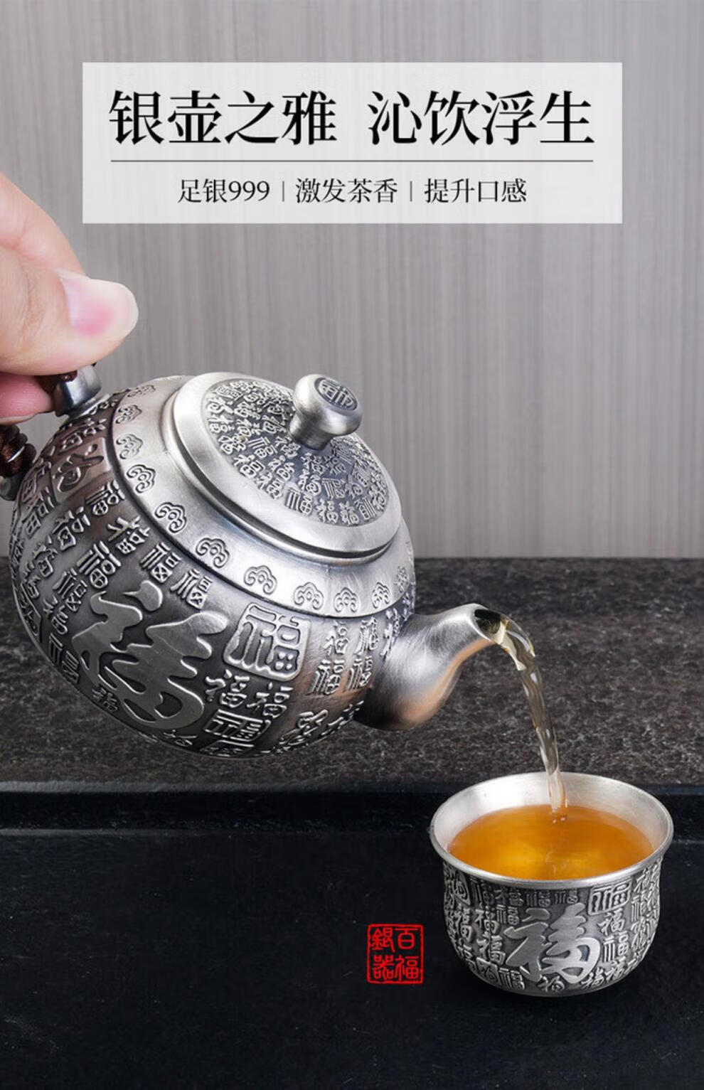 Fat Donglai same style pure silver tea set Baifu silver pot home 999 silver tea cup creative sterling silver gift kettle set (bright silver) brown high-end leather box 5 pieces