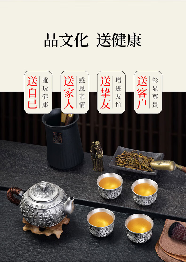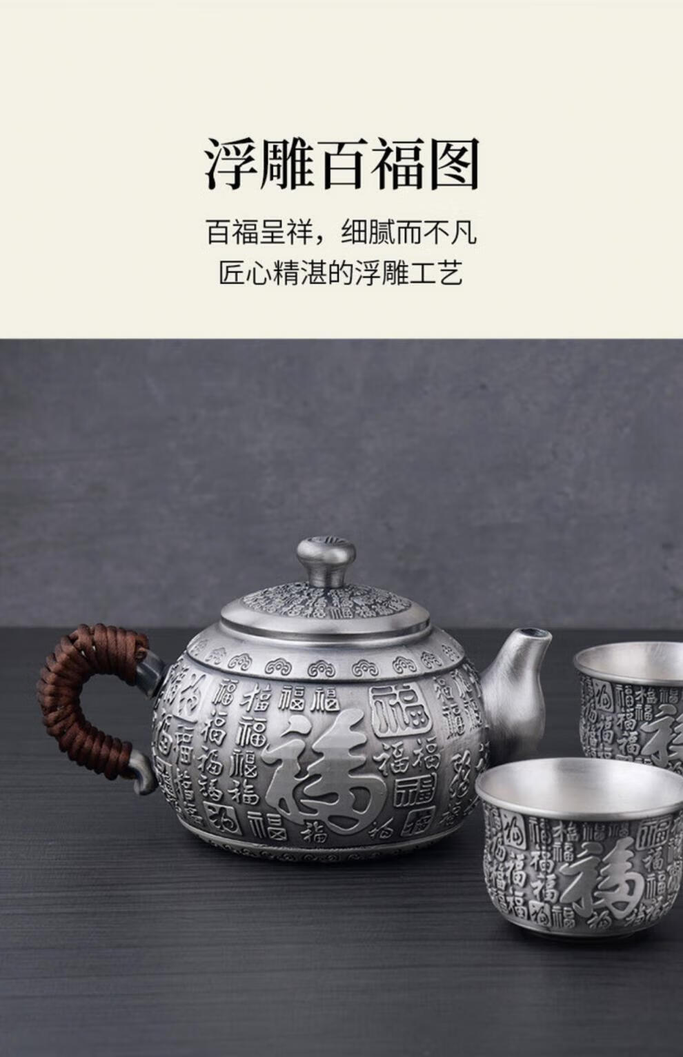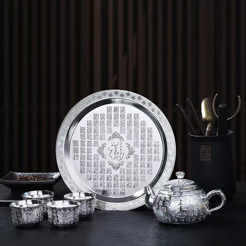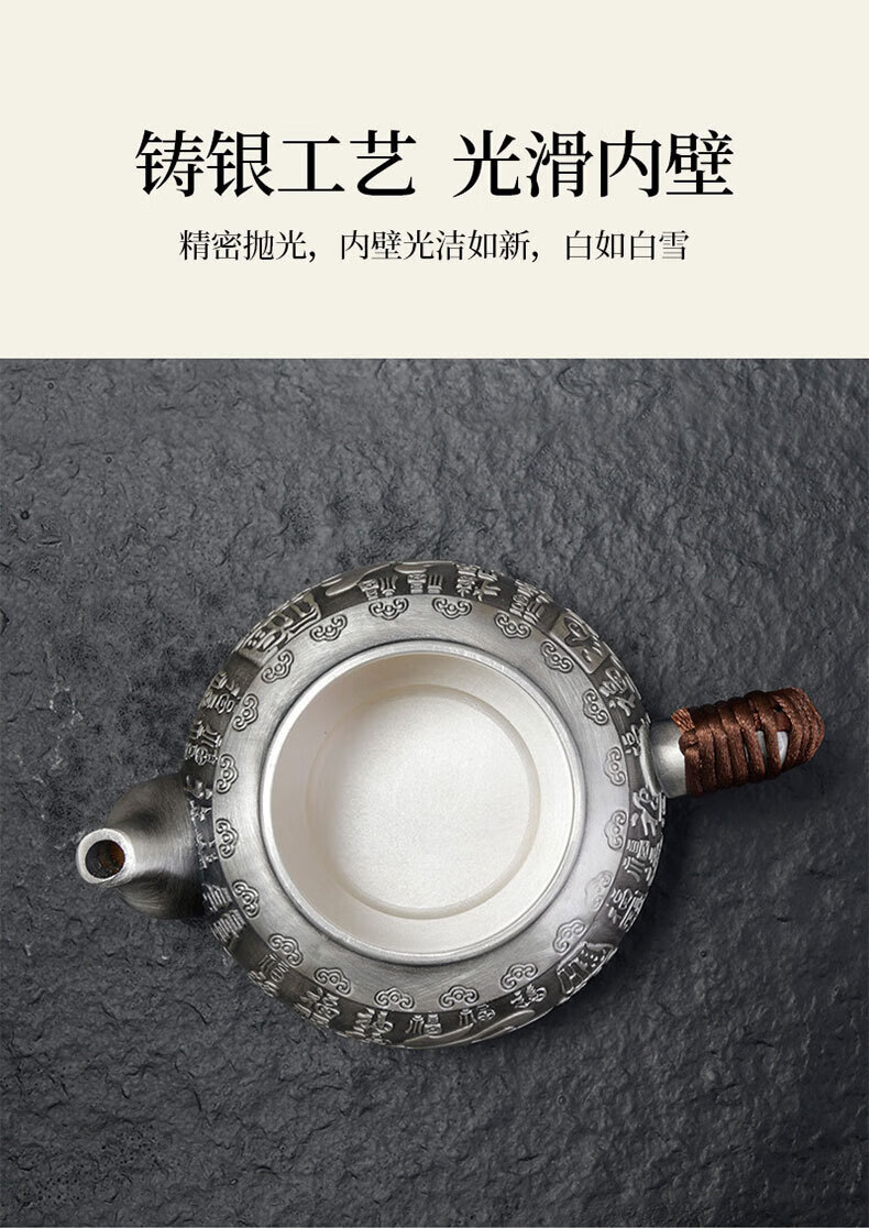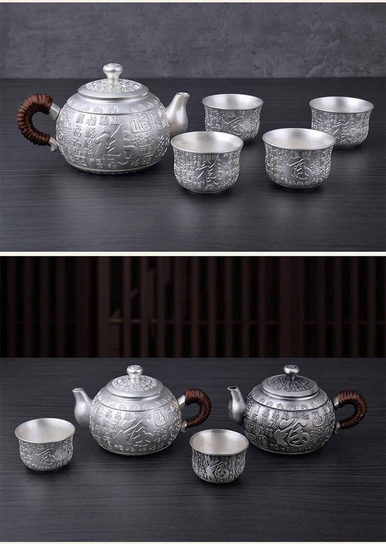 Fat Donglai same style pure silver tea set Baifu silver pot home 999 silver tea cup creative sterling silver gift kettle set (bright silver) brown high-end leather box 5 pieces