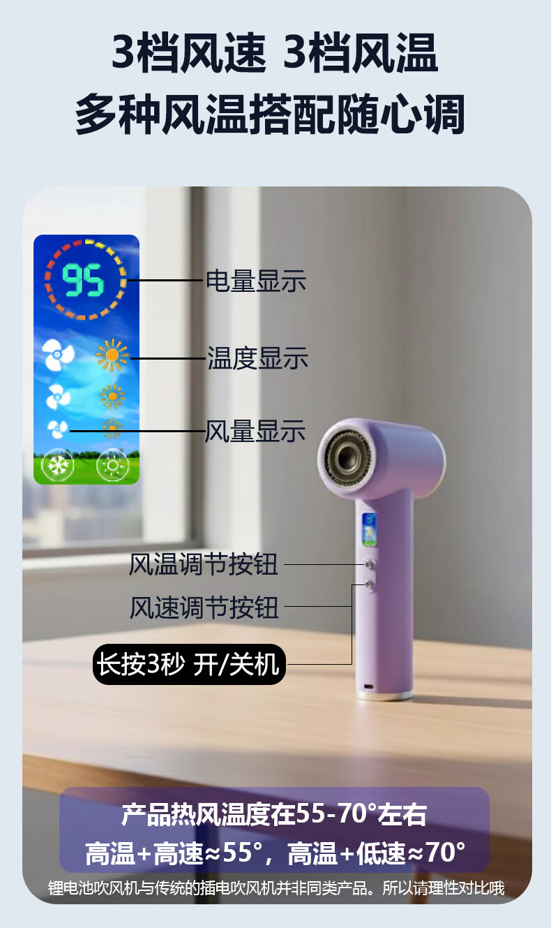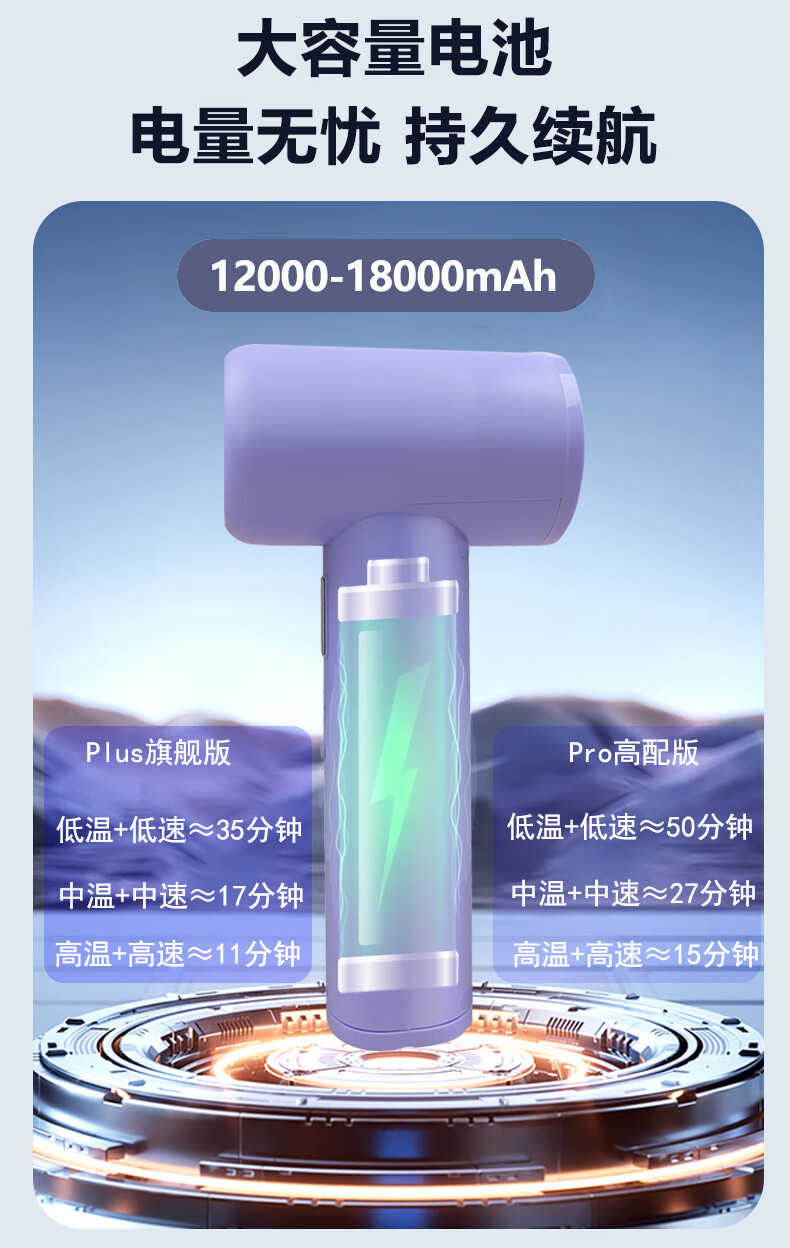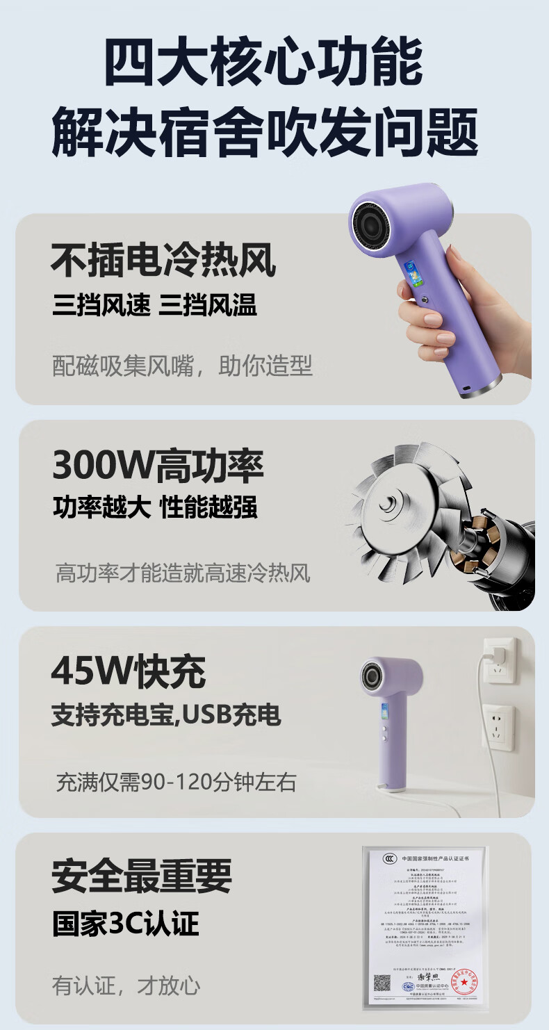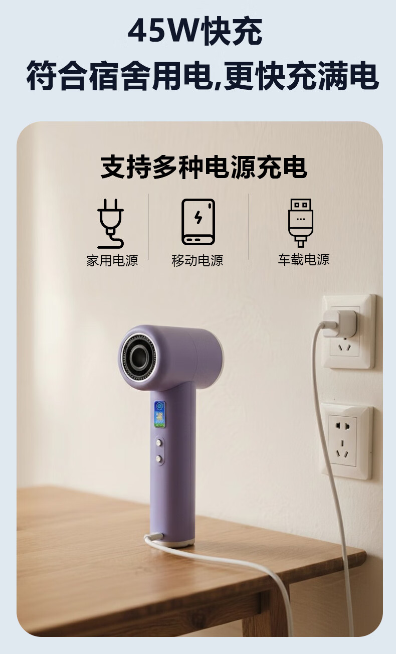 Wireless hair dryer for student dormitories, low power rechargeable hair dryer, USB rechargeable hair dryer, portable constant temperature, quick drying, unplugged, high wind power, high speed hot and cold air PLUS flagship version 45W super fast charge + LCD display