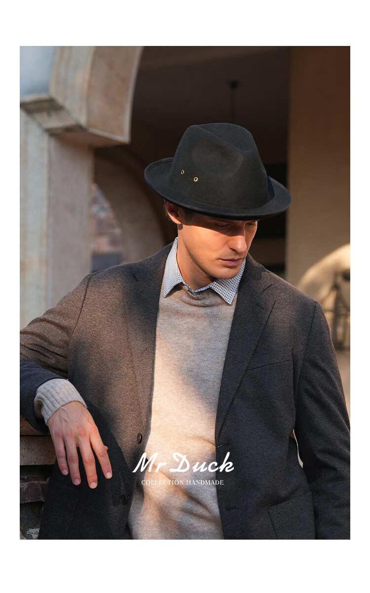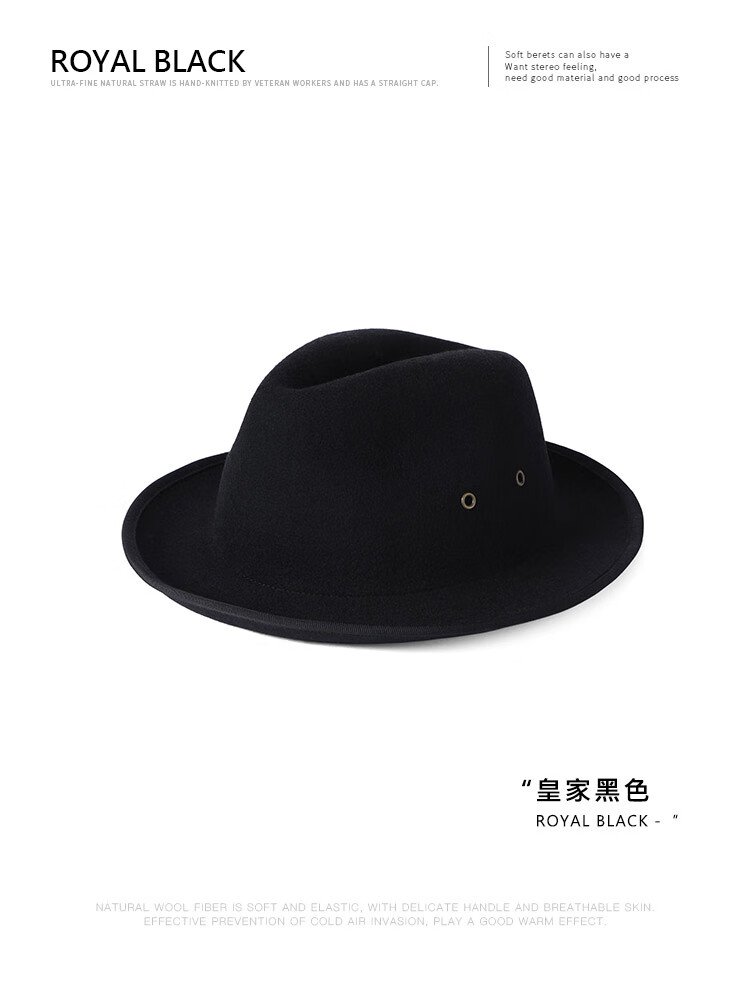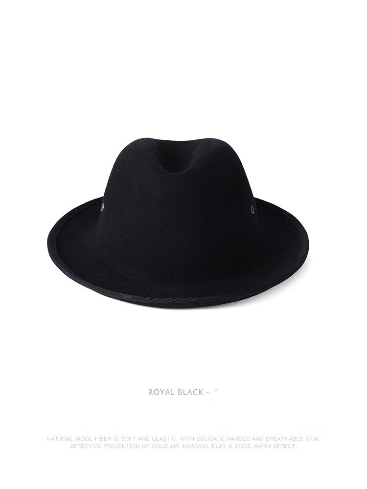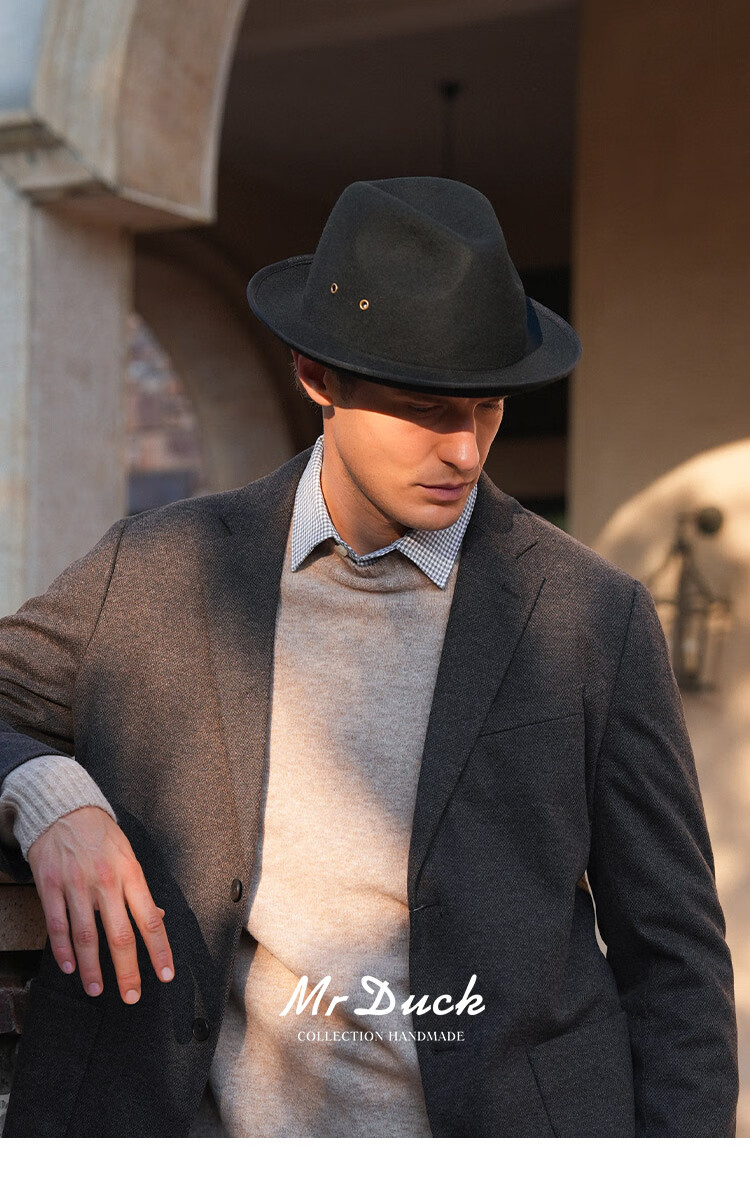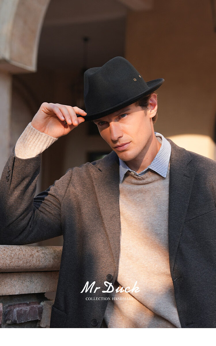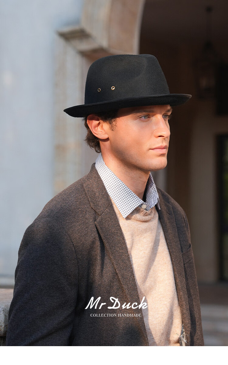 Mr DUCK Australian pure wool handmade top hat rolled edge foldable casual high-end jazz hat for men, warm and breathable in autumn and winter, royal black (top hat) M (suitable for 56-57cm head circumference)