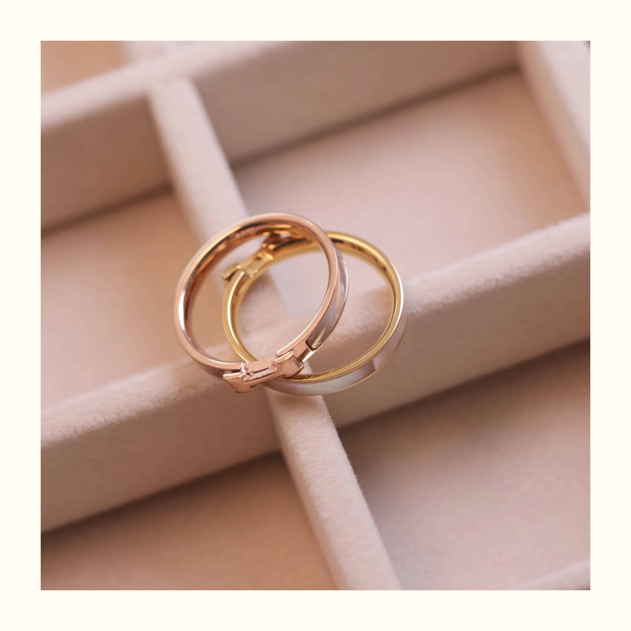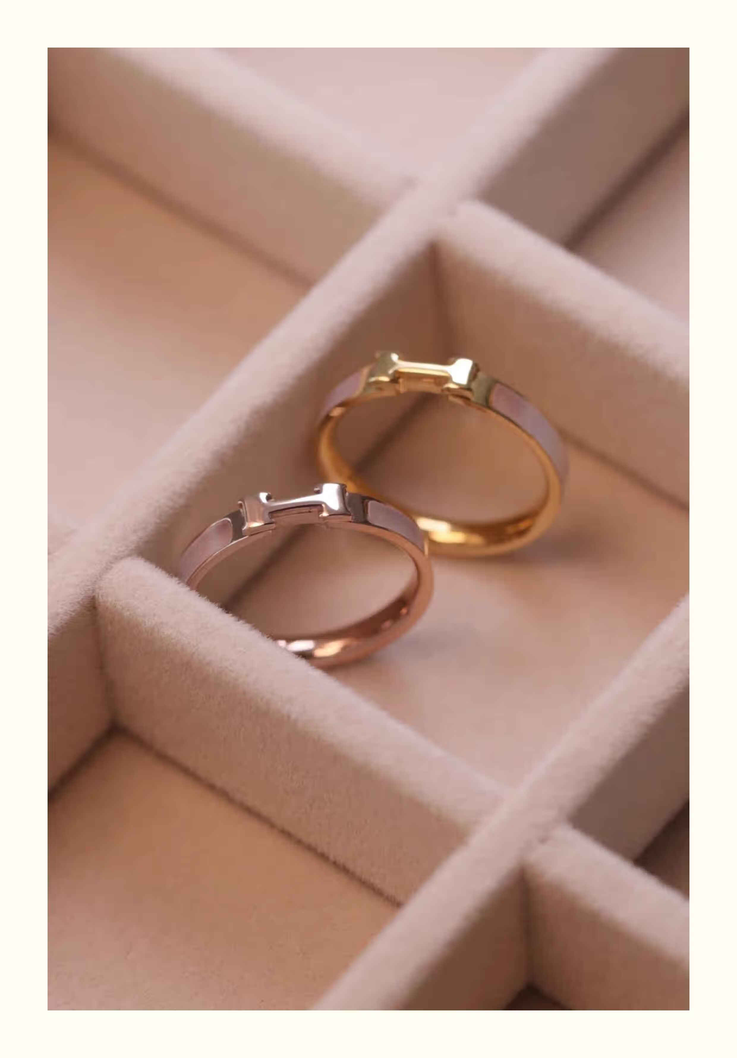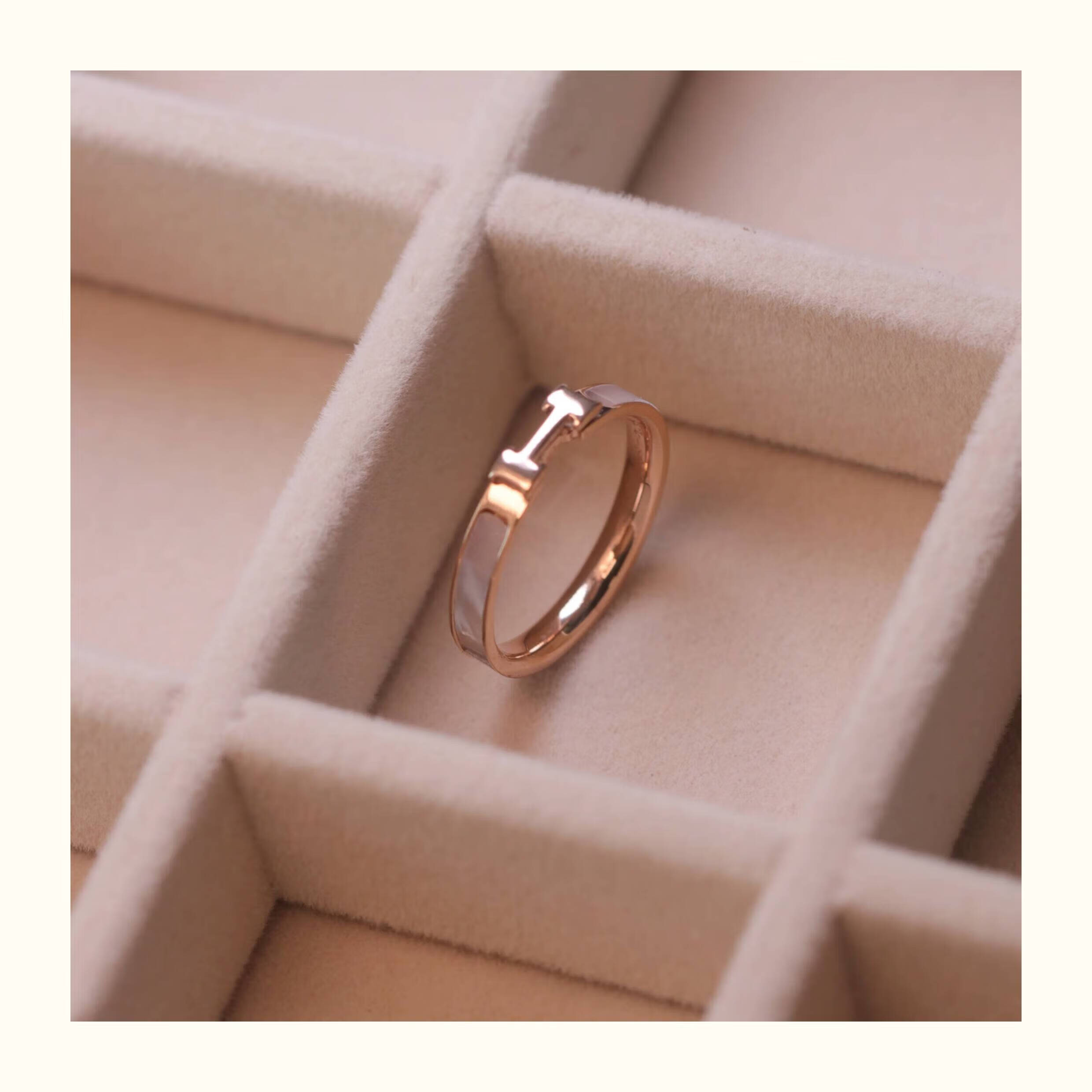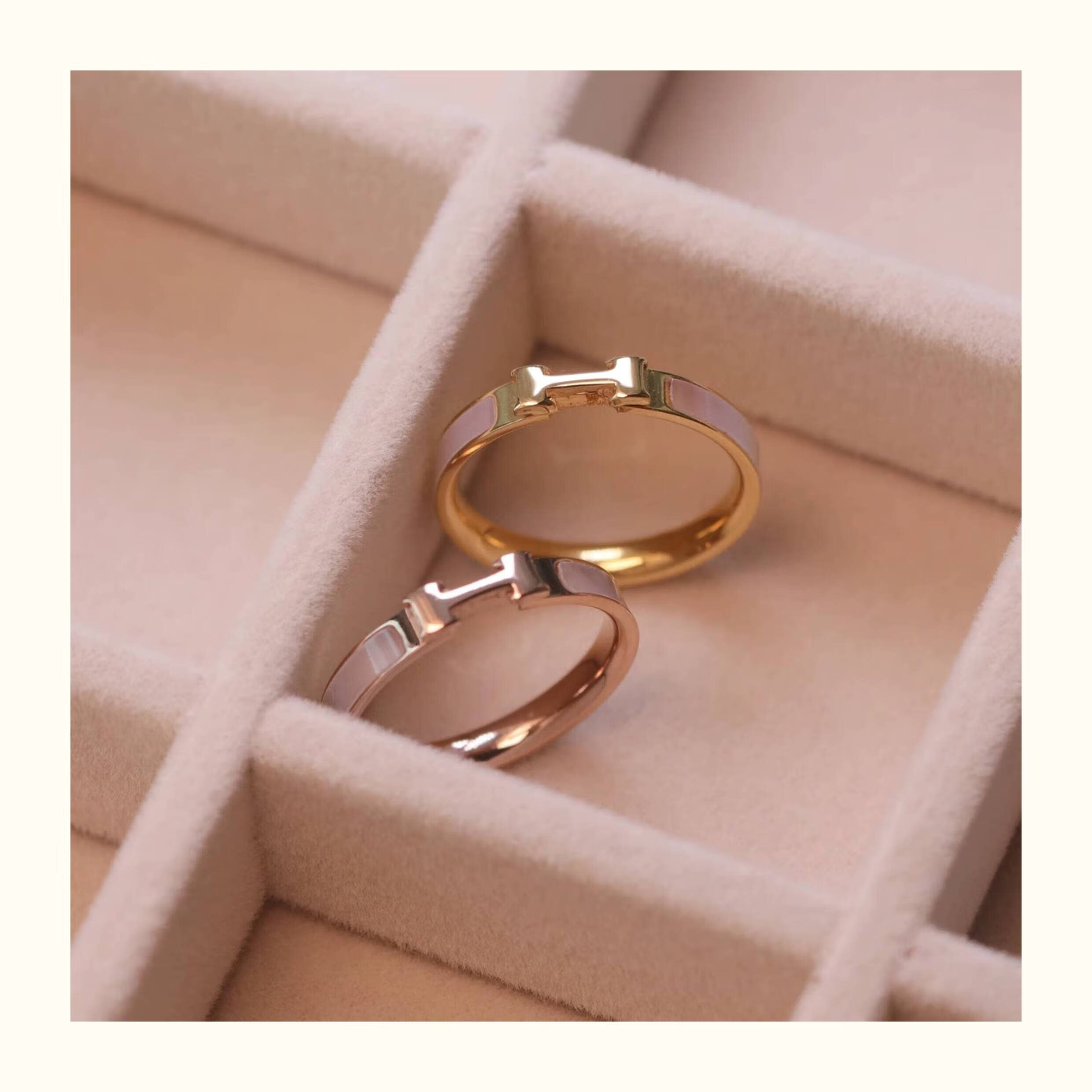 Ningfeng old phoenix-like internet celebrity letter H with a design-like I-shaped mother-of-pearl titanium-plated steel ring for women that won’t fall off, rose gold, No. 7