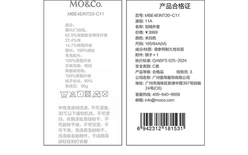MO&Co. Down Jacket 90 Duck Down Windproof and Breathable Light and Warm Roaming Series Moanke Beige XS /155
