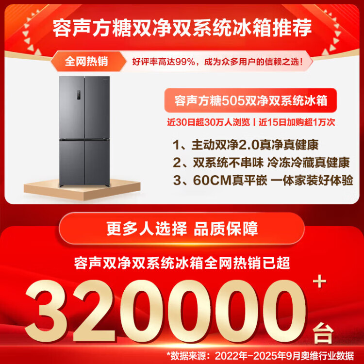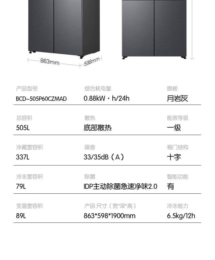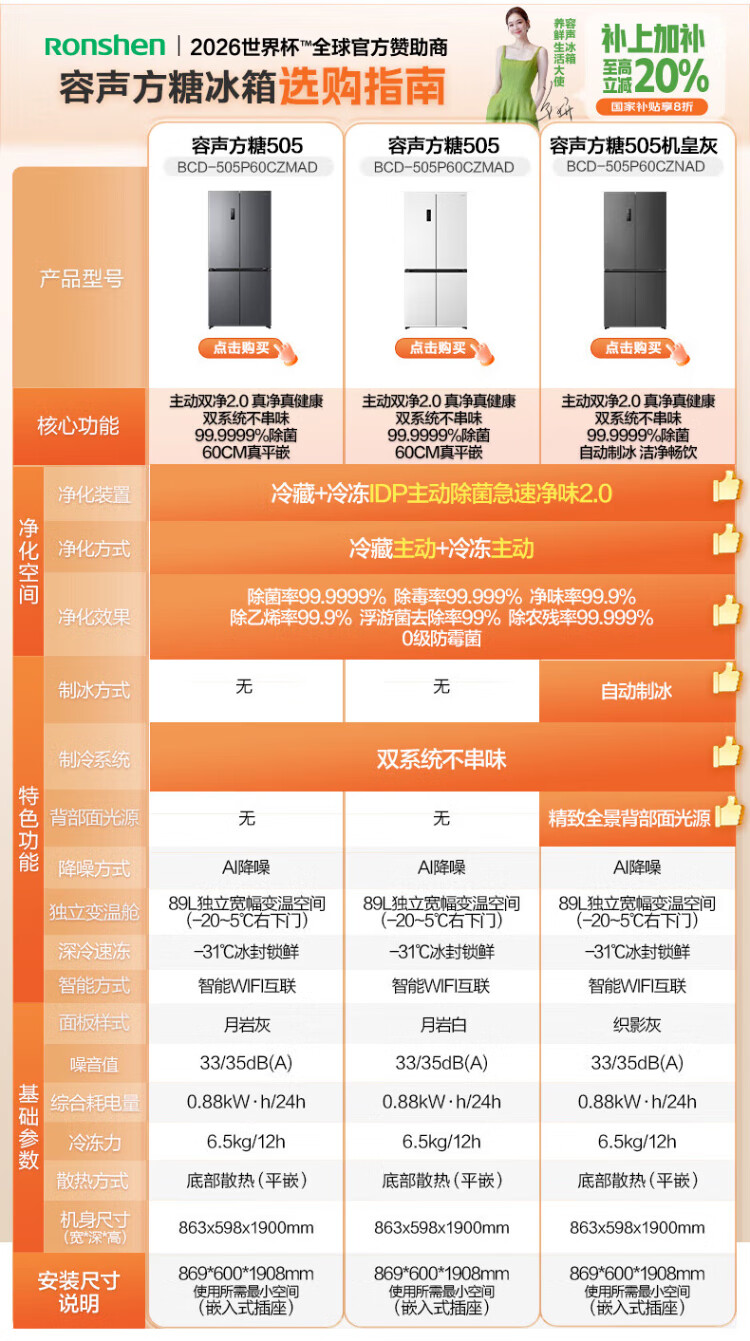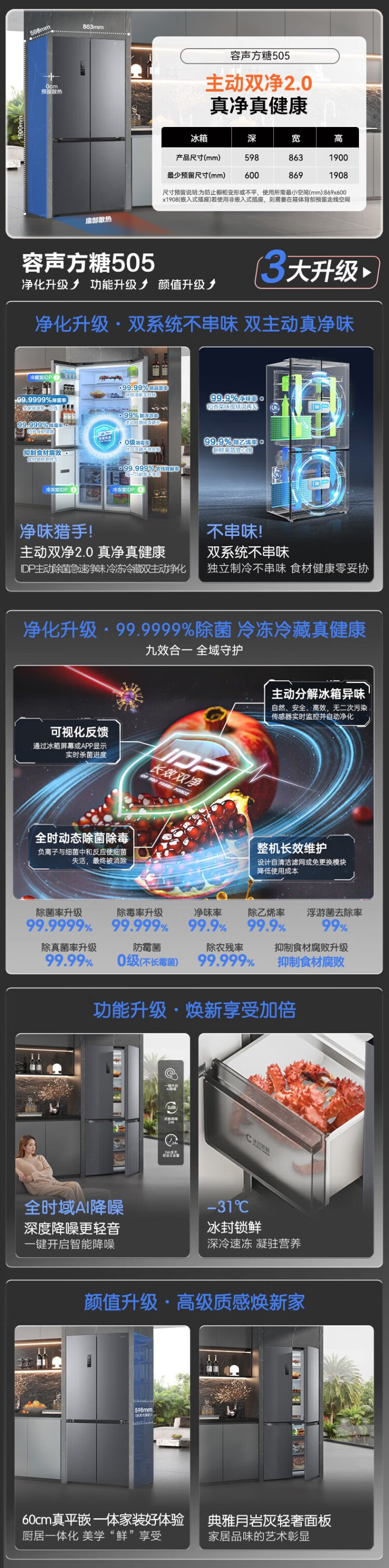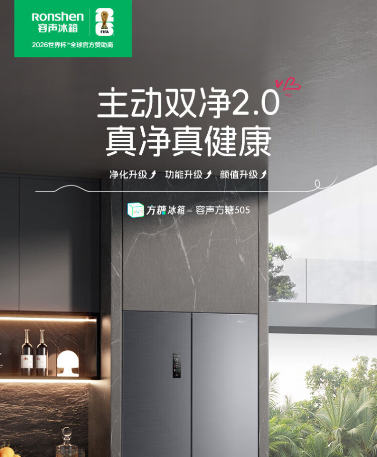Rongsheng Cube Sugar 505L Cross Door Refrigerator Dual System Dual Cycle Ultra-Thin Zero Embedded Active Sterilization Level One Energy Efficiency Gray BCD-505P60CZMAD National Subsidy World Cup Sugar Cube Series | Odor-Free Dual System | 505 Gray