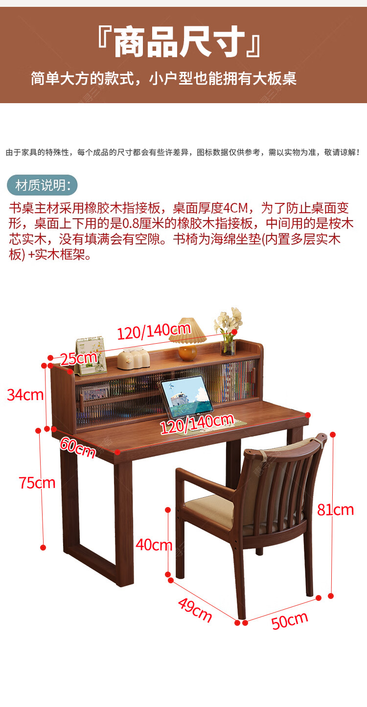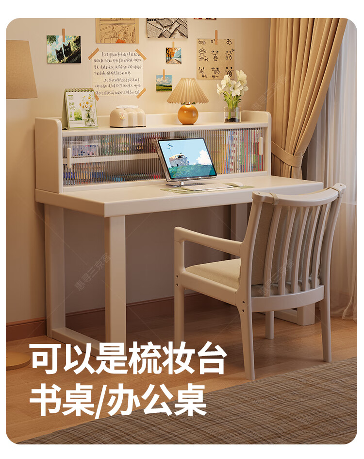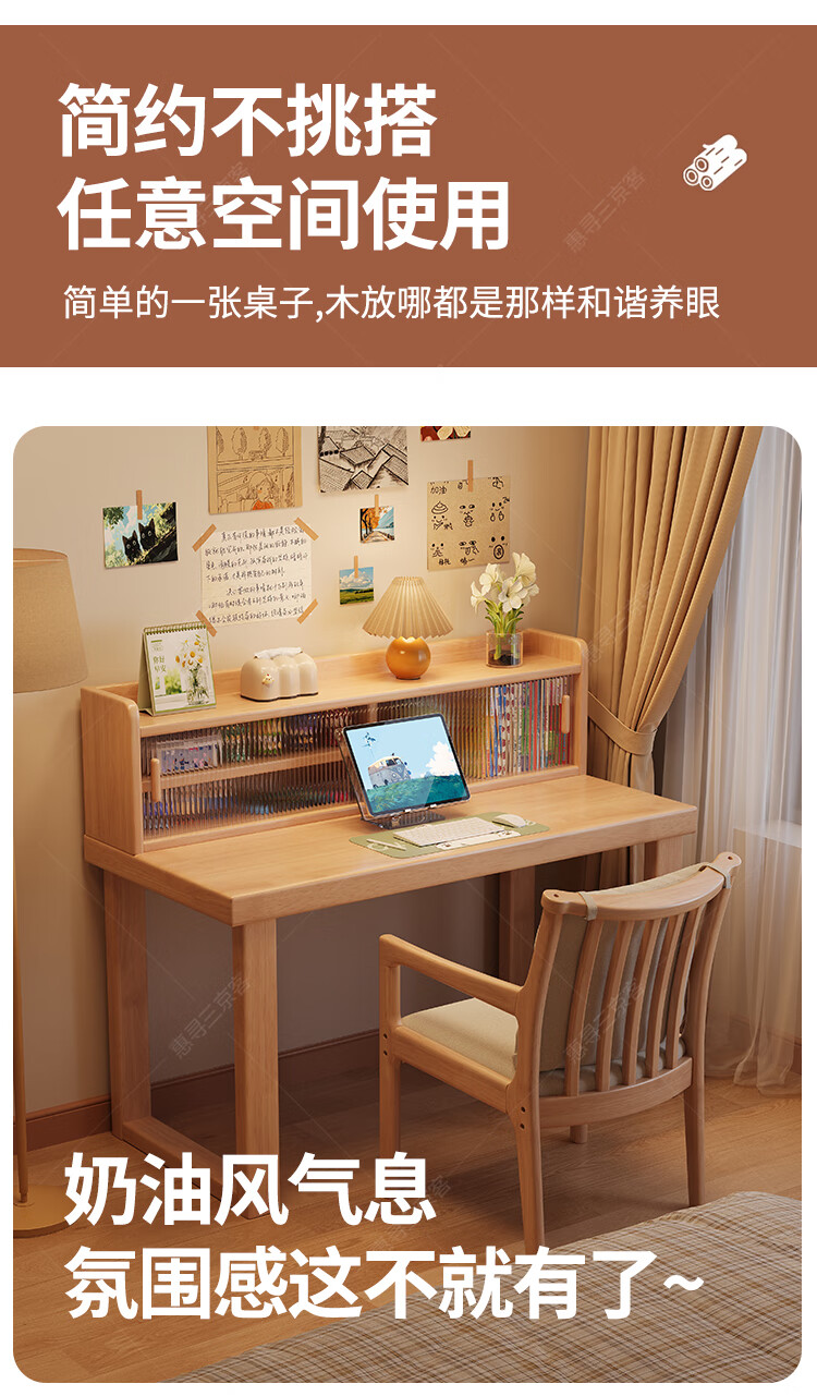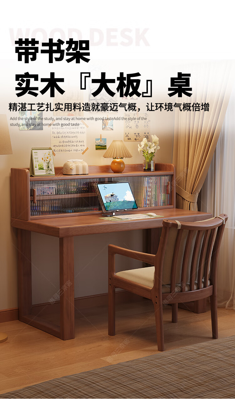 Huixun solid wood desk and bookshelf integrated bedroom simple computer desk home large board study table small apartment student writing desk ivory white #desk + bookshelf 120cm*60cm*75cm total height 109cm